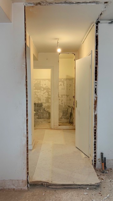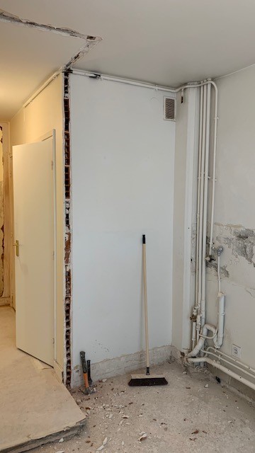 Photos avant et pendant travaux cuisine et salon sans verrière