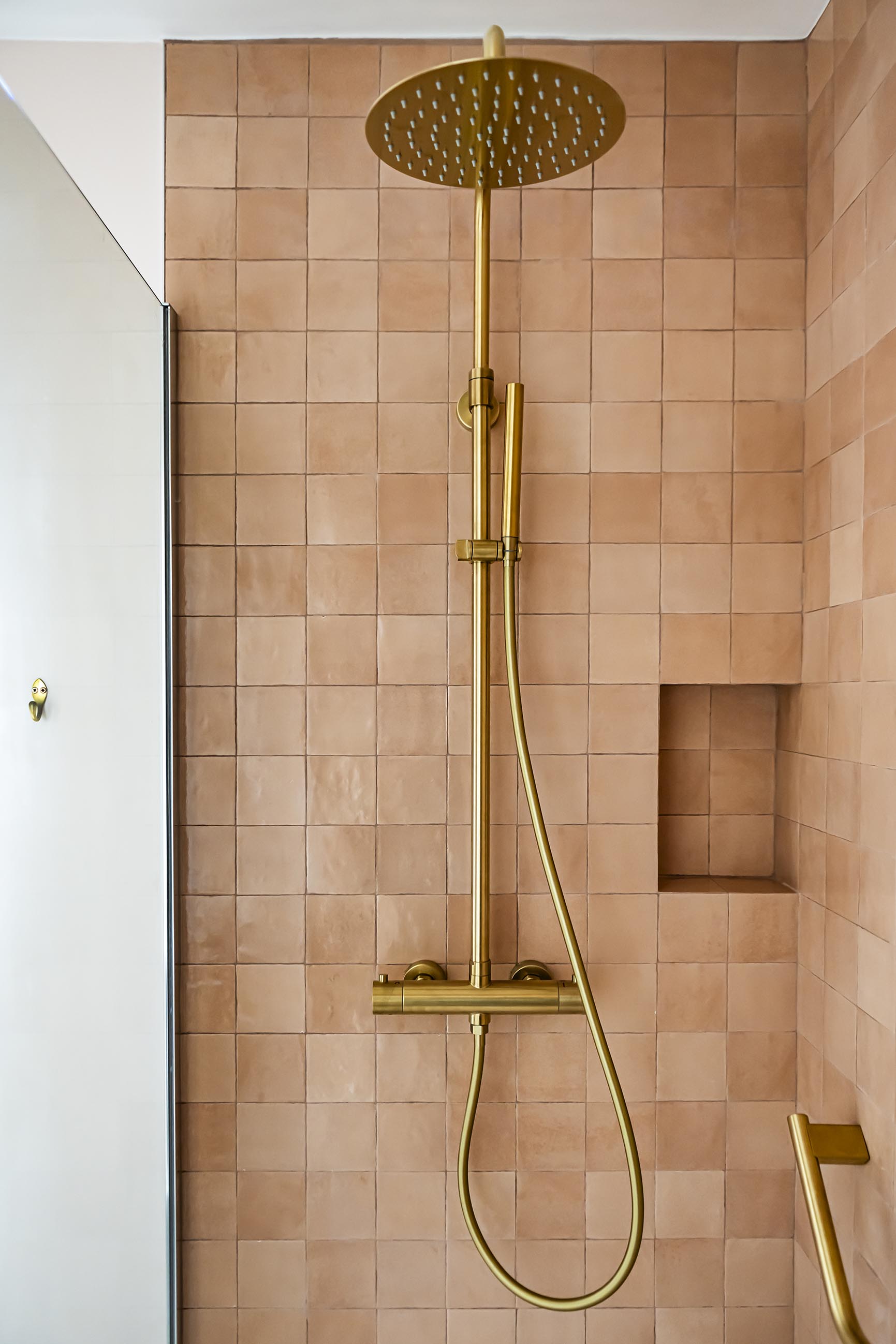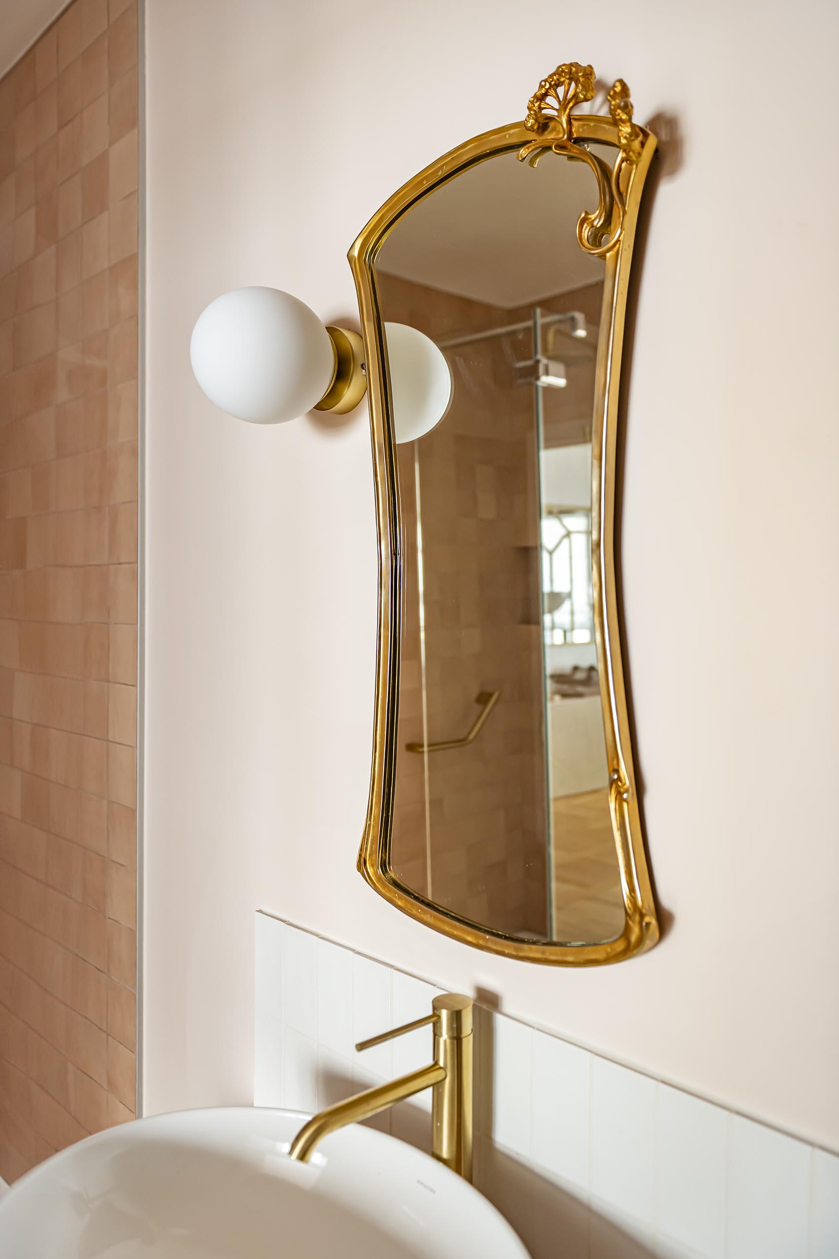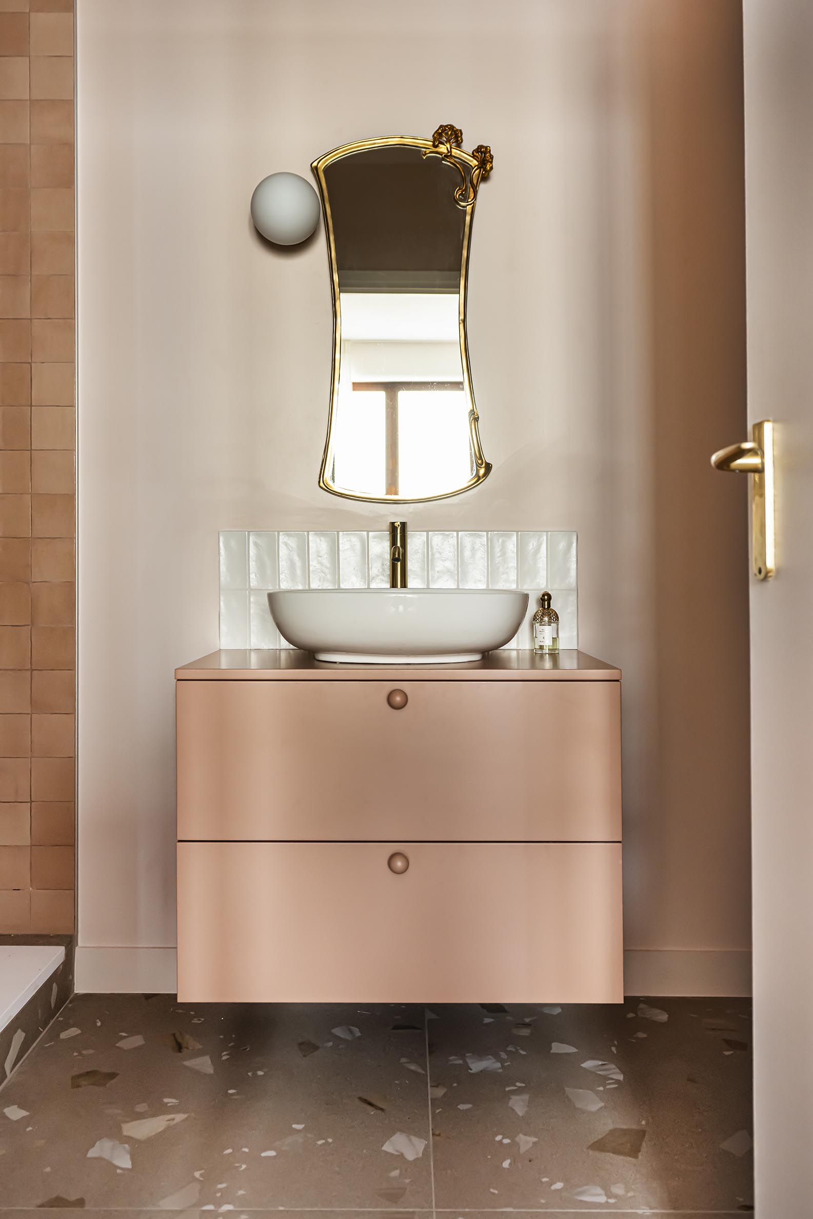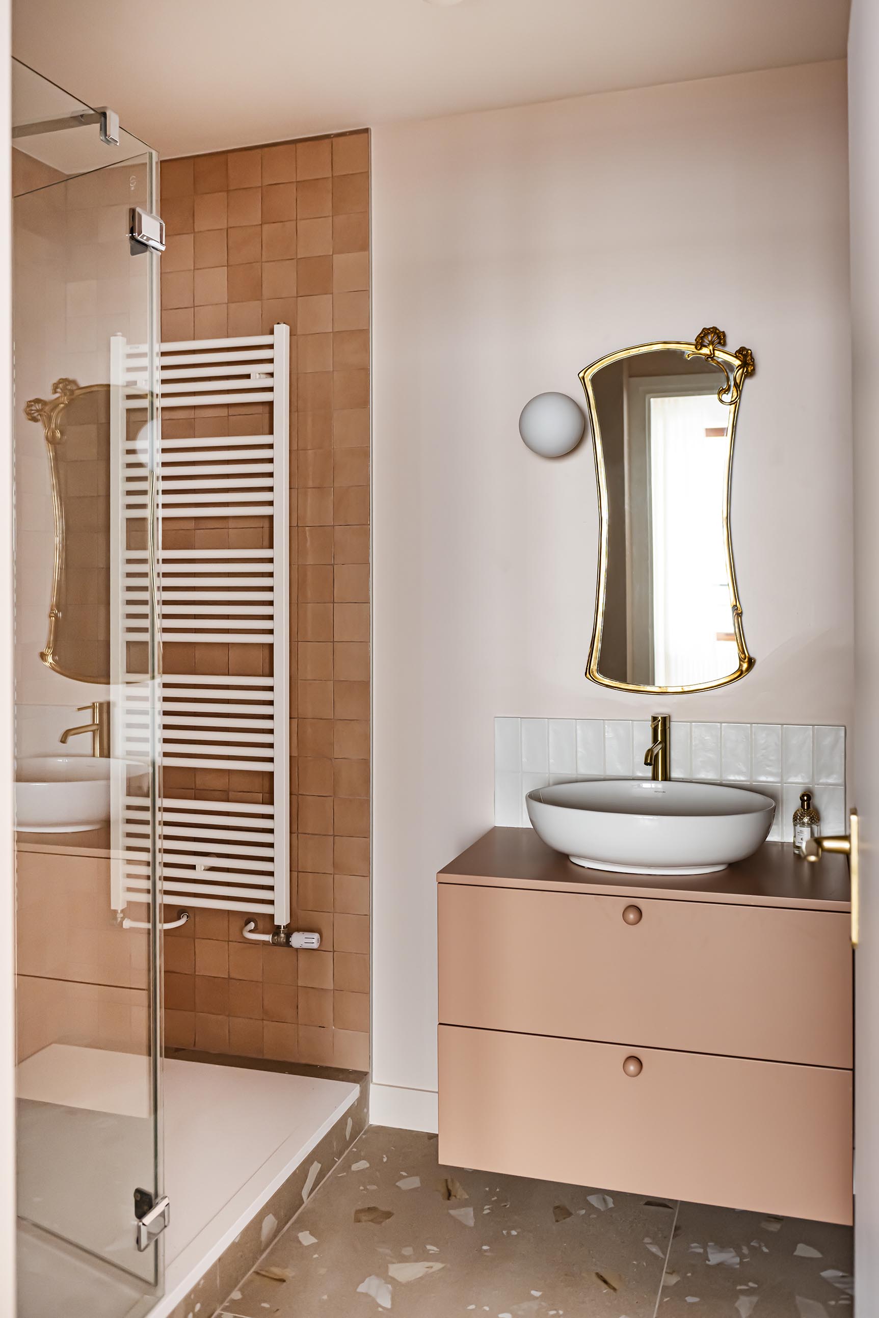 Pour la salle de bain, le brief de la cliente était : « Je rêve d’une salle de bain rose avec une très grande douche mais qui ne fasse ni Barbie, ni Barbapapa » ; voici son vœu exaucé avec un meuble vasque couleur argile, des carreaux effet zelliges terracotta clair et une peinture rose pâle ! Nous sommes partis du même sol que dans la cuisine pour conserver une unité dans ce petit appartement et le laiton s’est imposé avec ce miroir et ces petites patères qui rendent le projet unique et qui lui permettent de conserver ses repères.