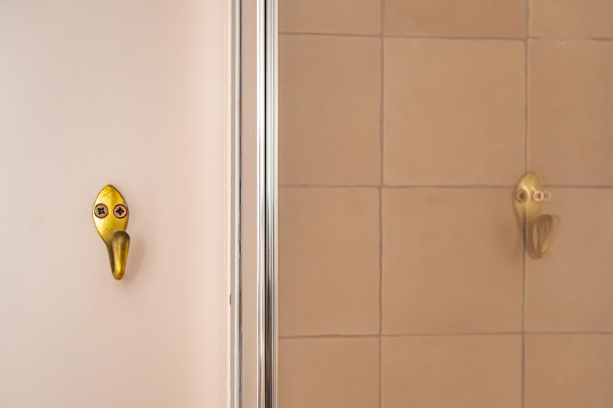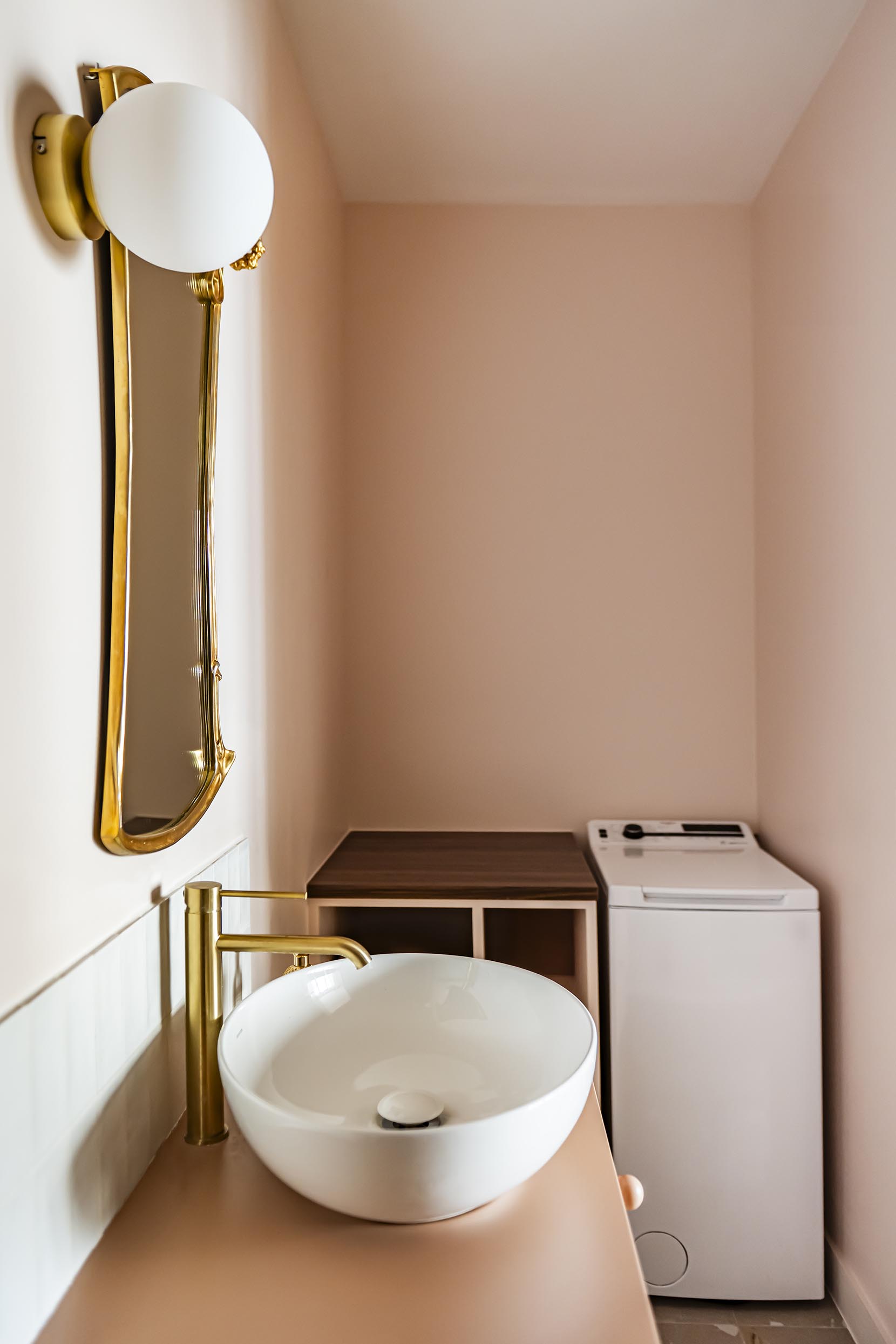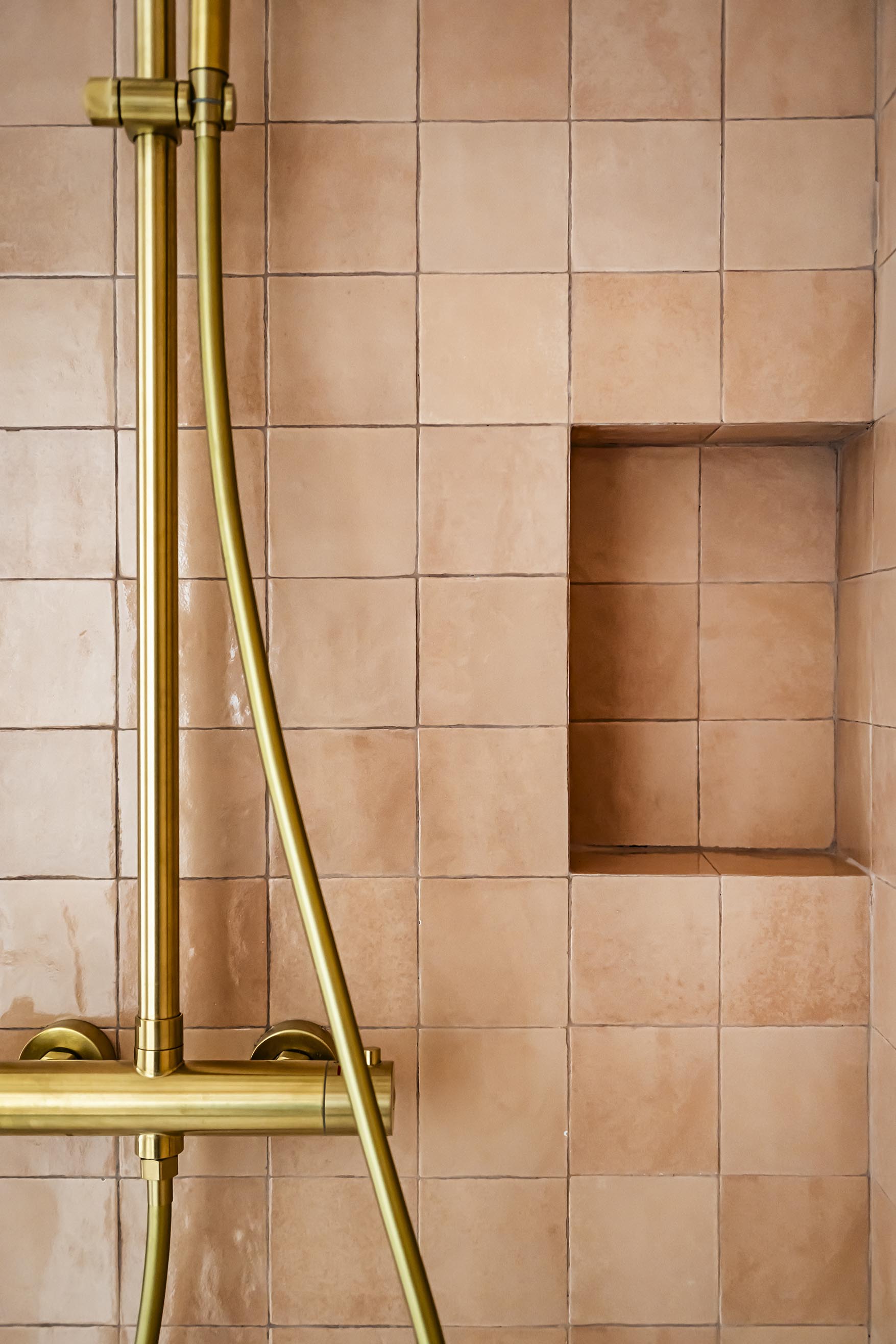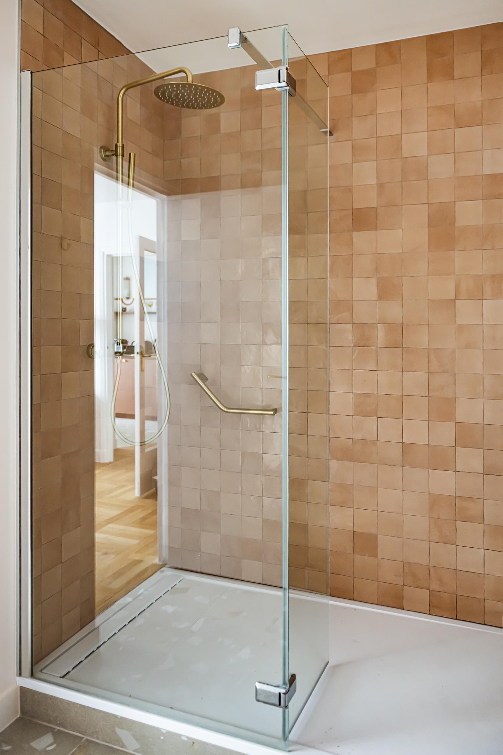 Pour la salle de bain, le brief de la cliente était : « Je rêve d’une salle de bain rose avec une très grande douche mais qui ne fasse ni Barbie, ni Barbapapa » ; voici son vœu exaucé avec un meuble vasque couleur argile, des carreaux effet zelliges terracotta clair et une peinture rose pâle ! Nous sommes partis du même sol que dans la cuisine pour conserver une unité dans ce petit appartement et le laiton s’est imposé avec ce miroir et ces petites patères qui rendent le projet unique et qui lui permettent de conserver ses repères.