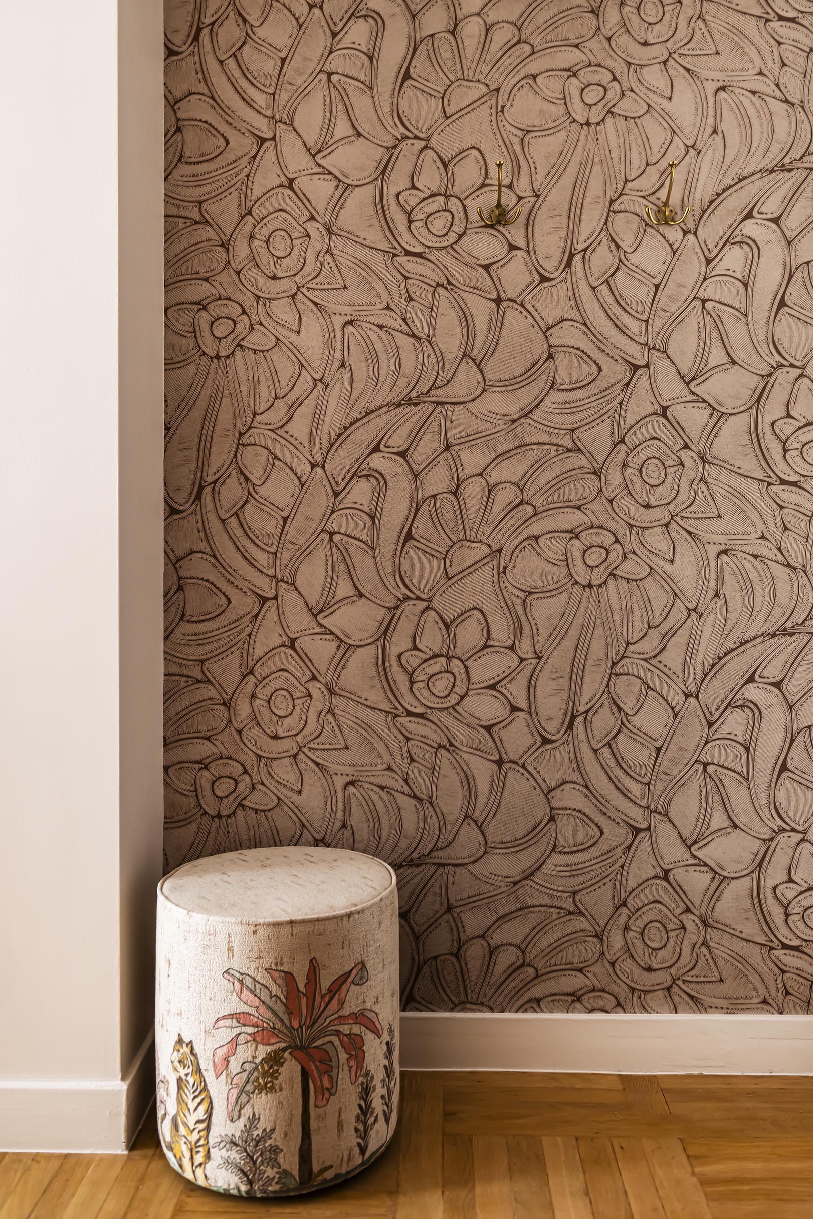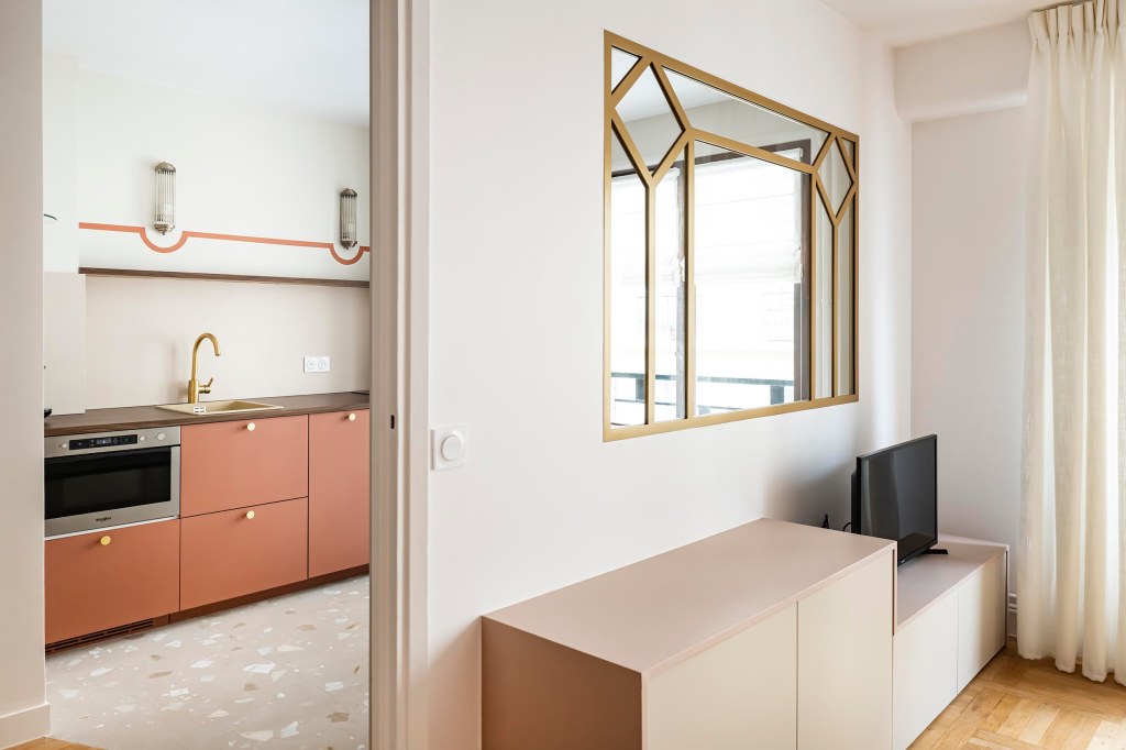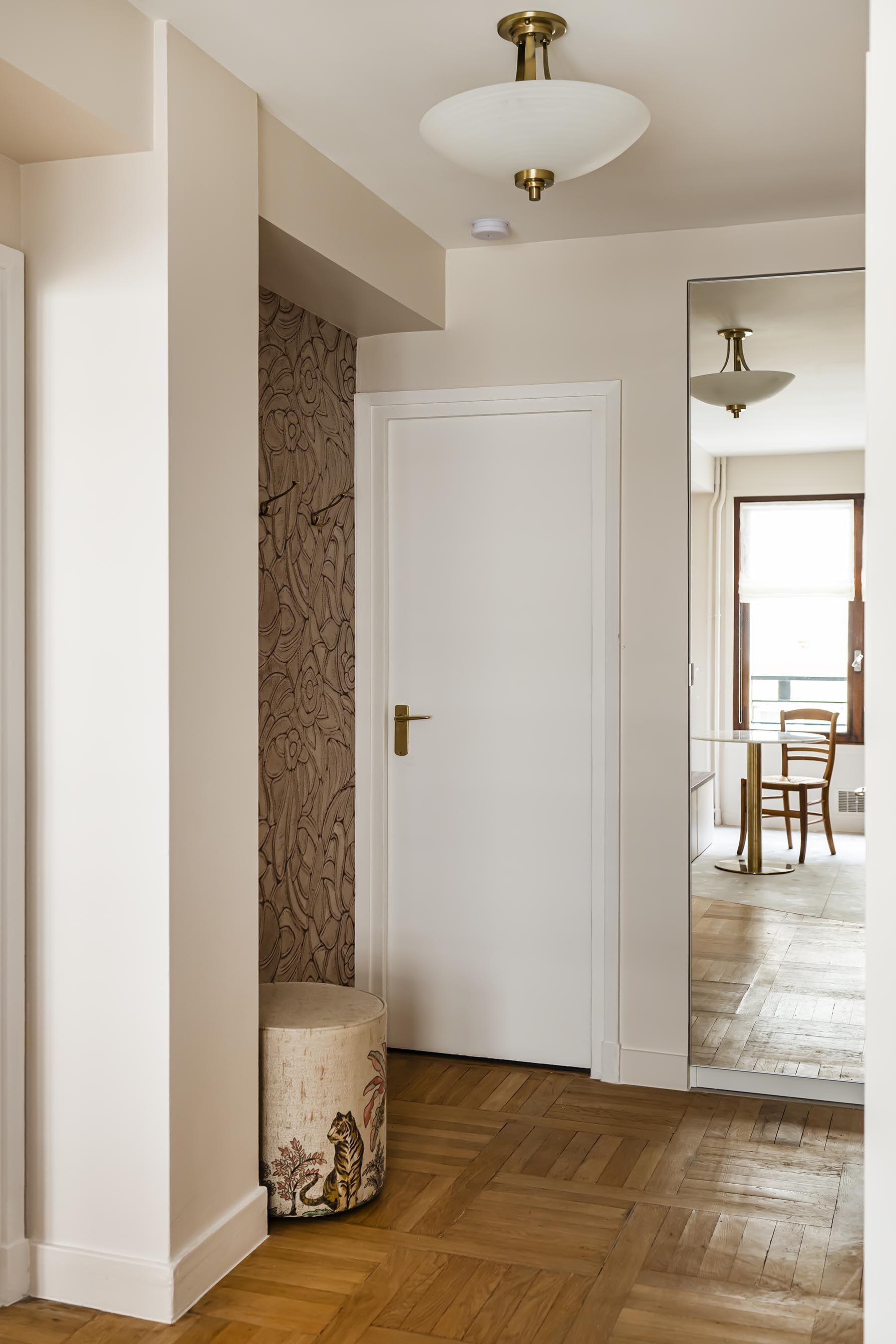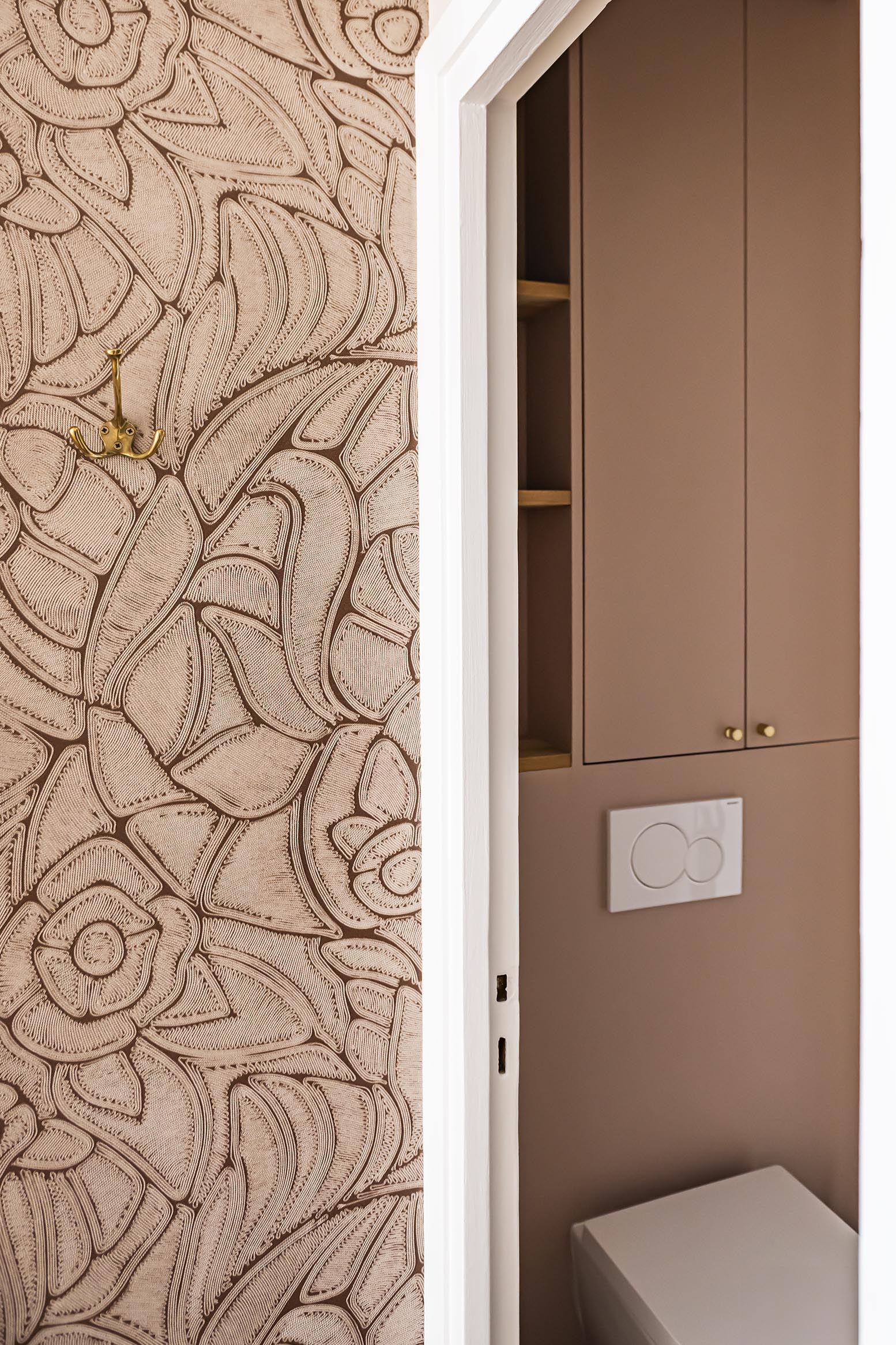 Dans l’optique de moderniser l’ensemble et d’apporter plus de lumière naturelle dans l’entrée, nous avons ouvert la cuisine sur le dégagement en supprimant la porte, un morceau de cloison attenant et aussi l’imposte. Afin de lier ces espaces visuellement et d’optimiser les raccords de sols, j’ai proposé un raccord en biais entre le magnifique parquet existant et le nouveau carrelage. Ma volonté a été de donner du caractère et une vraie fonctionnalité à cette entrée. Avec ce revêtement mural affirmé dans l’alcôve, on obtient un coin vestiaire du quotidien en ajoutant un petit pouf tapissé original et en récupérant les anciennes patères en laiton de la cliente. L’exploitation d’un espace perdu dans les WC a permis de créer une penderie derrière une porte miroir qui reflète la lumière de la cuisine et agrandit l’espace. On joue la continuité de la décoration entre tous ces espaces avec un dégradé de couleurs dans la même palette de beiges, roses et terracotta.