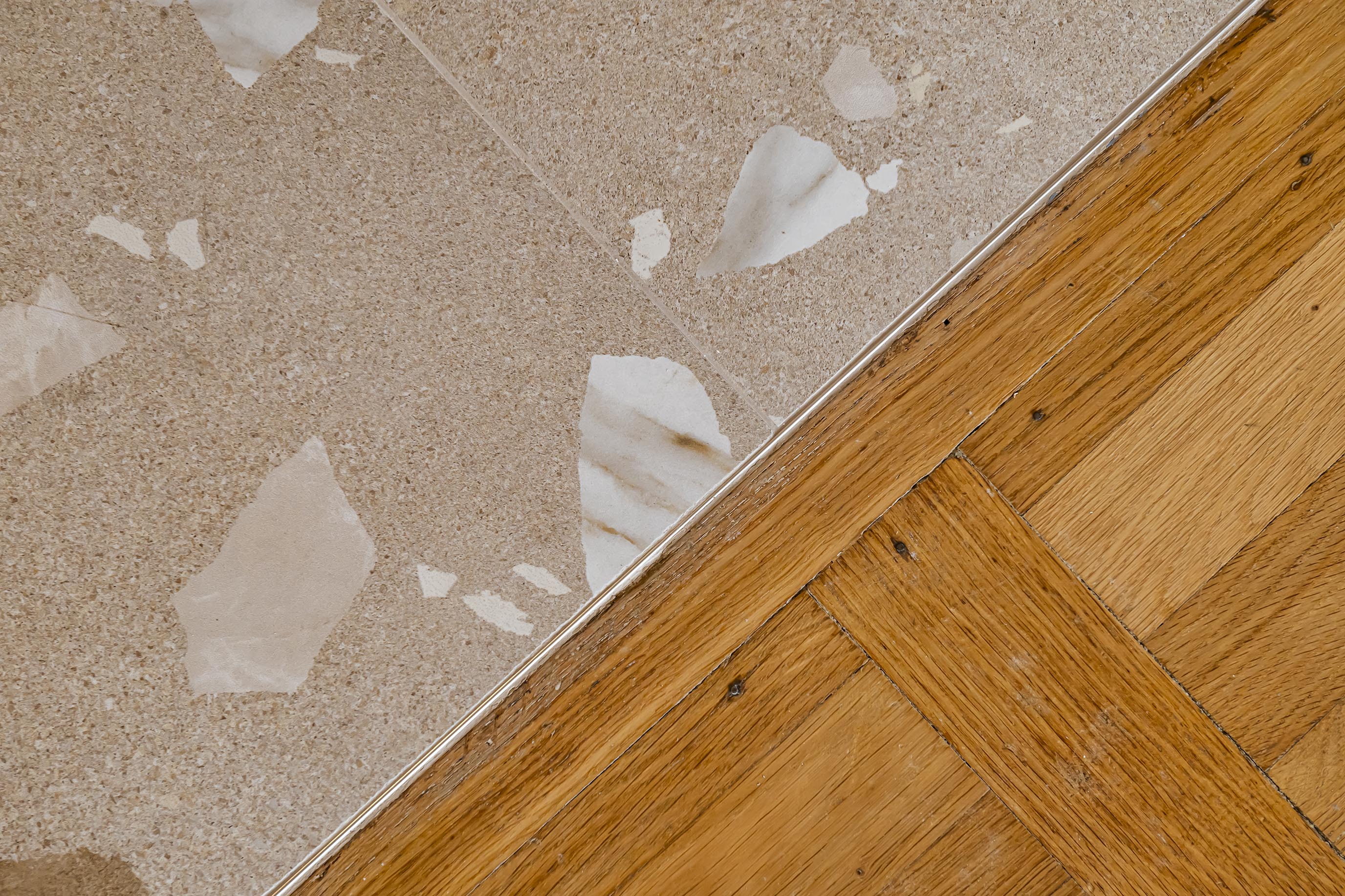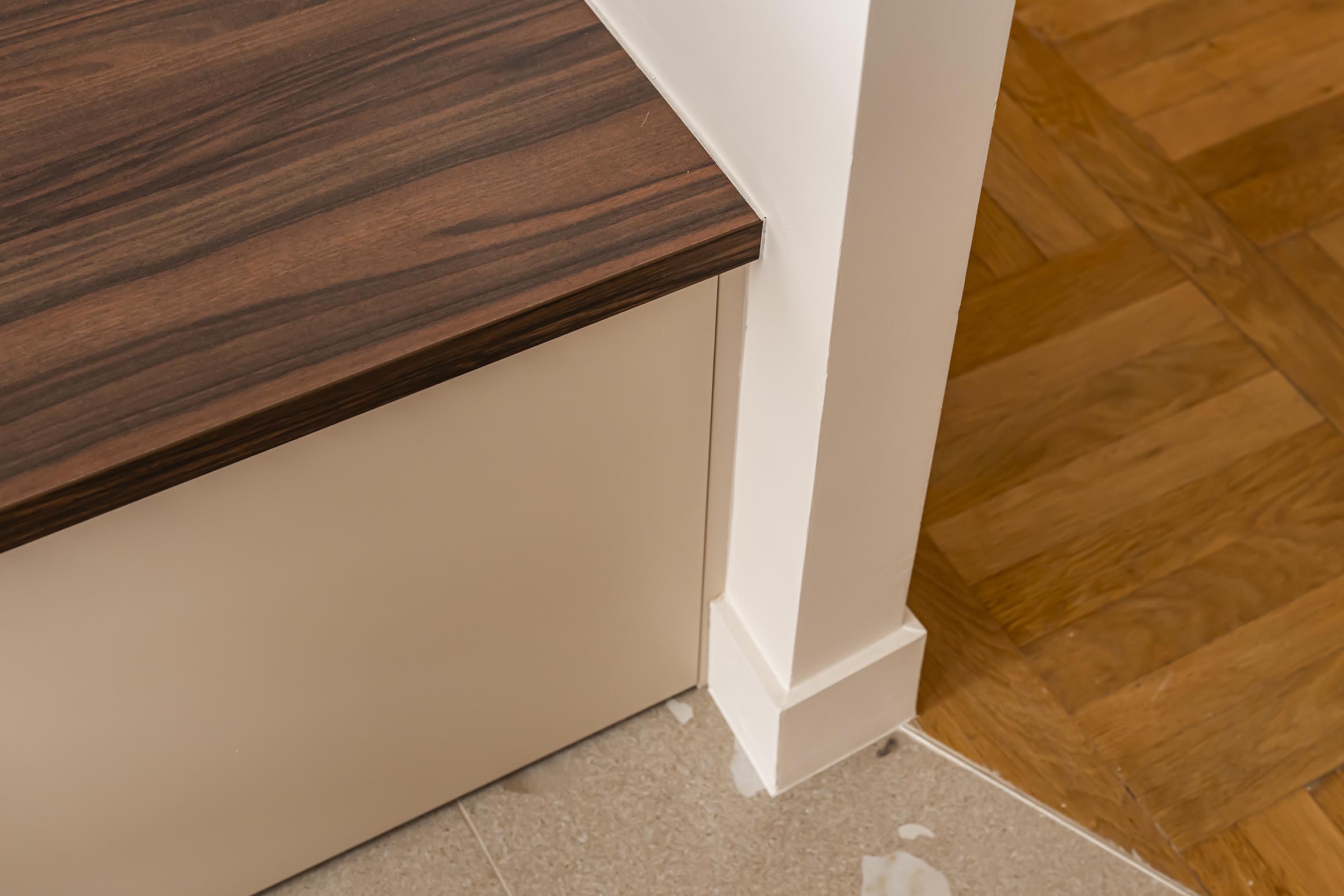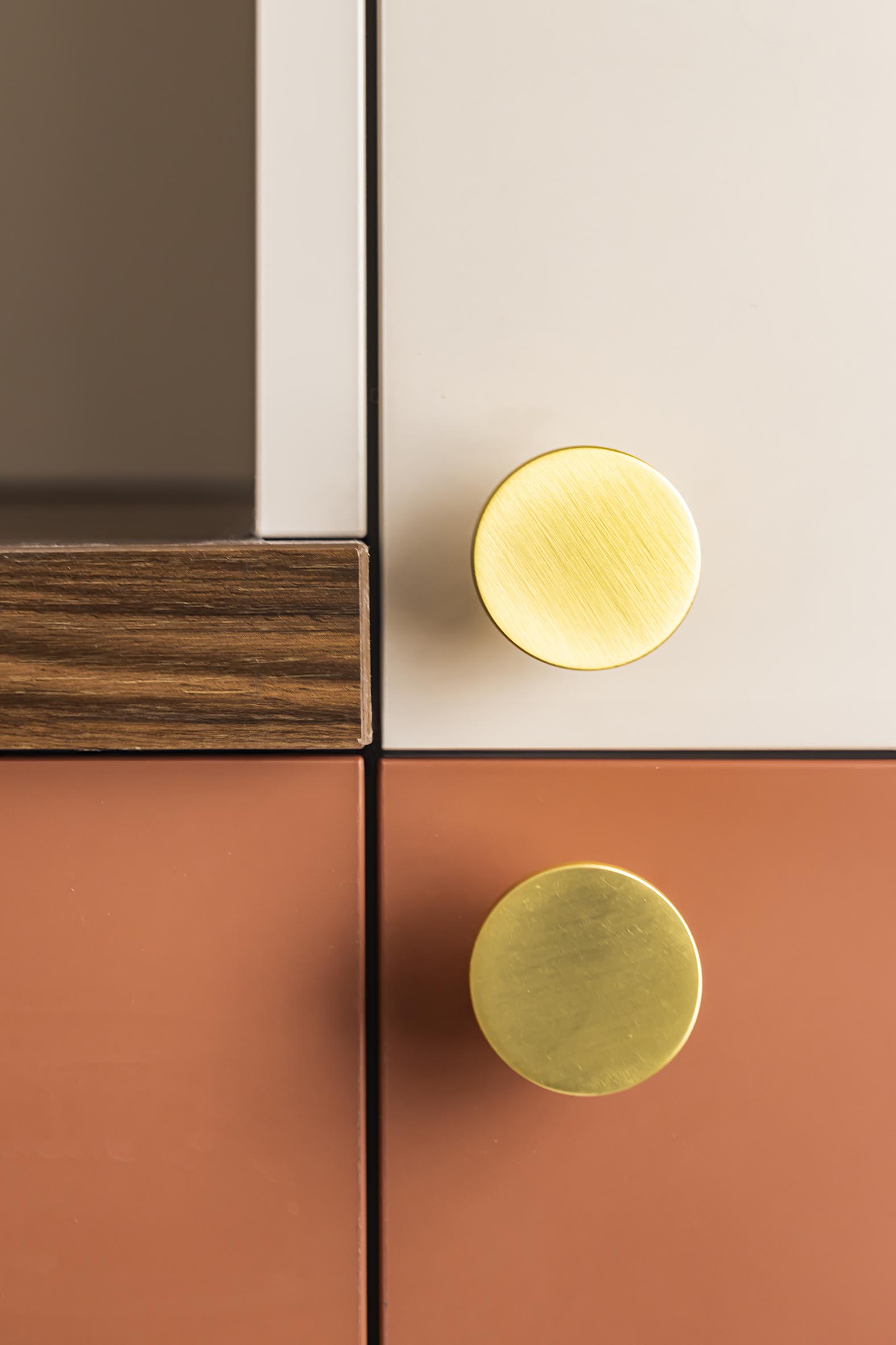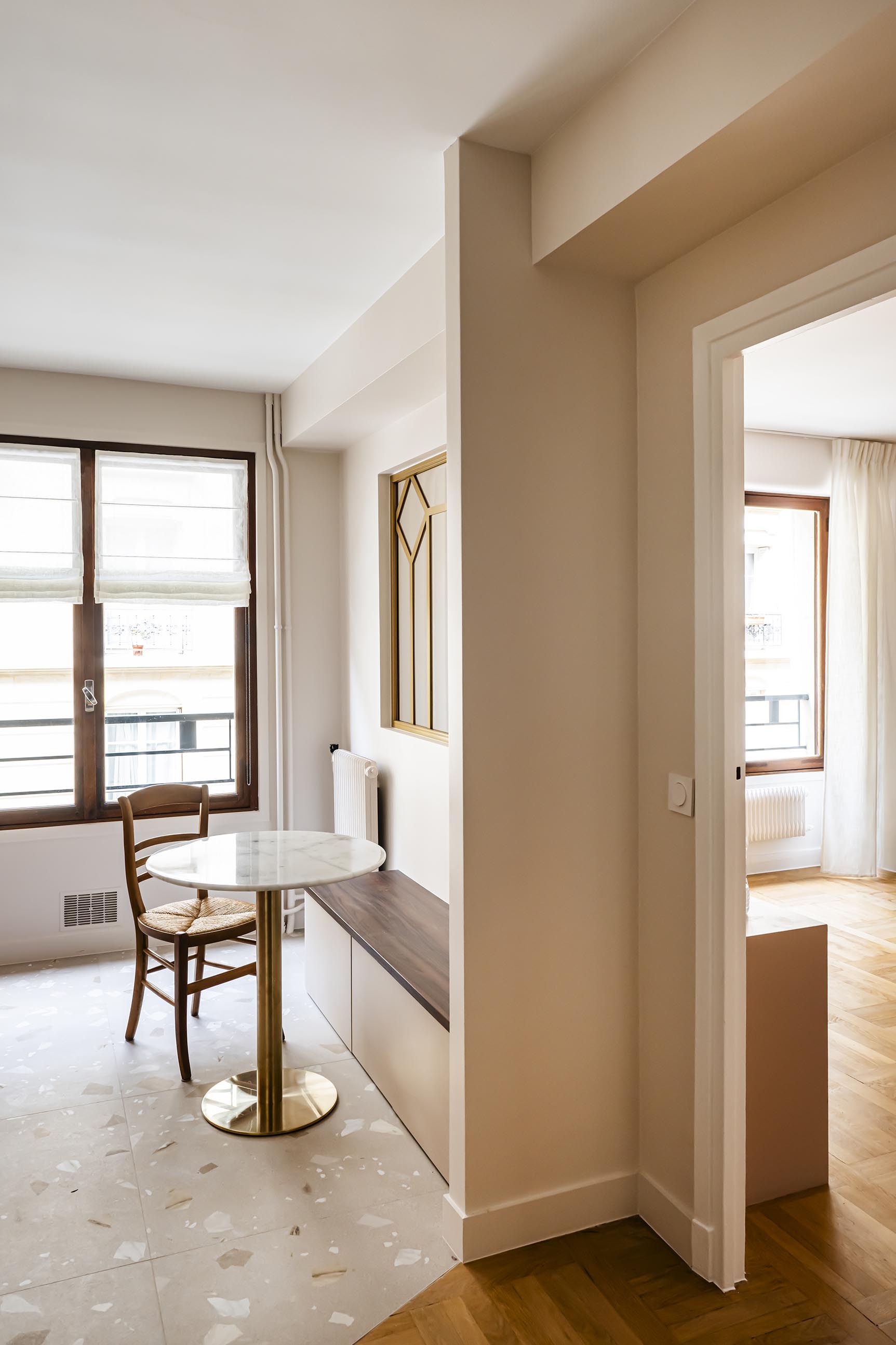 Dans l’optique de moderniser l’ensemble et d’apporter plus de lumière naturelle dans l’entrée, nous avons ouvert la cuisine sur le dégagement en supprimant la porte, un morceau de cloison attenant et aussi l’imposte. Afin de lier ces espaces visuellement et d’optimiser les raccords de sols, j’ai proposé un raccord en biais entre le magnifique parquet existant et le nouveau carrelage. Ma volonté a été de donner du caractère et une vraie fonctionnalité à cette entrée. Avec ce revêtement mural affirmé dans l’alcôve, on obtient un coin vestiaire du quotidien en ajoutant un petit pouf tapissé original et en récupérant les anciennes patères en laiton de la cliente. L’exploitation d’un espace perdu dans les WC a permis de créer une penderie derrière une porte miroir qui reflète la lumière de la cuisine et agrandit l’espace. On joue la continuité de la décoration entre tous ces espaces avec un dégradé de couleurs dans la même palette de beiges, roses et terracotta.