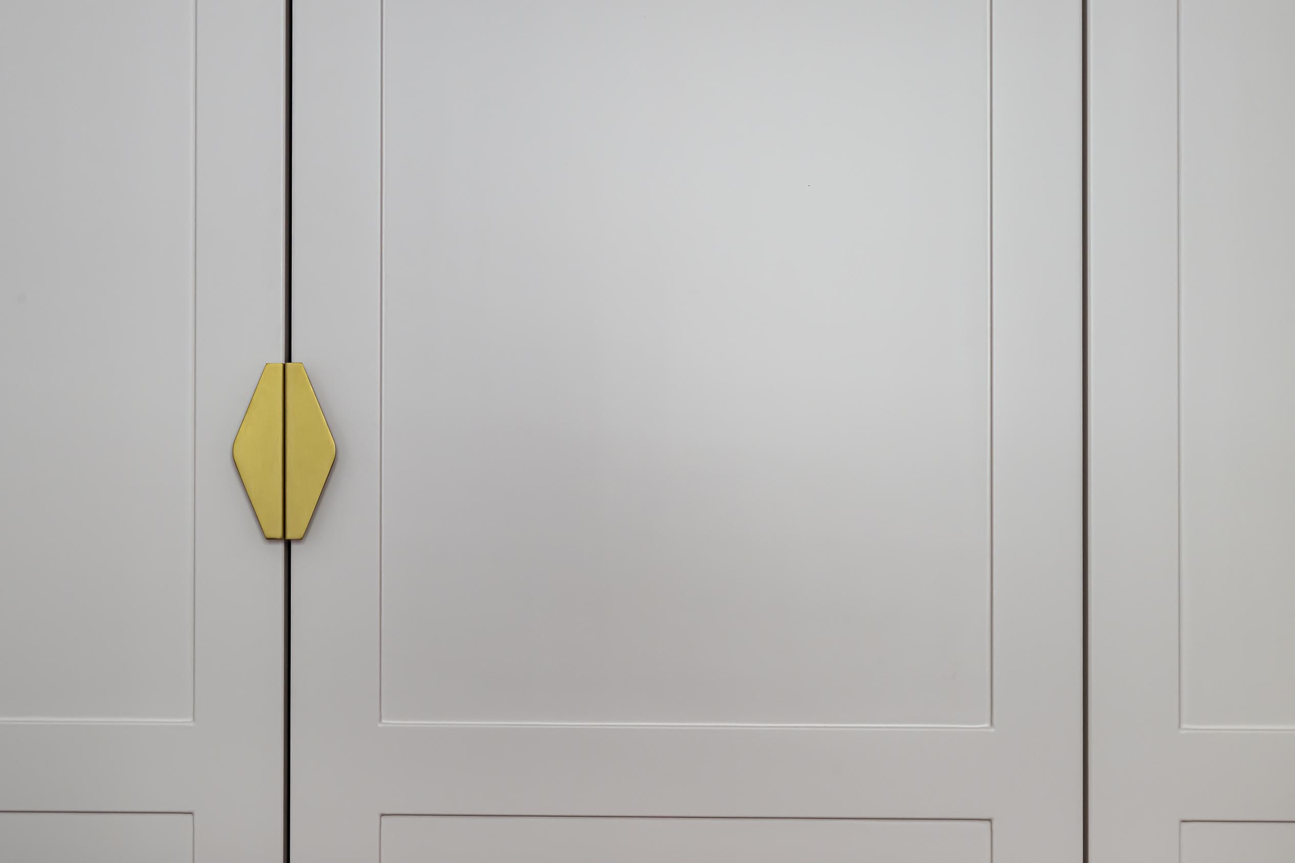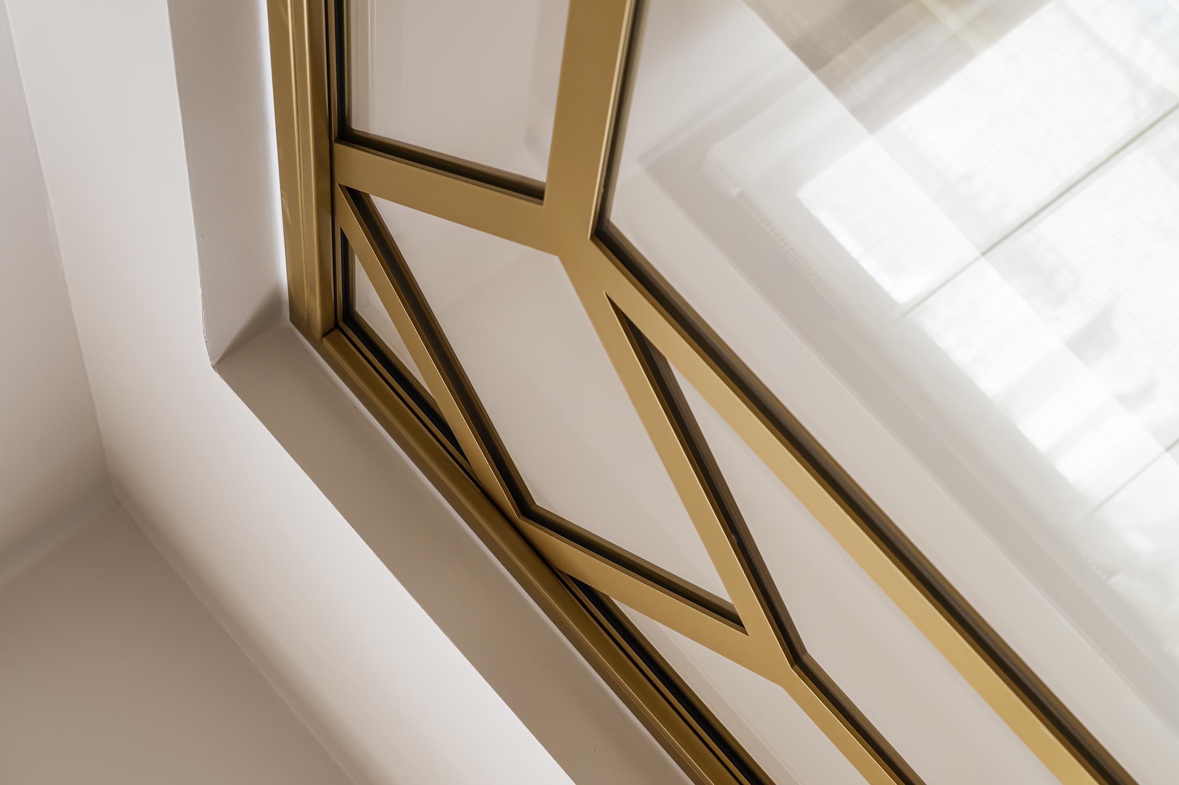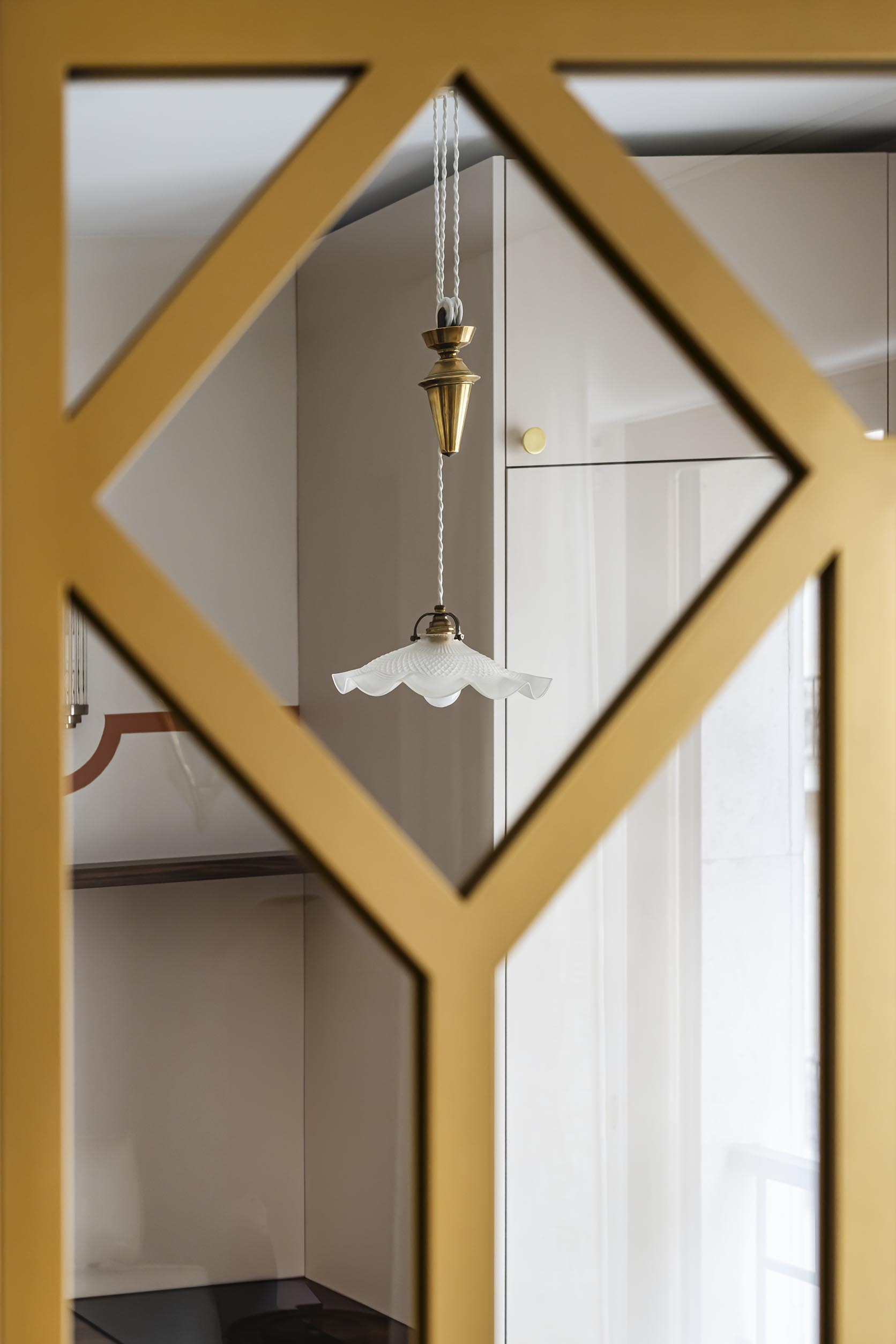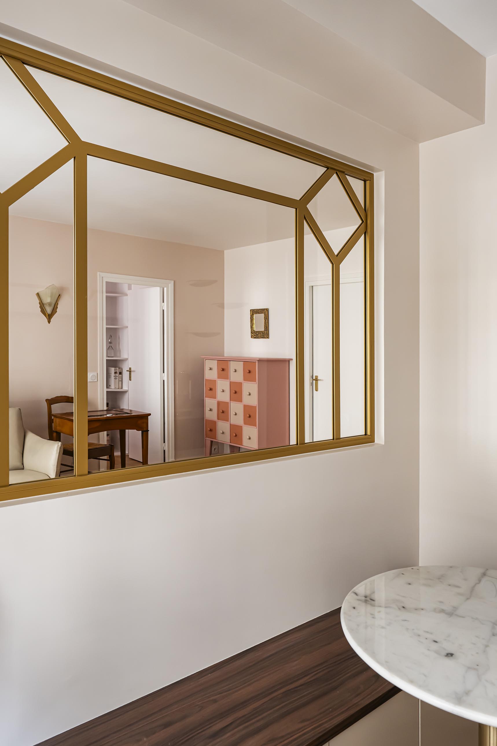 Les accessoires en laiton dénichés dans les affaires de la cliente et son goût pour la période Art Déco m’ont inspirée pour lui dessiner cette verrière en acier doré totalement sur-mesure qui est un peu le clou du spectacle. Elle a immédiatement validé le dessin.