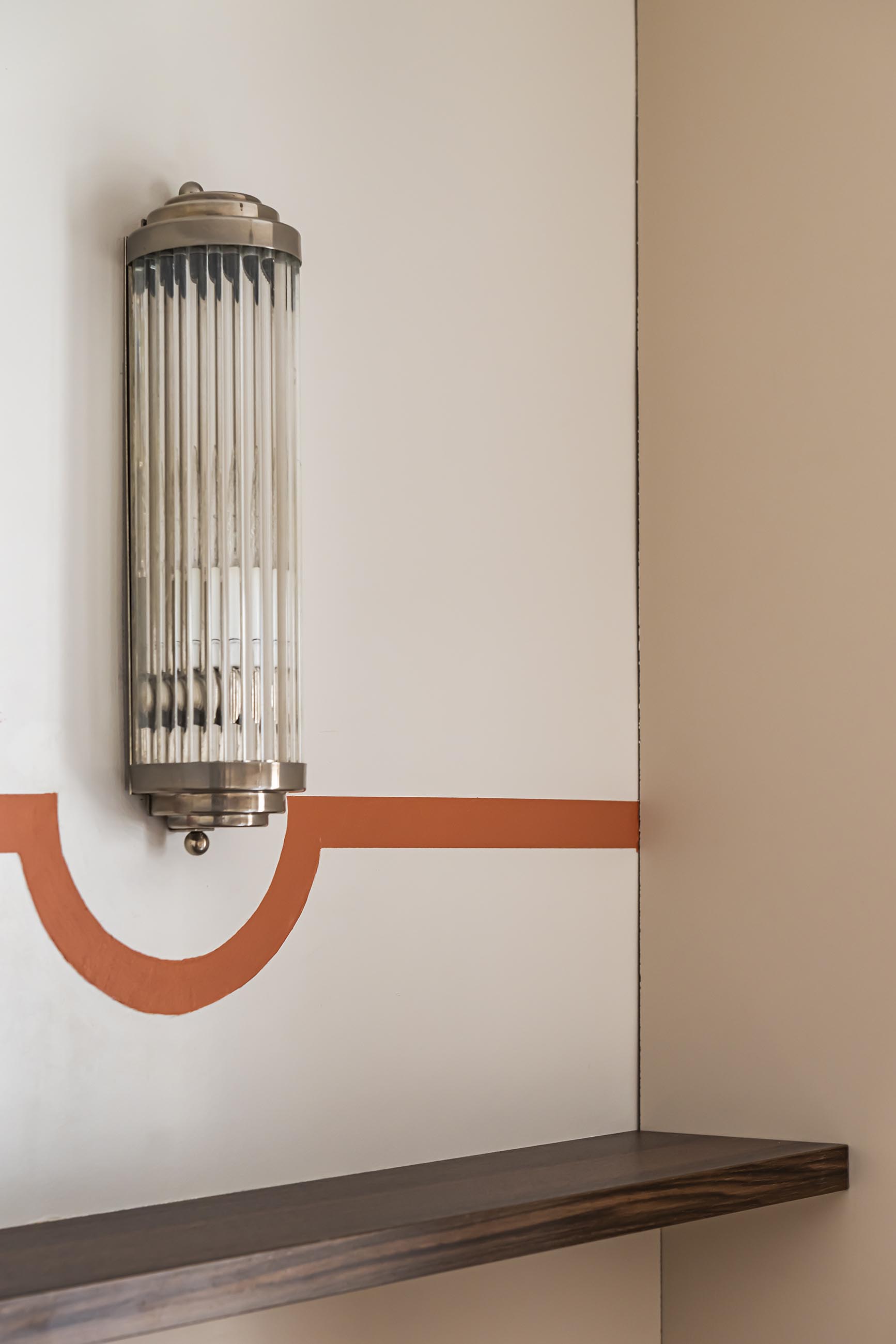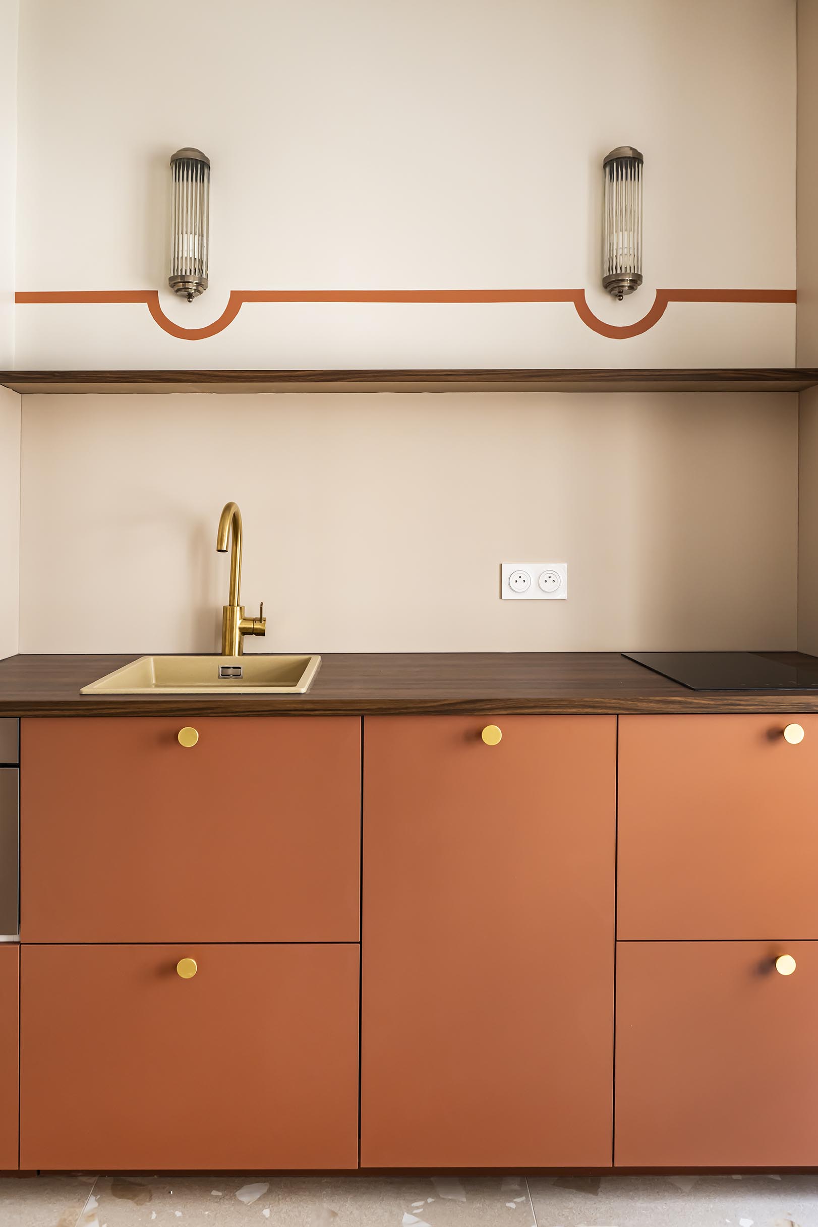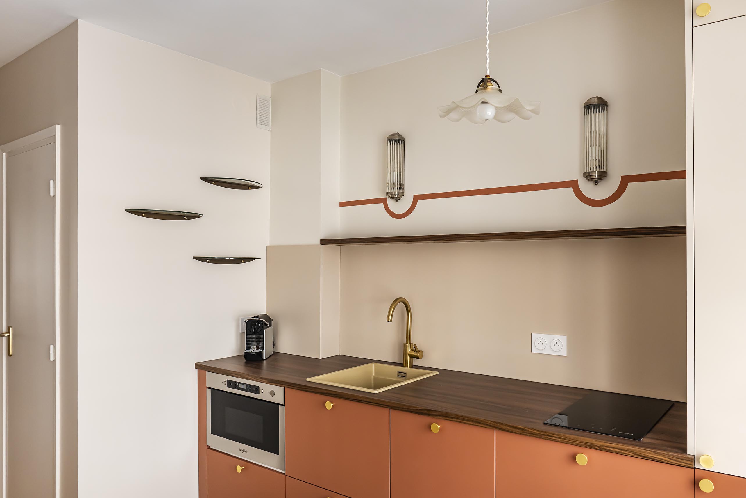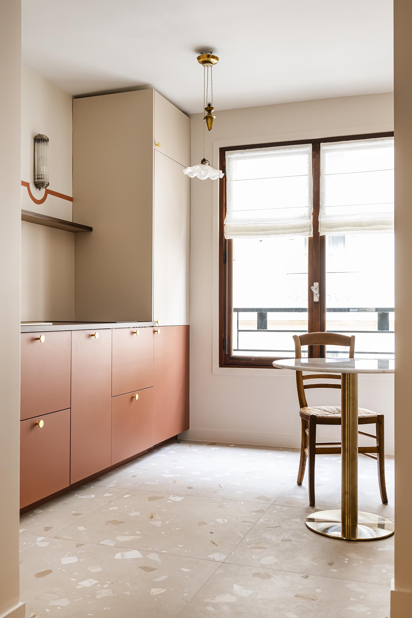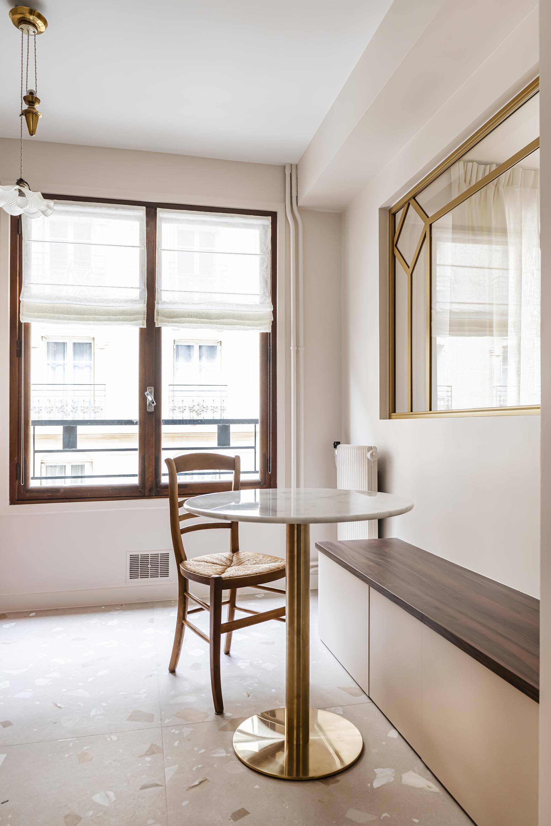 Pour la cuisine, la demande de la cliente, qui cuisine très peu, était de proposer un espace très déco qui ne fasse pas trop penser à une cuisine, sans meubles hauts. J’ai eu un vrai coup de cœur pour ses appliques anciennes en verre cannelé et j’ai eu l’idée de les mettre en valeur par un liseré de peinture dans la teinte des façades basses du mobilier. J’ai opté pour une cuisine bicolore dans un esprit bistro avec une table ronde en laiton et marbre, une banquette avec des rangements (pour compenser le manque de meubles hauts) et en récupérant aussi la jolie suspension de son ancien appartement.