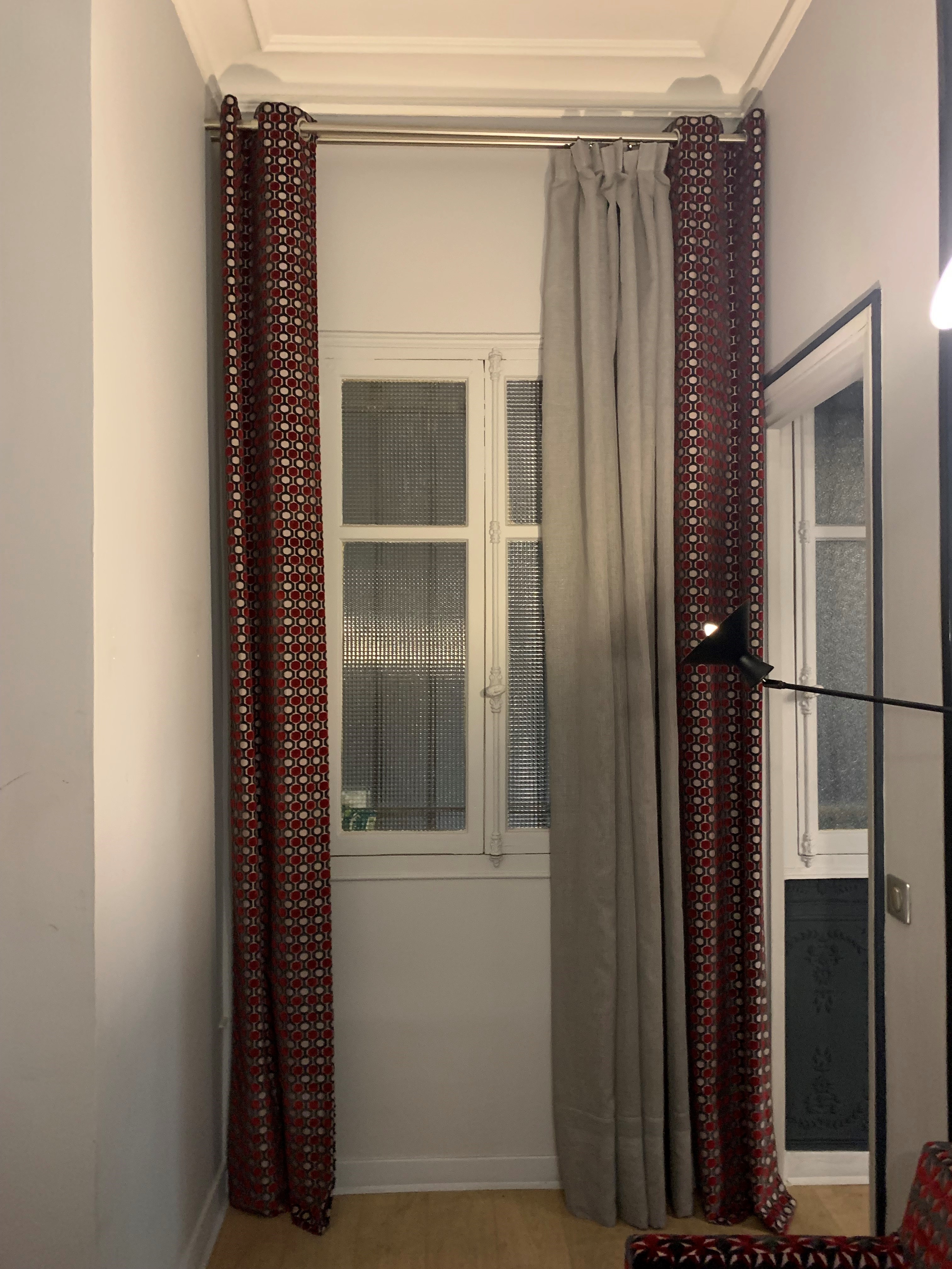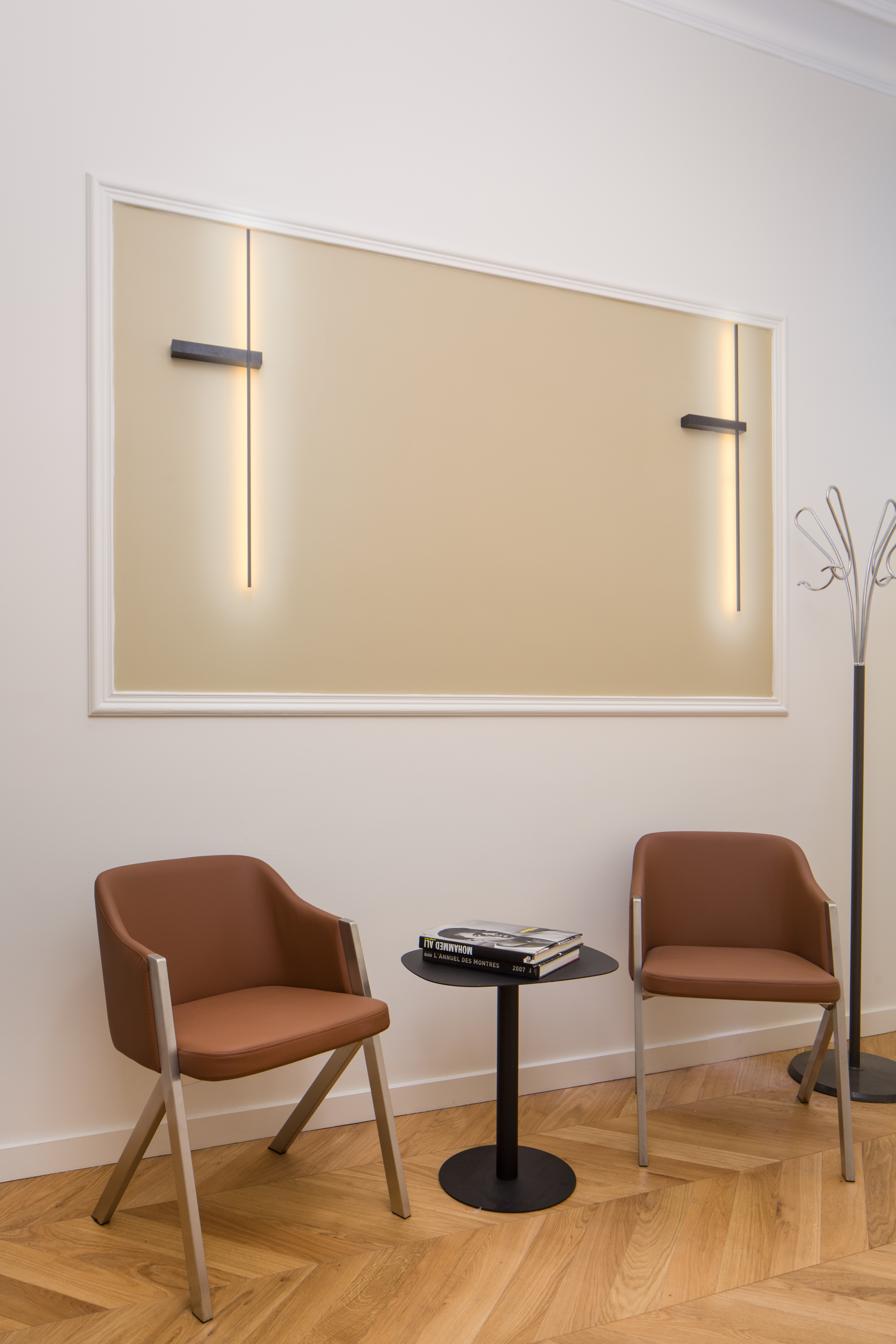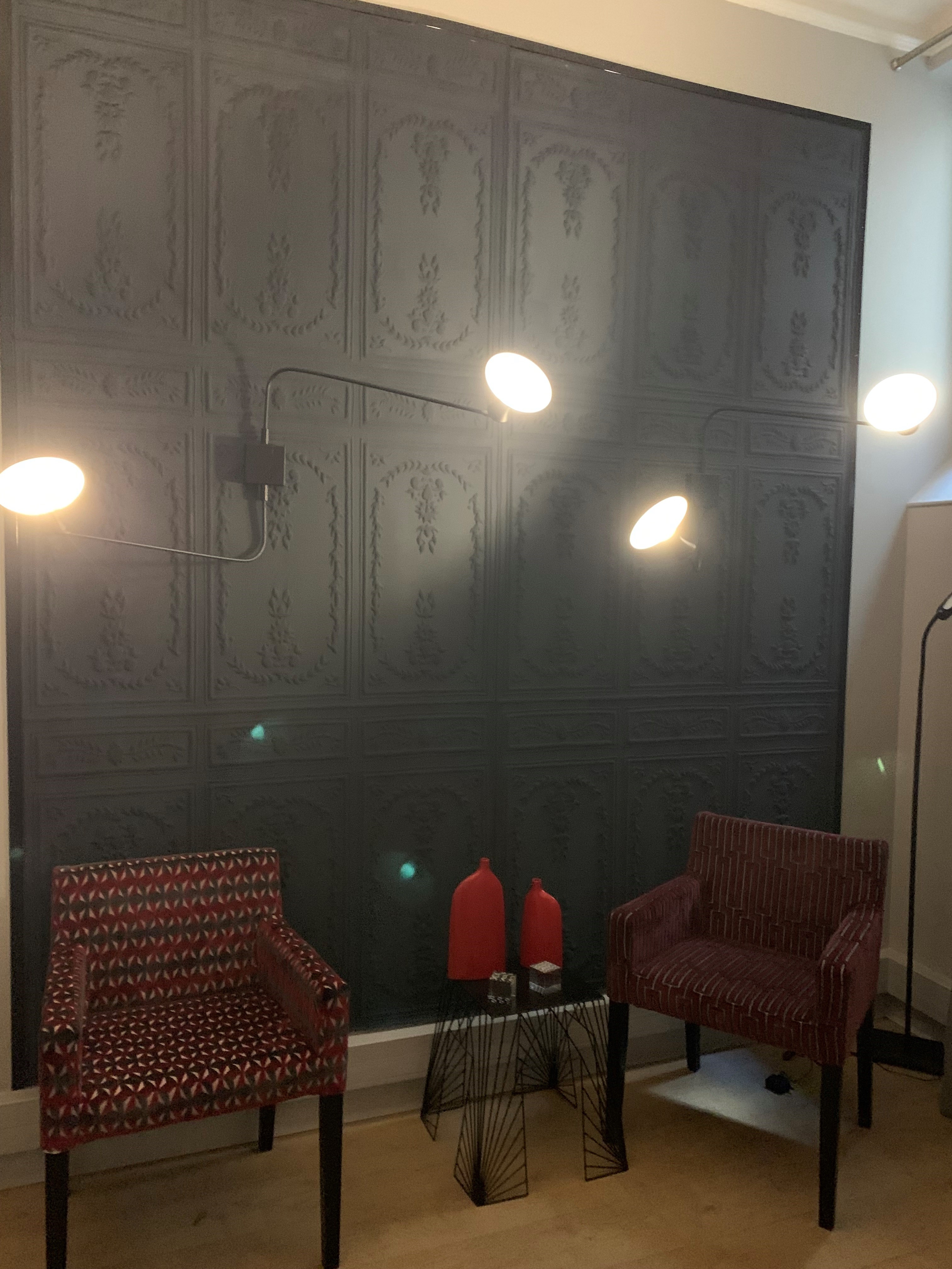 A l’accueil, le mot d’ordre est la lumière. Les 2 appliques ont été mises en valeur dans un cadre de couleur chaude délimité pas des moulures pour rappeler le côté Haussmannien.