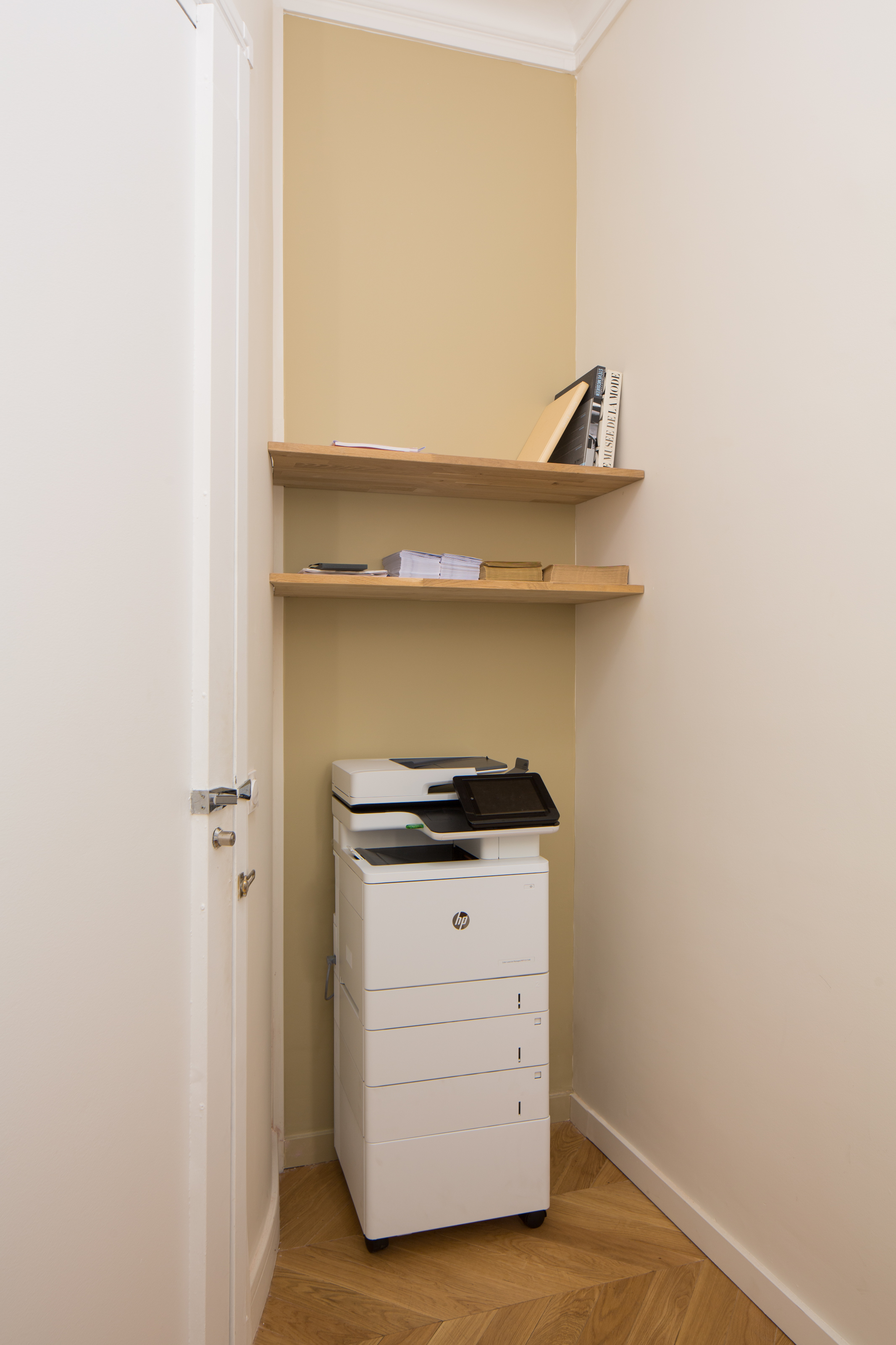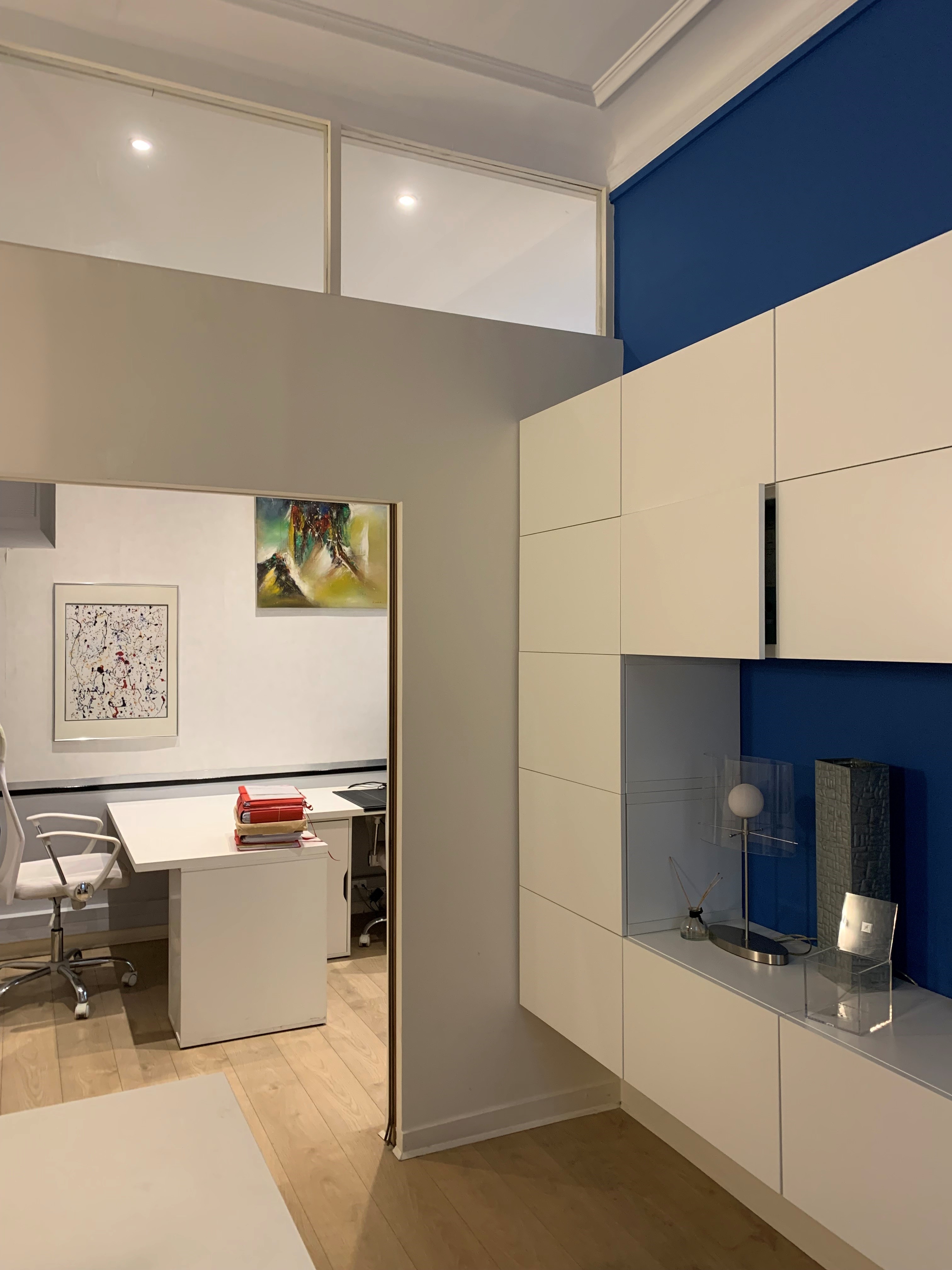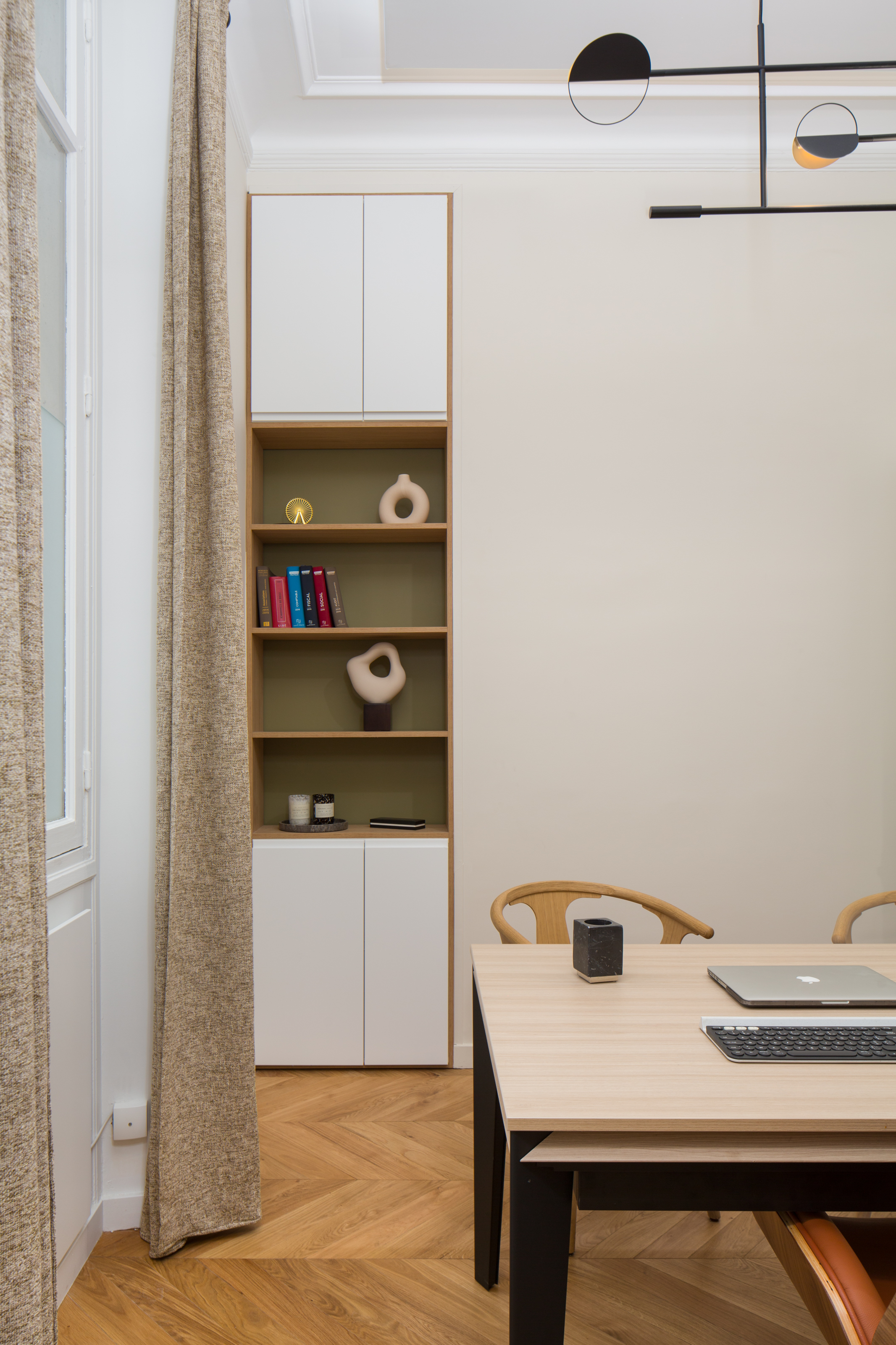 Dans les différents espaces, les niches ont été aménagées et optimisées afin de créer des rangements qui alternent entre les niches ouvertes pour la déco et la légèreté, et les caissons fermés pour le côté fonctionnel et pour cacher les nombreux classeurs et boîtes à archives. La plus grande bibliothèque à côté de l’espace détente cache une porte de service qui a été condamnée ainsi que le tableau électrique, qui reste cependant accessible via un système de double fond.