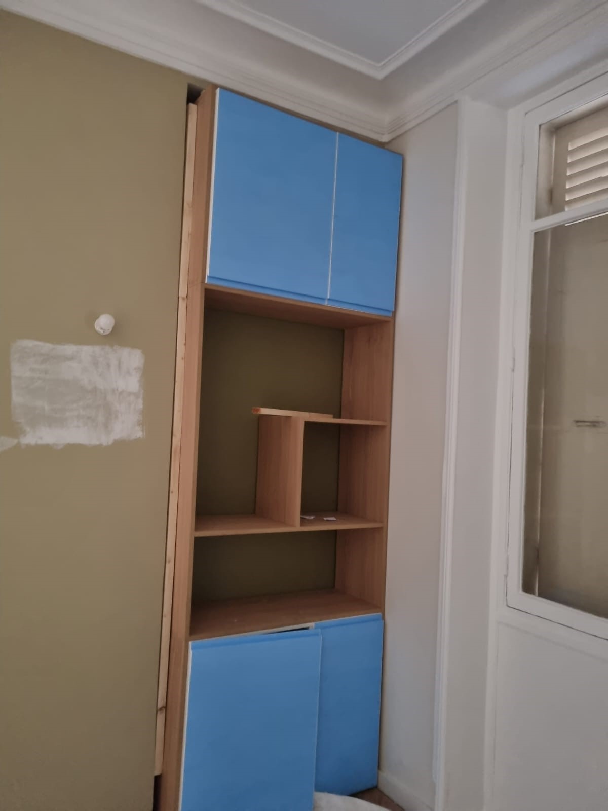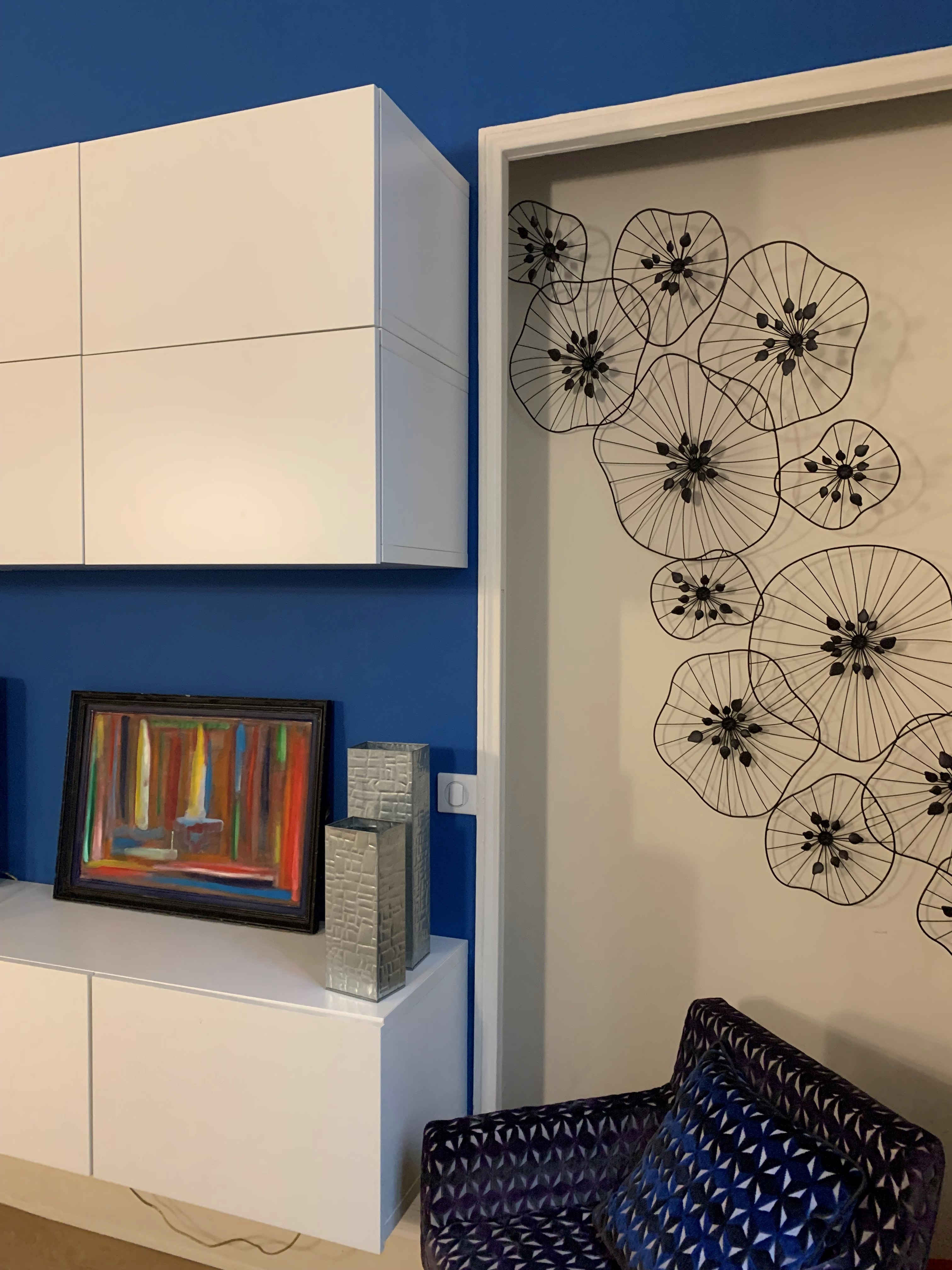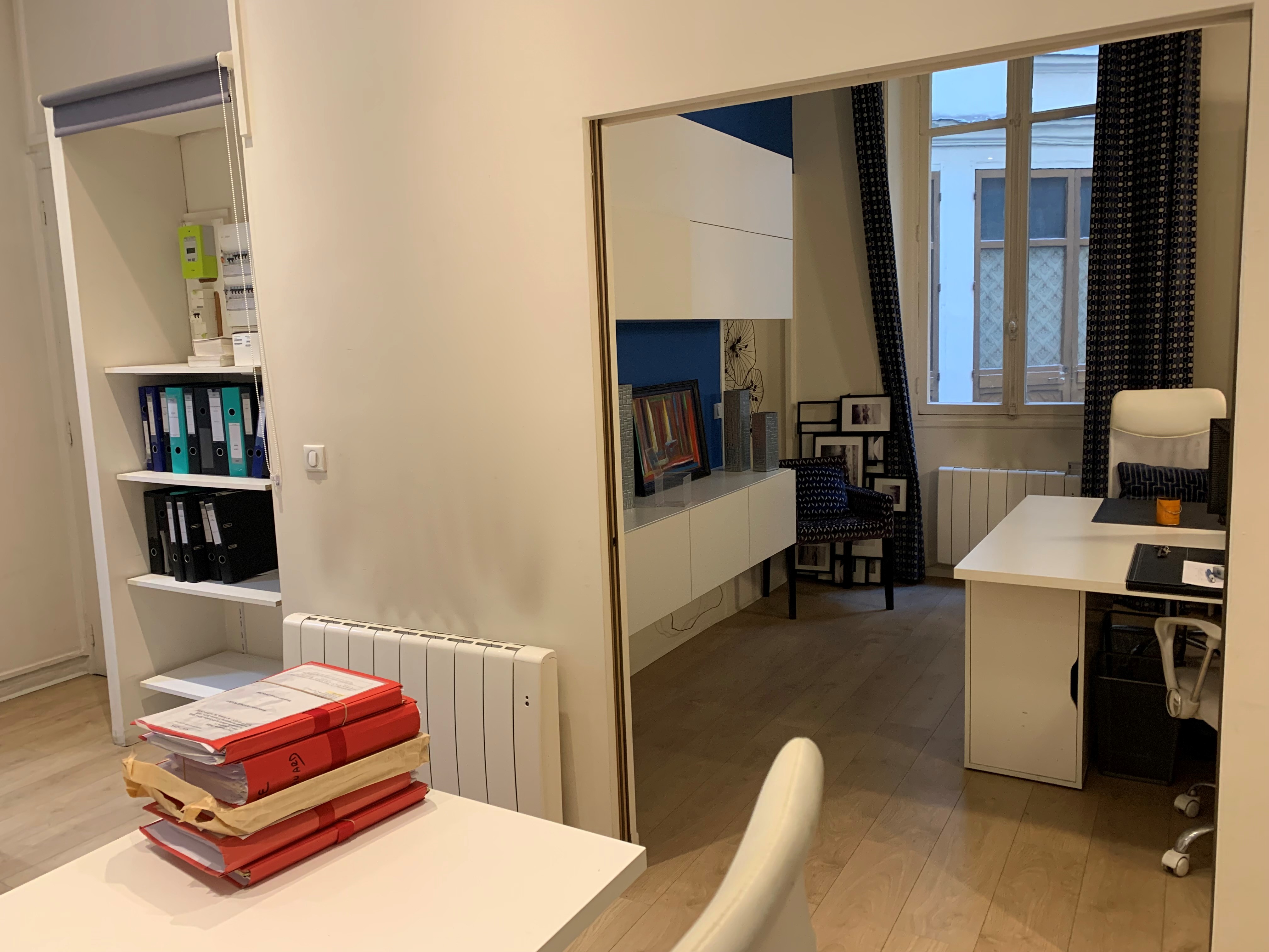 Dans les différents espaces, les niches ont été aménagées et optimisées afin de créer des rangements qui alternent entre les niches ouvertes pour la déco et la légèreté, et les caissons fermés pour le côté fonctionnel et pour cacher les nombreux classeurs et boîtes à archives. La plus grande bibliothèque à côté de l’espace détente cache une porte de service qui a été condamnée ainsi que le tableau électrique, qui reste cependant accessible via un système de double fond.