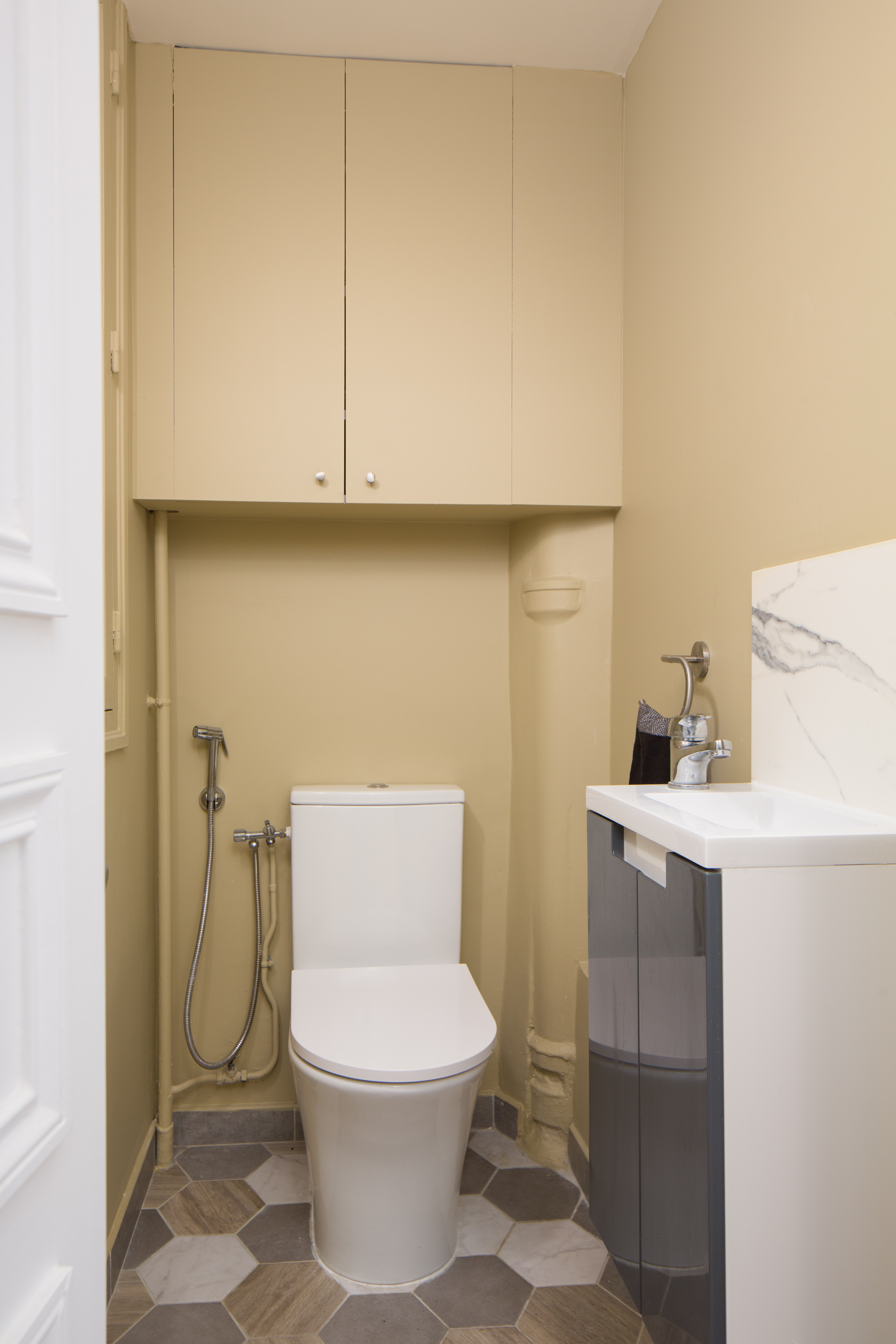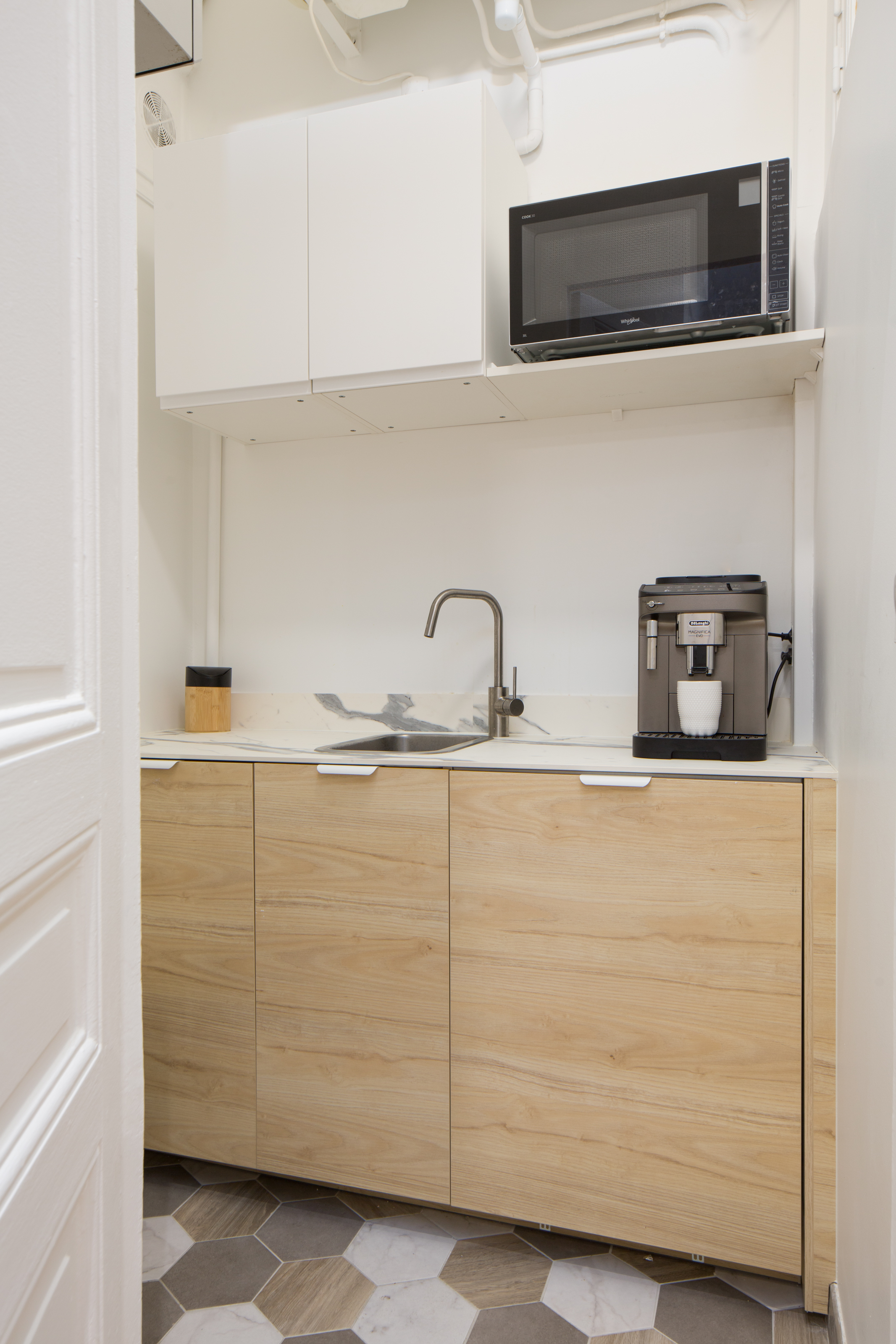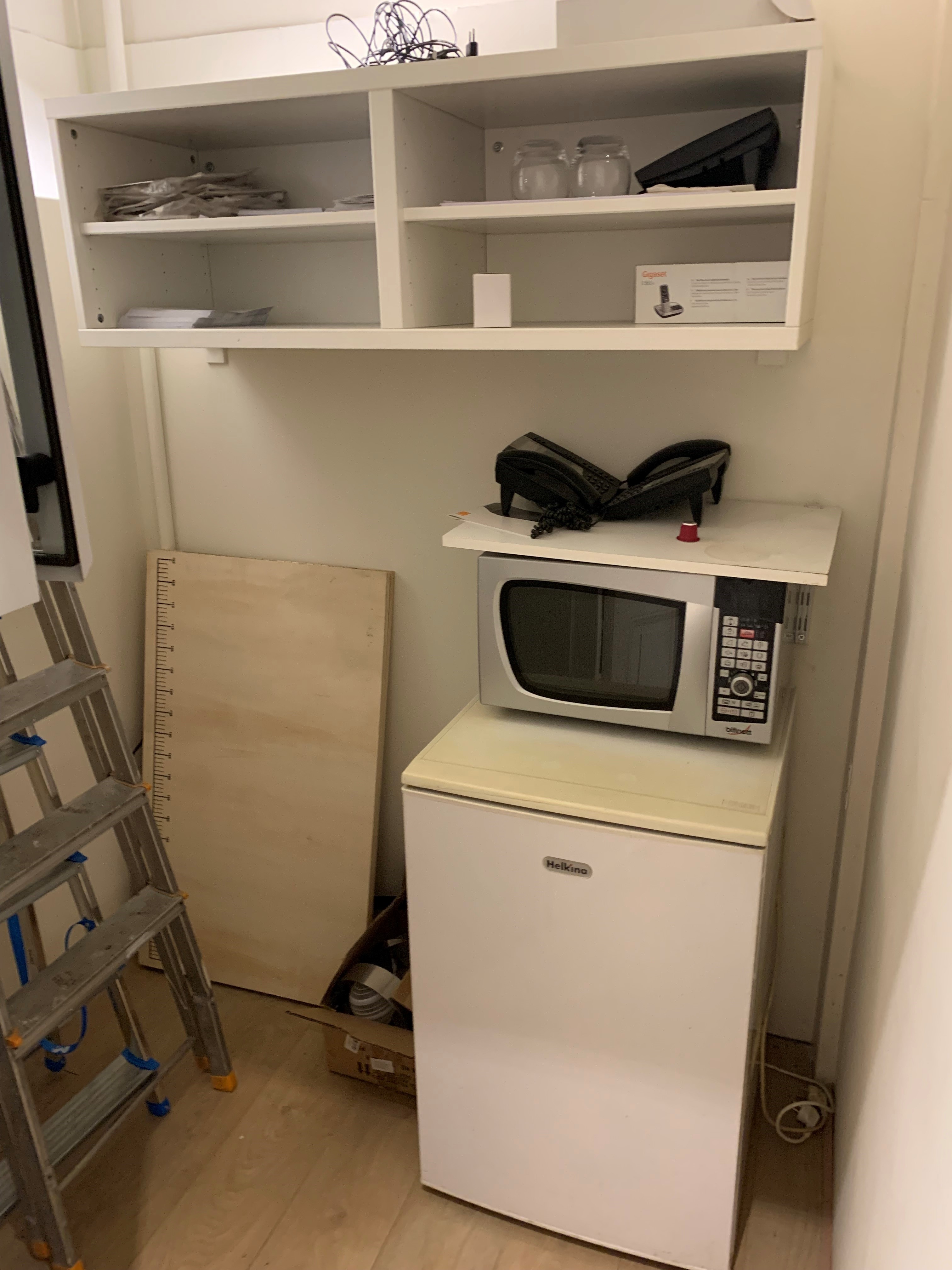 La petite cuisine et les WC n’ont pas changé de place mais ont été rénovés et aménagés afin d’être plus clairs et plus fonctionnels. A l’accueil, il y avait un petit coin perdu qui a été utilisé pour caser le copieur. Cet appareil plutôt bruyant et disgracieux se trouve ainsi éloigné des espaces de travail et détente.