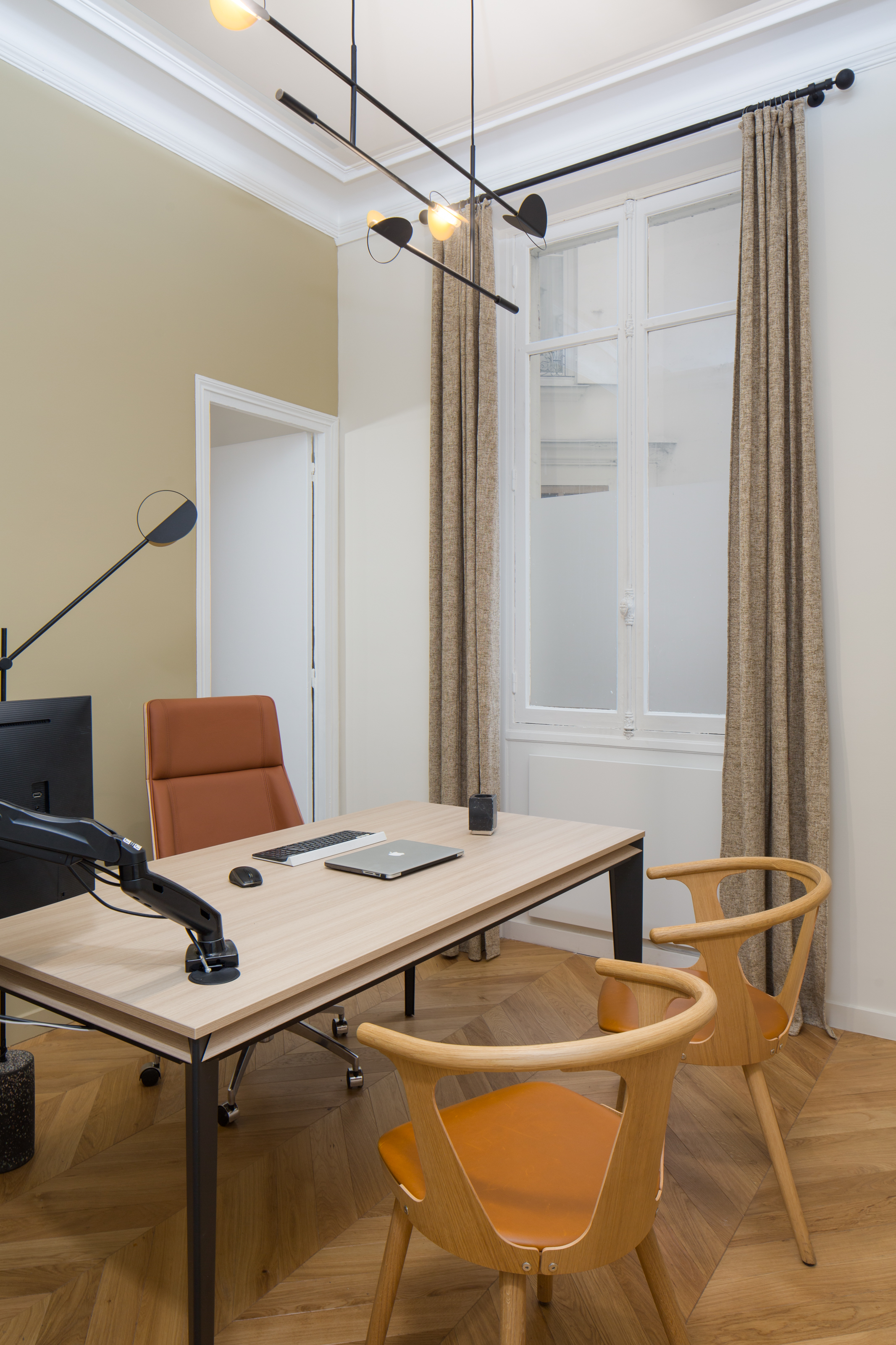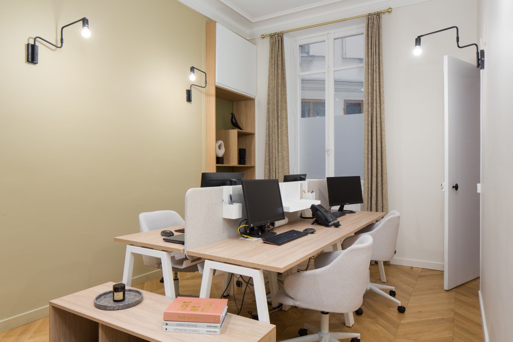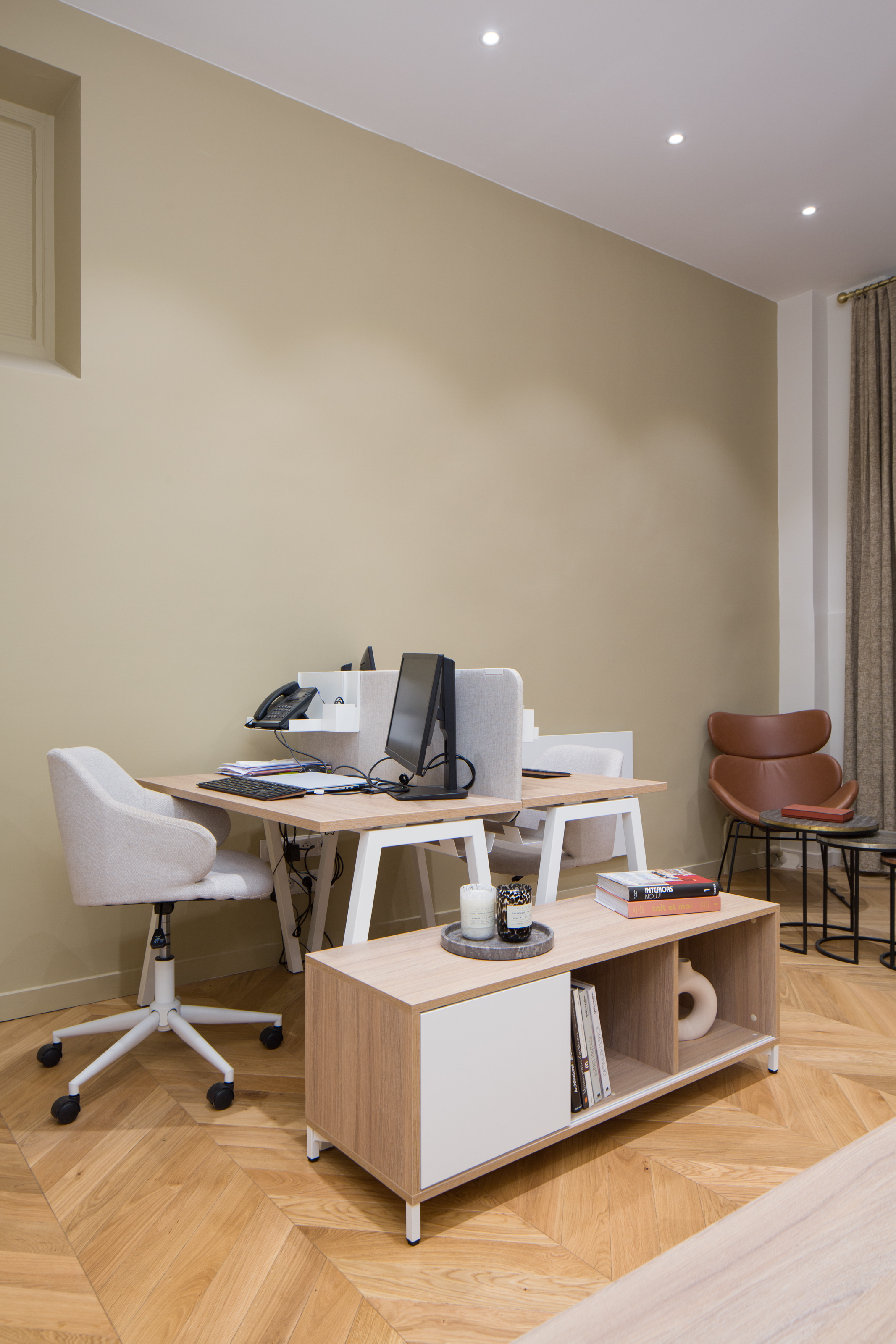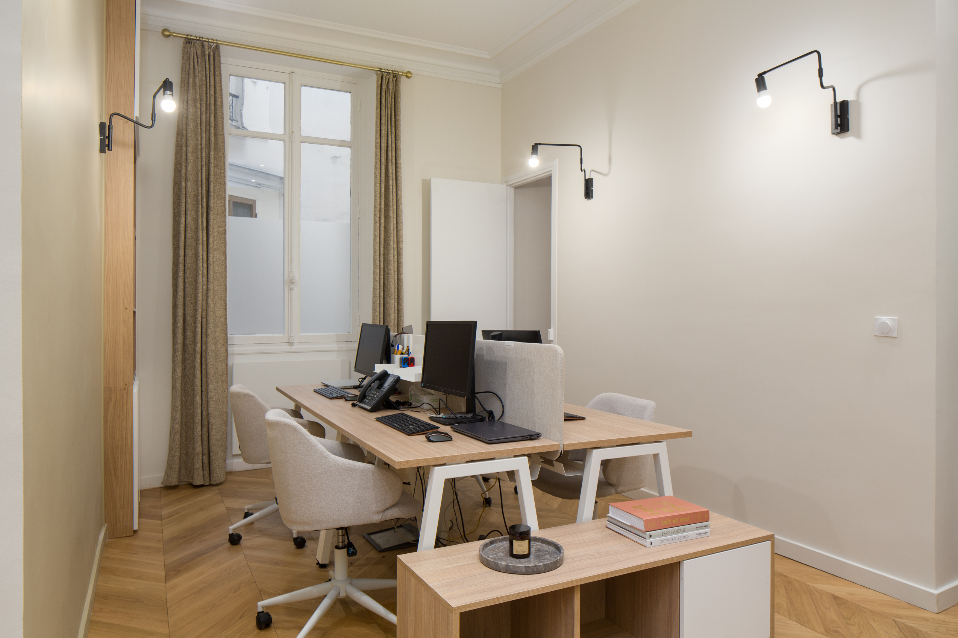 Côté décoration, on a choisi des couleurs claires et chaudes avec également un apport de bois sur les bureaux et le beau parquet point de Hongrie, ainsi que des touches de cuir. En effet, les locaux sont très sombres (RDC sur cour) et un gros travail sur la lumière a été effectué pour permettre de travailler dans de bonnes conditions. Un faux plafond décalé dans le bureau de Direction permet de conserver les moulures d’origine et de les mettre en valeur grâce à un bandeau LED qui sert aussi d’éclairage d’ambiance.