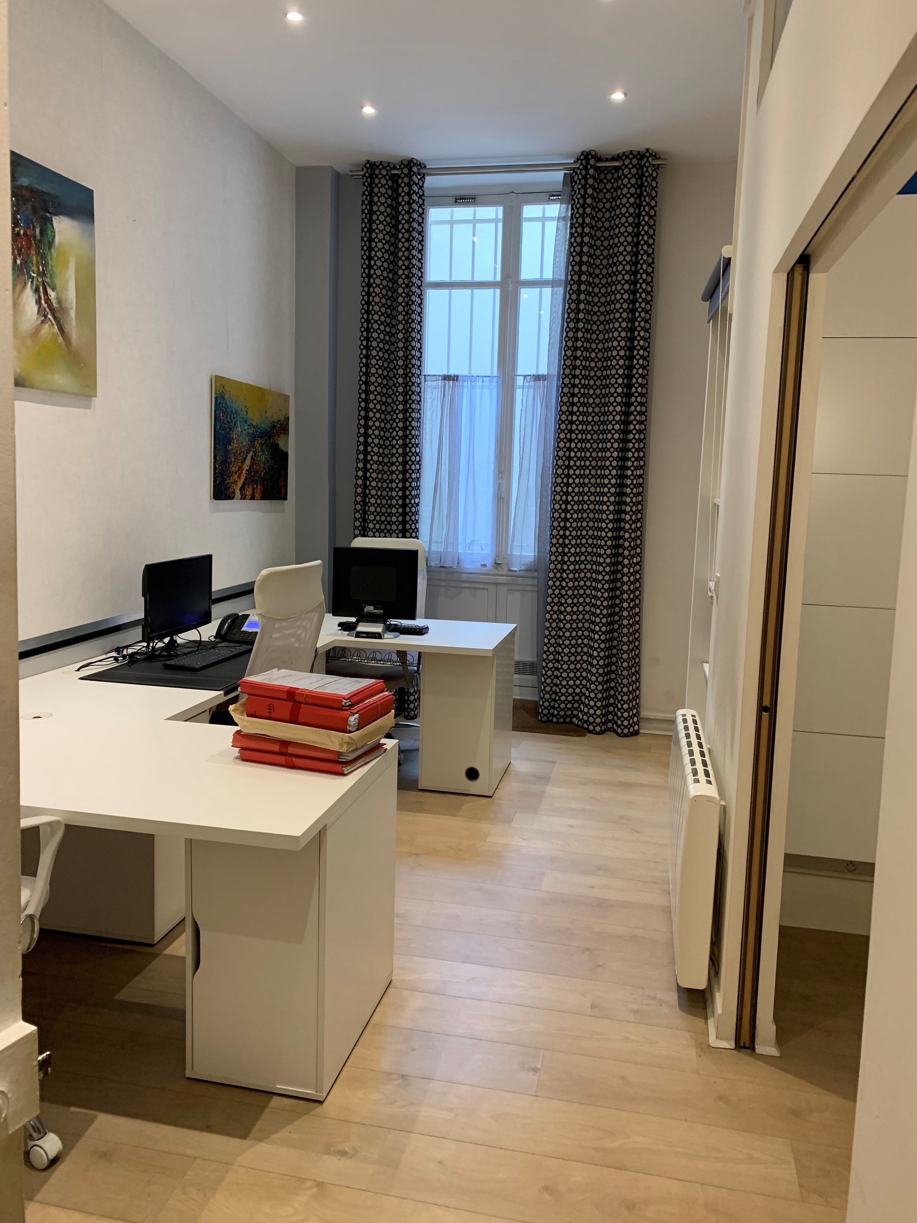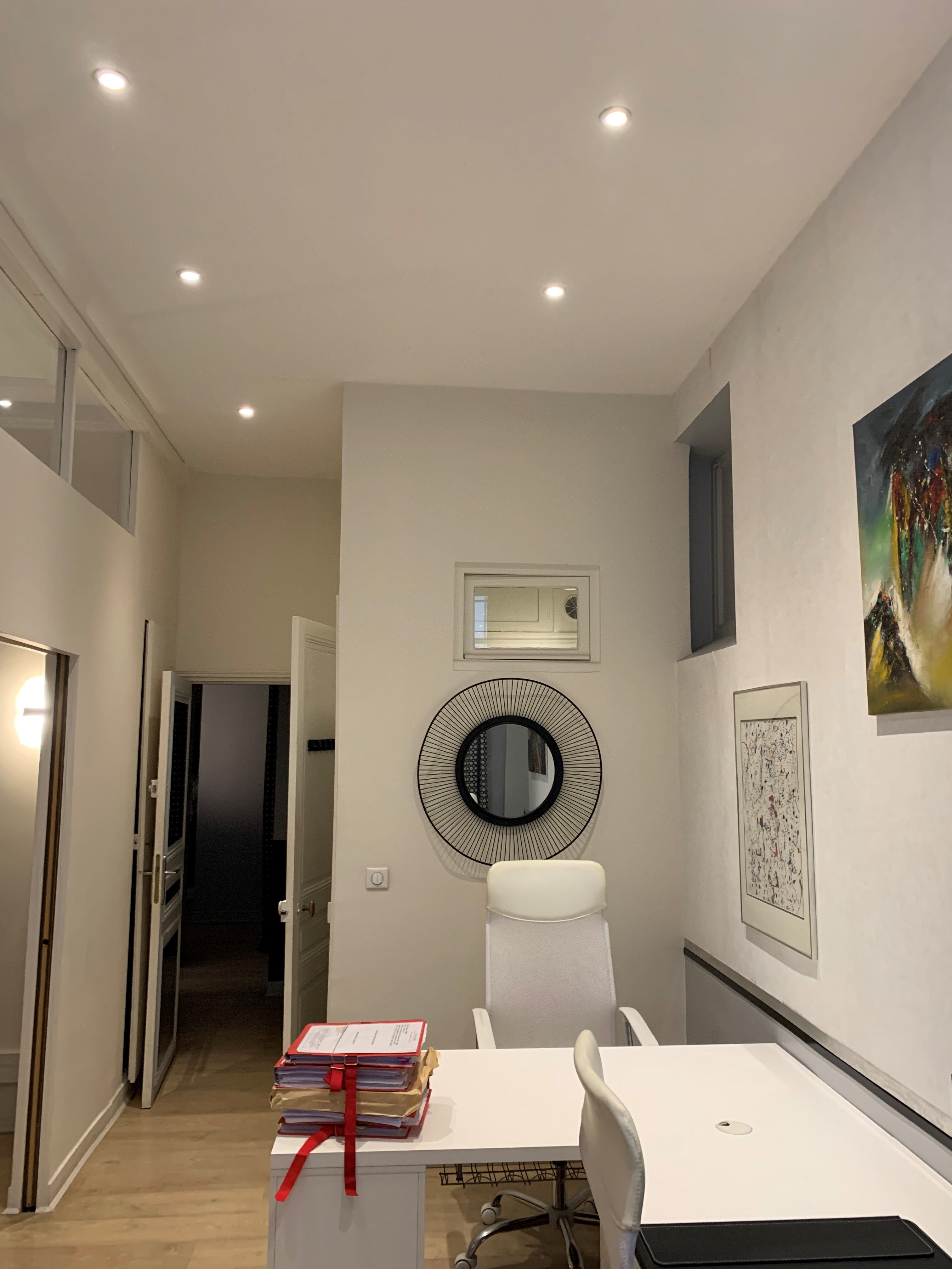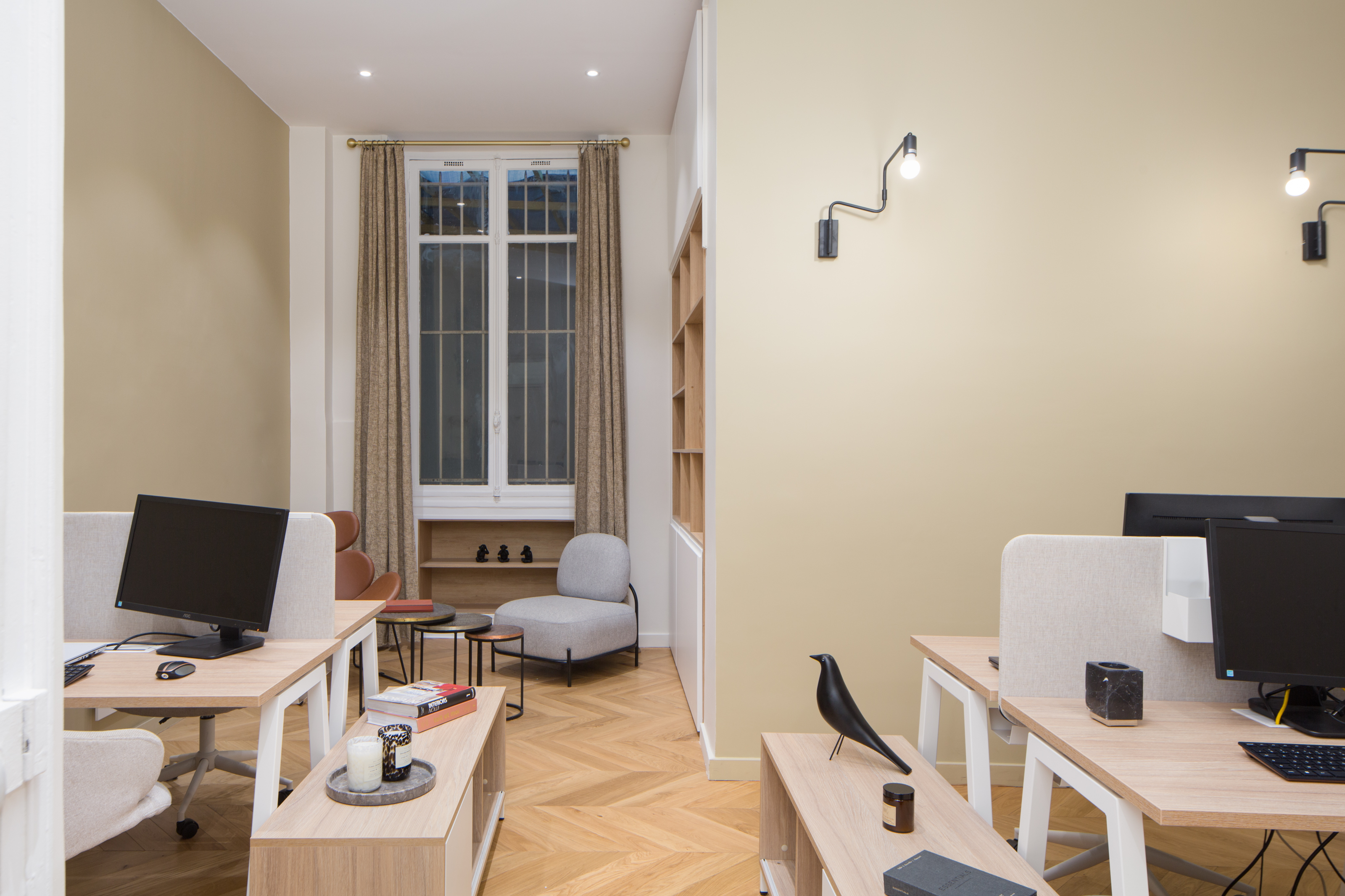 Côté décoration, on a choisi des couleurs claires et chaudes avec également un apport de bois sur les bureaux et le beau parquet point de Hongrie, ainsi que des touches de cuir. En effet, les locaux sont très sombres (RDC sur cour) et un gros travail sur la lumière a été effectué pour permettre de travailler dans de bonnes conditions. Un faux plafond décalé dans le bureau de Direction permet de conserver les moulures d’origine et de les mettre en valeur grâce à un bandeau LED qui sert aussi d’éclairage d’ambiance.