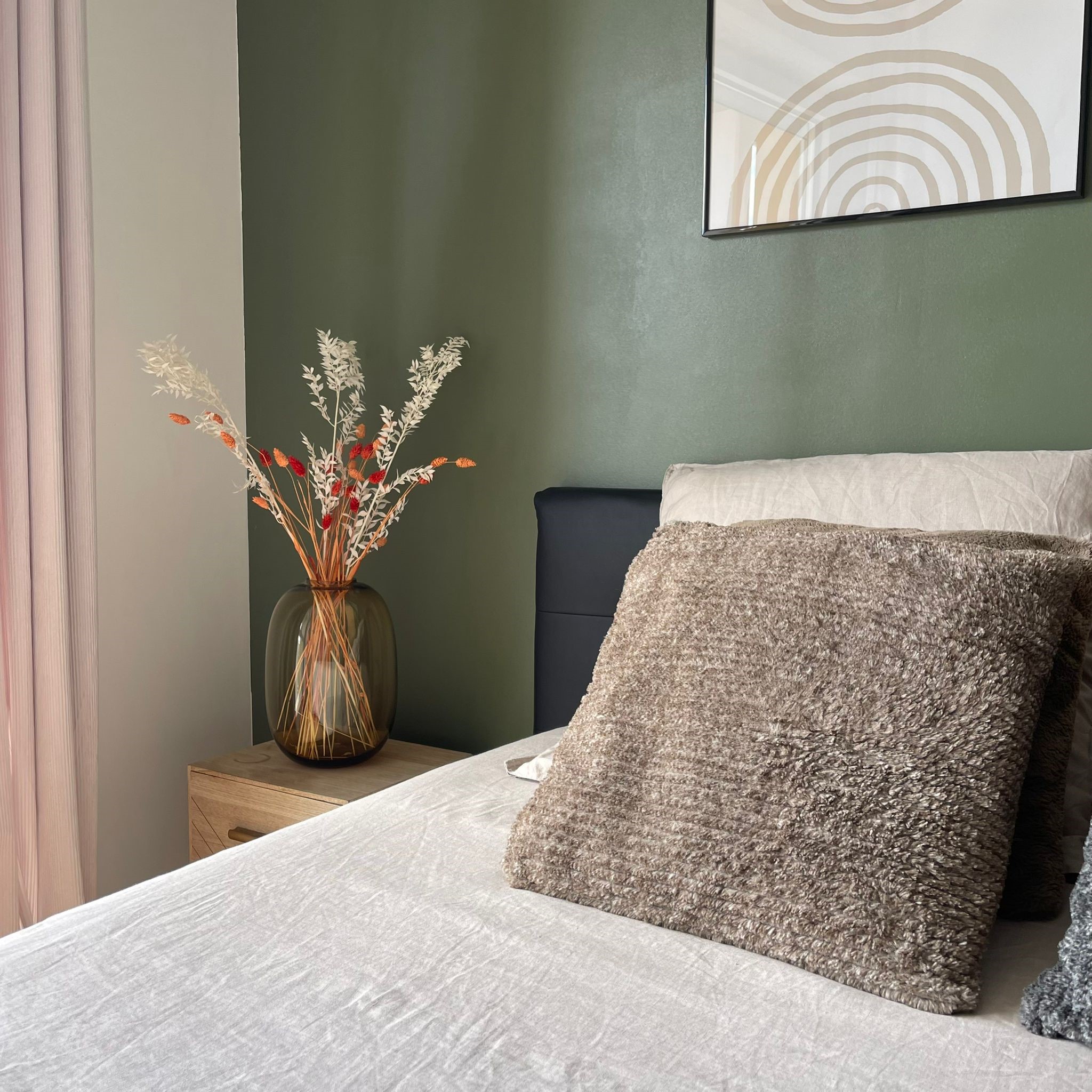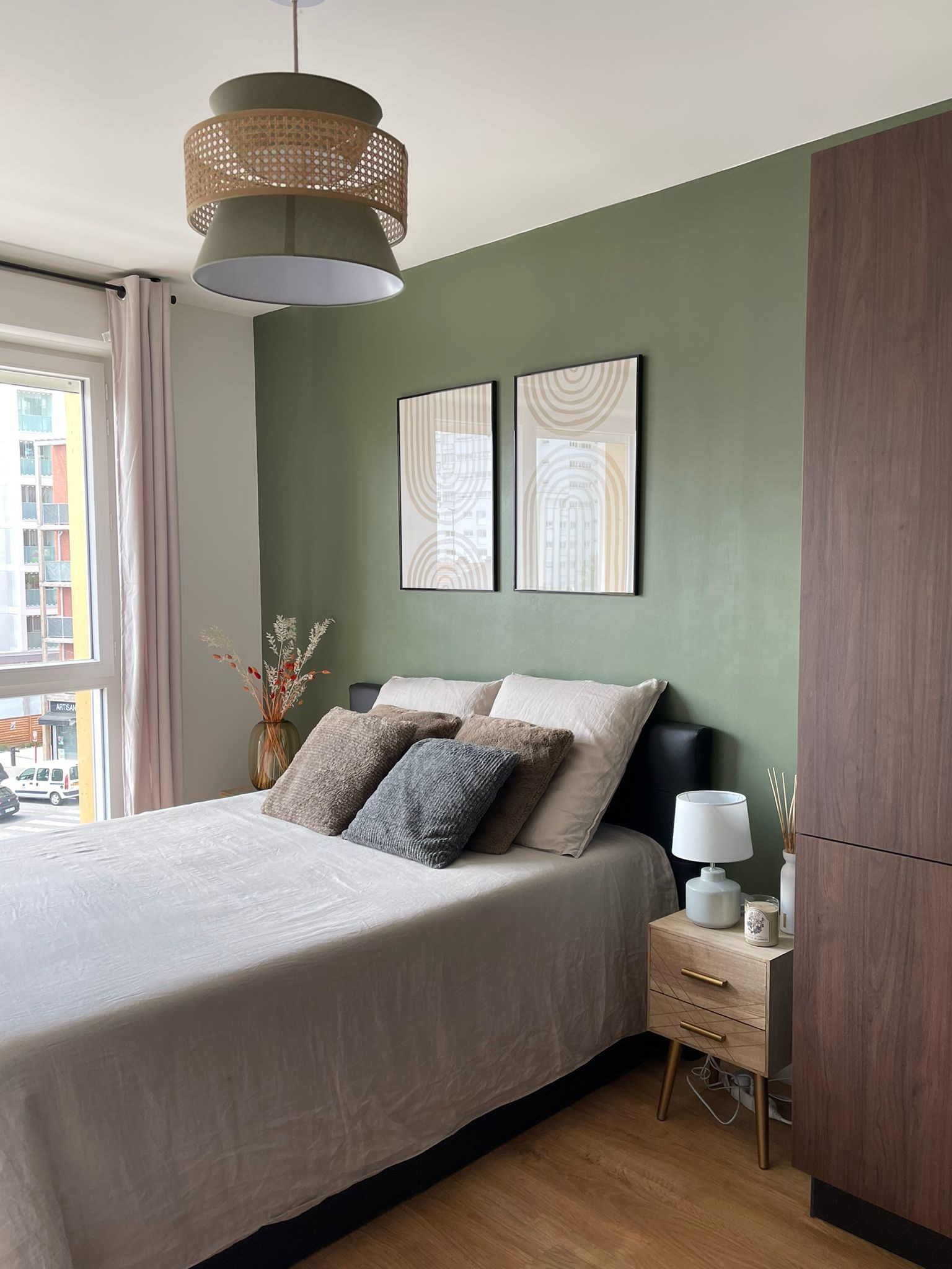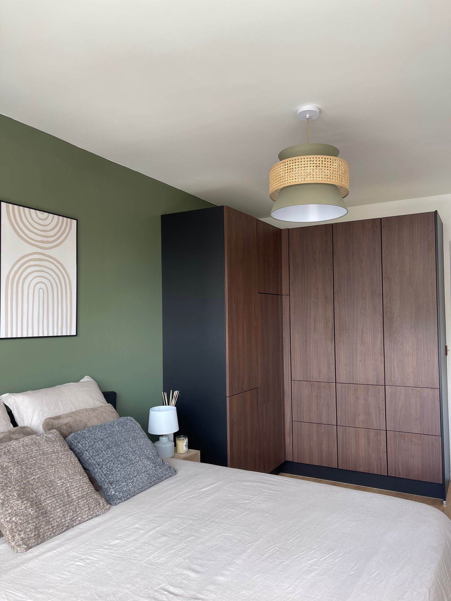 Côté chambre, c’était la page blanche. Le point de départ était le lit foncé que le client souhaitait récupérer de son ancien appartement. Par ailleurs, il aime beaucoup la mode et rêvait d’un grand dressing pour ranger ses nombreux vêtements et chaussures. J’ai donc dessiné ce grand dressing en angle dans l’espace le plus sombre de la pièce, tout de suite en entrant, à côté de la salle de bain. La couleur a été choisie en accord avec celle du lit que l’on a placé côté fenêtre pour profiter de la lumière naturelle. Afin d’éclaircir le décor et rendre la pièce plus chaleureuse, le choix s’est porté sur un vert kaki et des touches de bois clair et rotin, assortis d’un linge de lit et de rideaux dans les tons de beige.