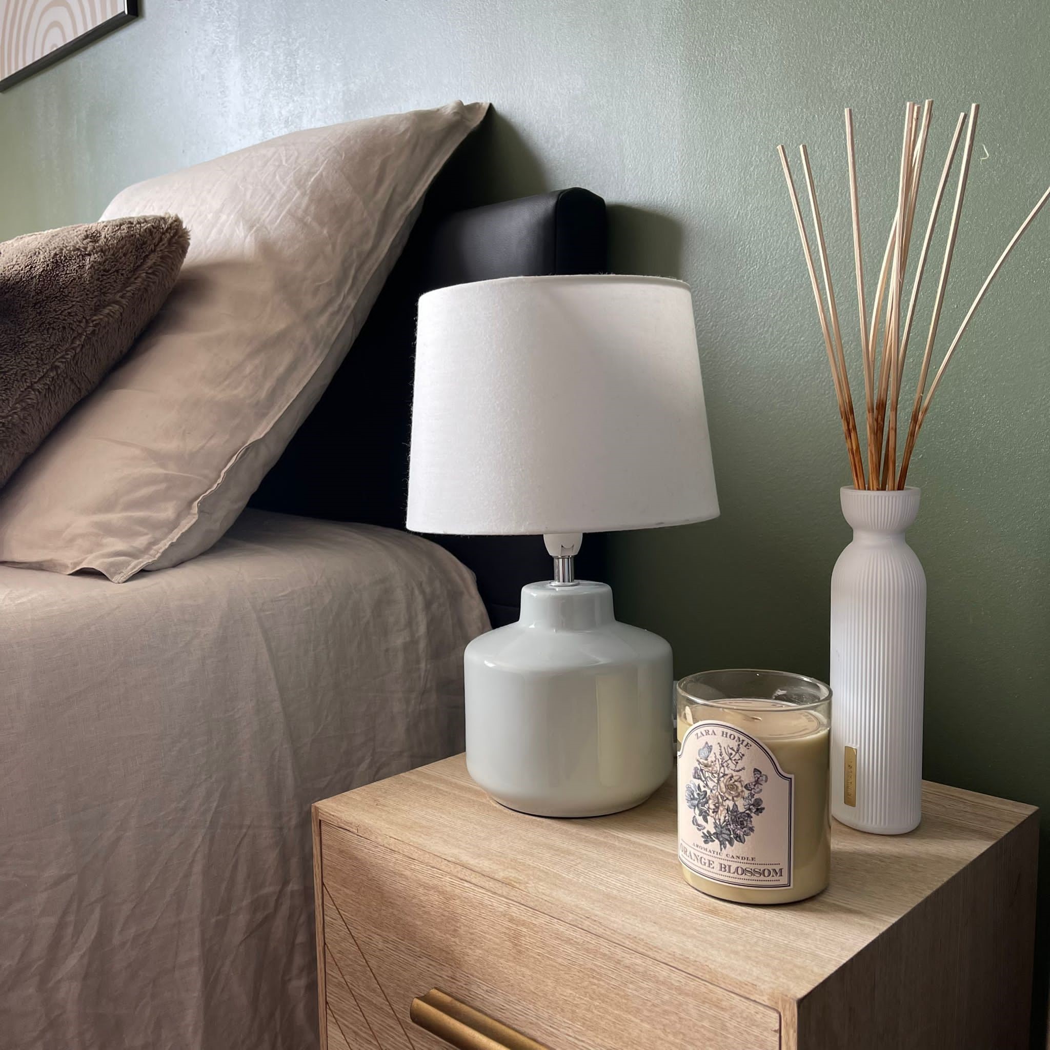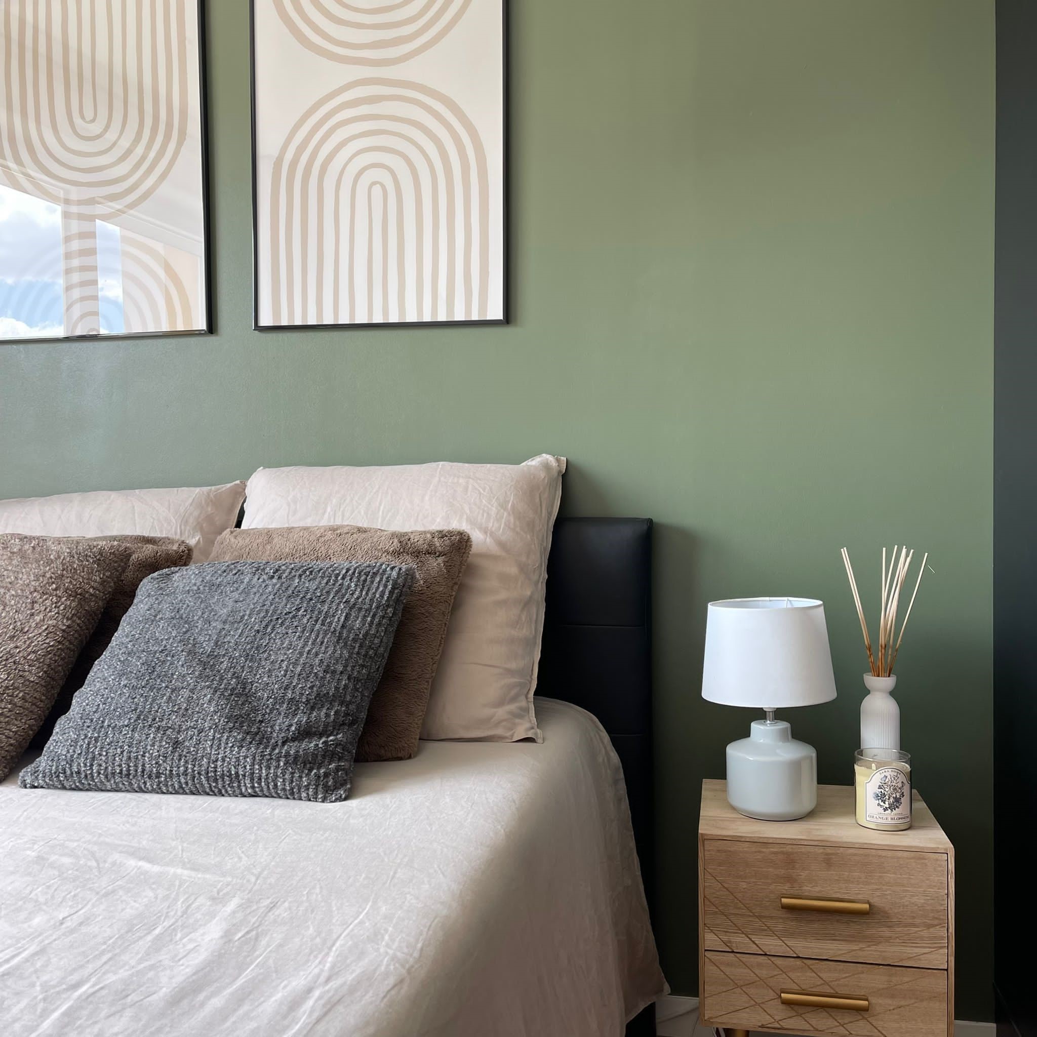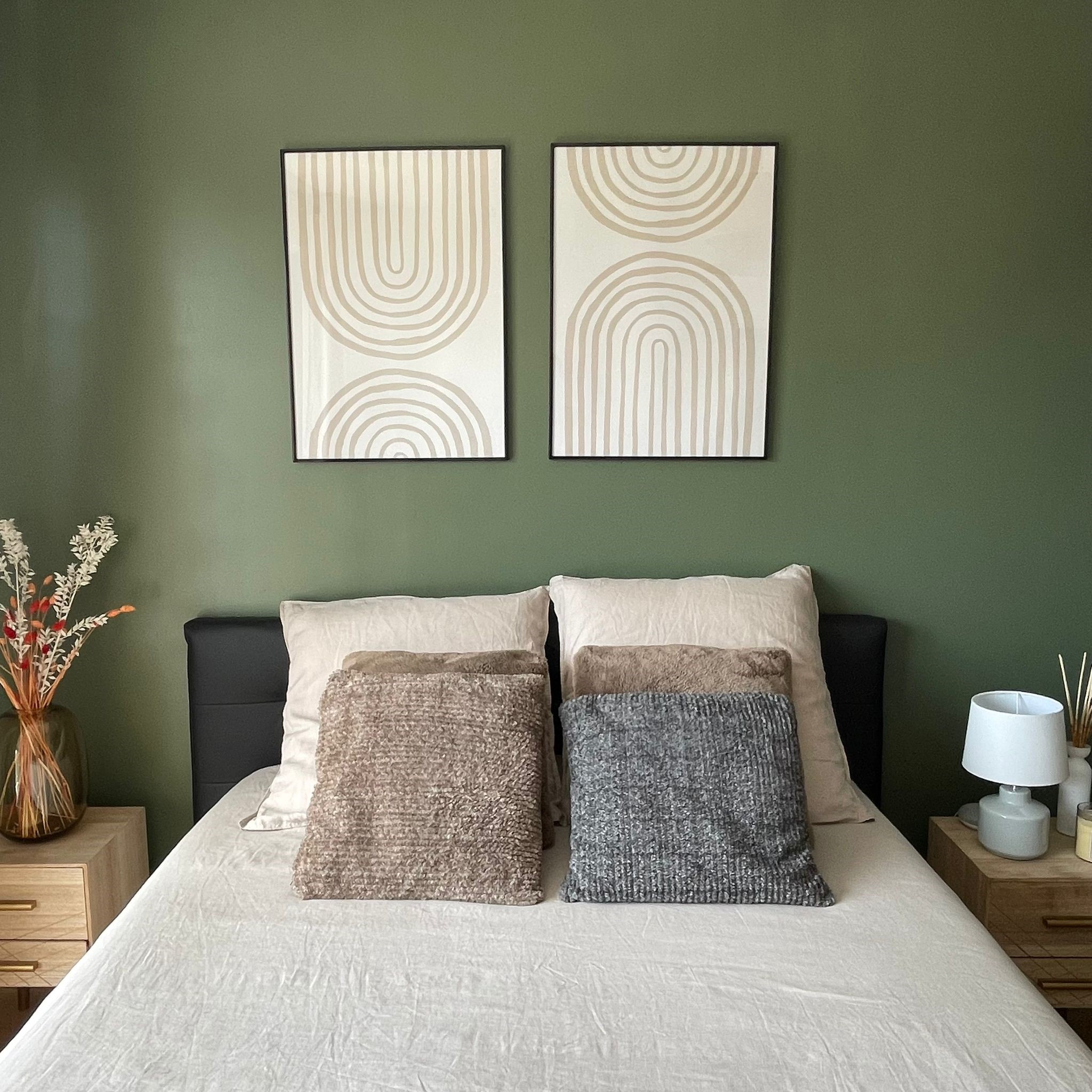 Côté chambre, c’était la page blanche. Le point de départ était le lit foncé que le client souhaitait récupérer de son ancien appartement. Par ailleurs, il aime beaucoup la mode et rêvait d’un grand dressing pour ranger ses nombreux vêtements et chaussures. J’ai donc dessiné ce grand dressing en angle dans l’espace le plus sombre de la pièce, tout de suite en entrant, à côté de la salle de bain. La couleur a été choisie en accord avec celle du lit que l’on a placé côté fenêtre pour profiter de la lumière naturelle. Afin d’éclaircir le décor et rendre la pièce plus chaleureuse, le choix s’est porté sur un vert kaki et des touches de bois clair et rotin, assortis d’un linge de lit et de rideaux dans les tons de beige.