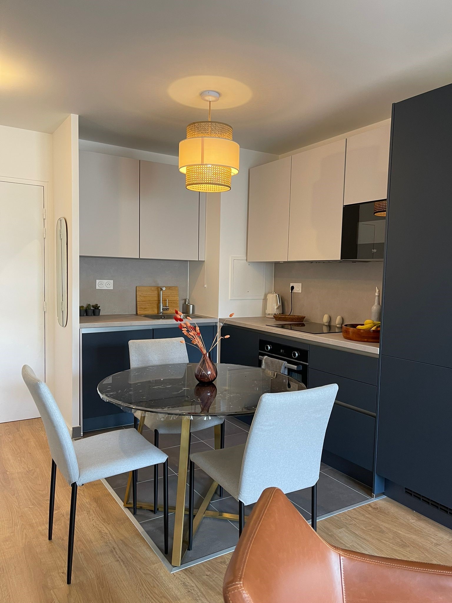 Quand on achète sur plans, il est important de solliciter 1 architecte d’intérieur assez tôt afin d’anticiper les choix de sols par exemple. Ici, je suis intervenue tard alors j’avais la contrainte des sols qui ne pouvaient plus changer. Or, le client souhaitait une vraie belle cuisine mais l’espace était déjà délimité par le carrelage gris au sol et toutes les prises étaient déjà positionnées alors il a fallu composer avec. Mon idée a été de proposer de lier l’espace repas et salon avec un mobilier assorti : la limite entre les 2 pièces devient floue et on en oublie un peu le sol. Selon le point de vue, on a au choix une grande cuisine ou un grand salon. Après tout, les cuisinistes font aussi des dressings et meubles de rangement.