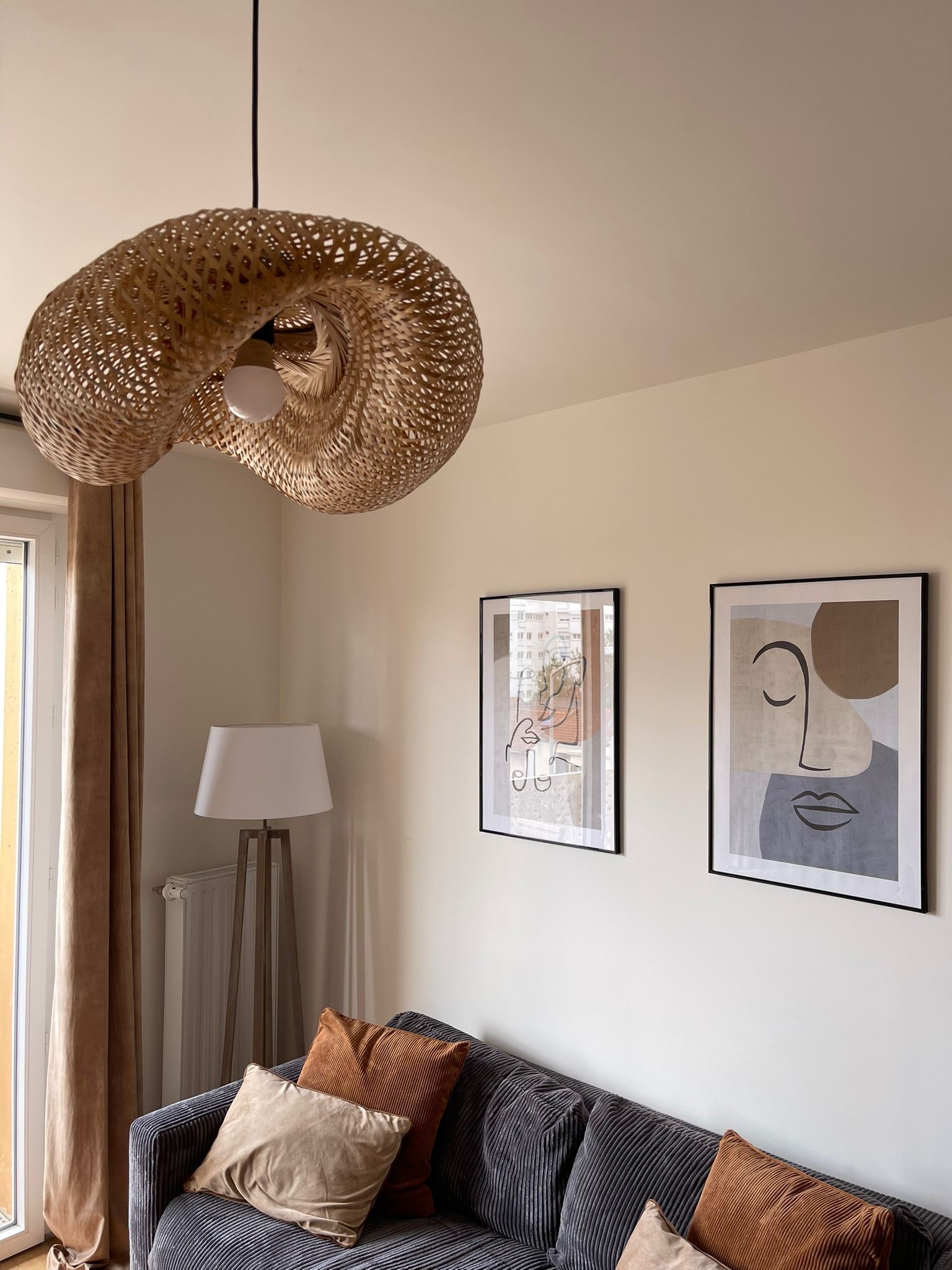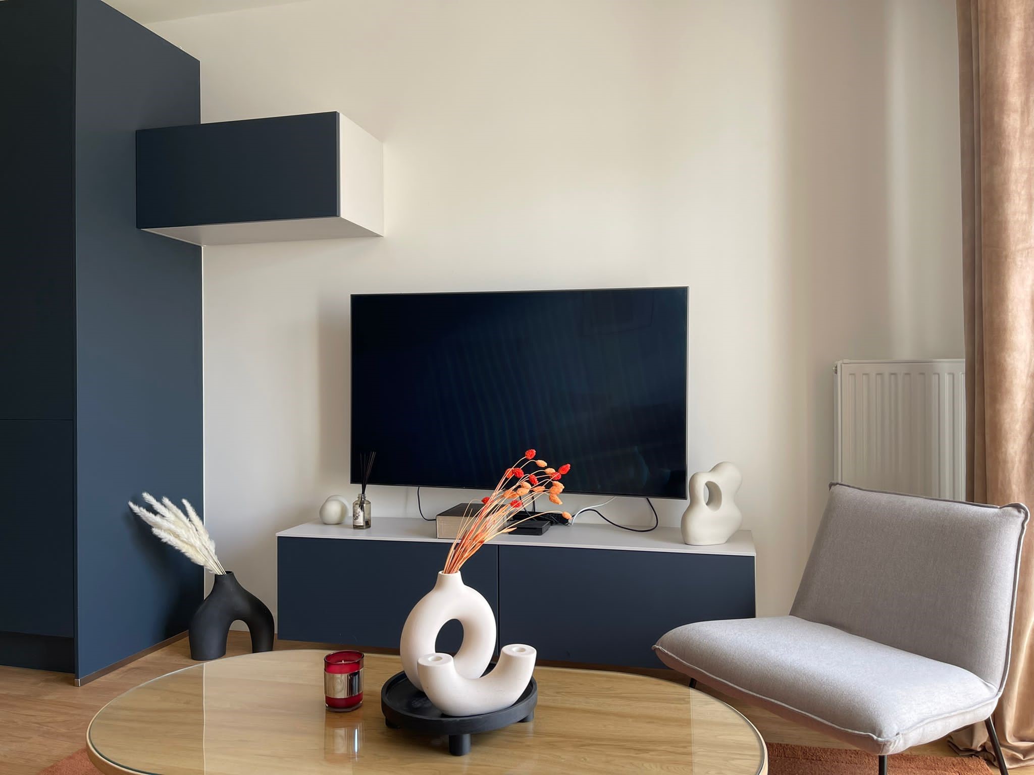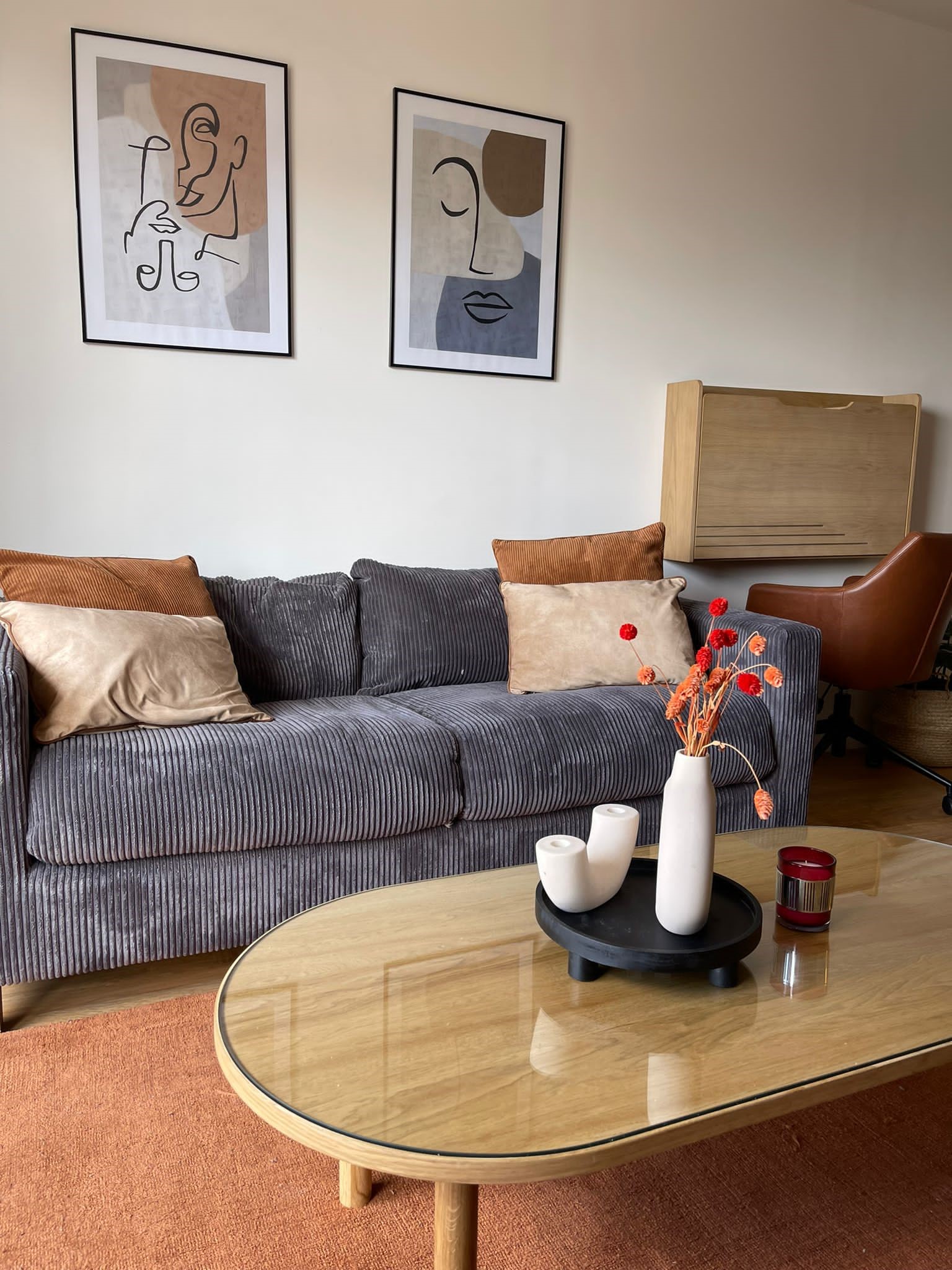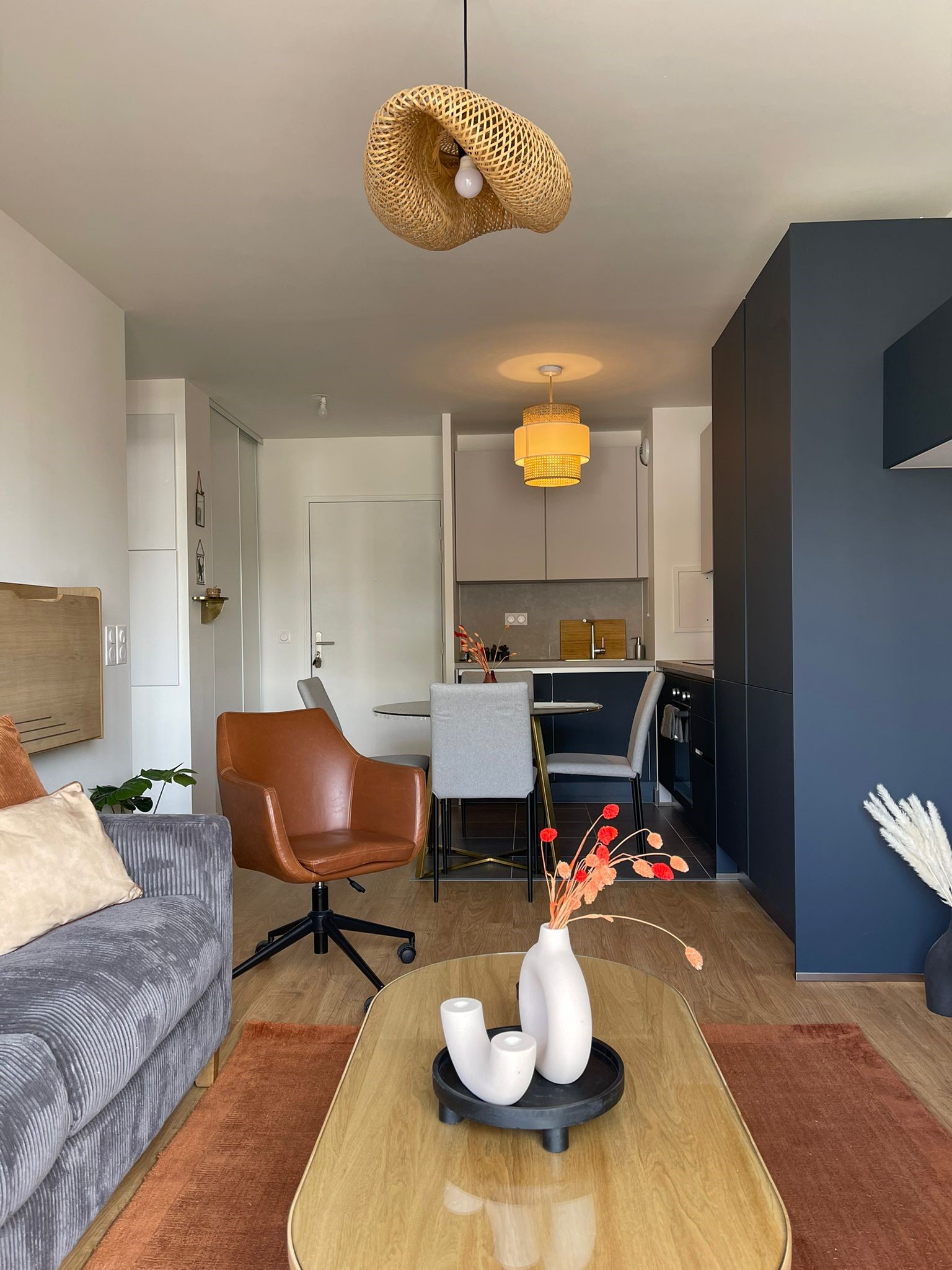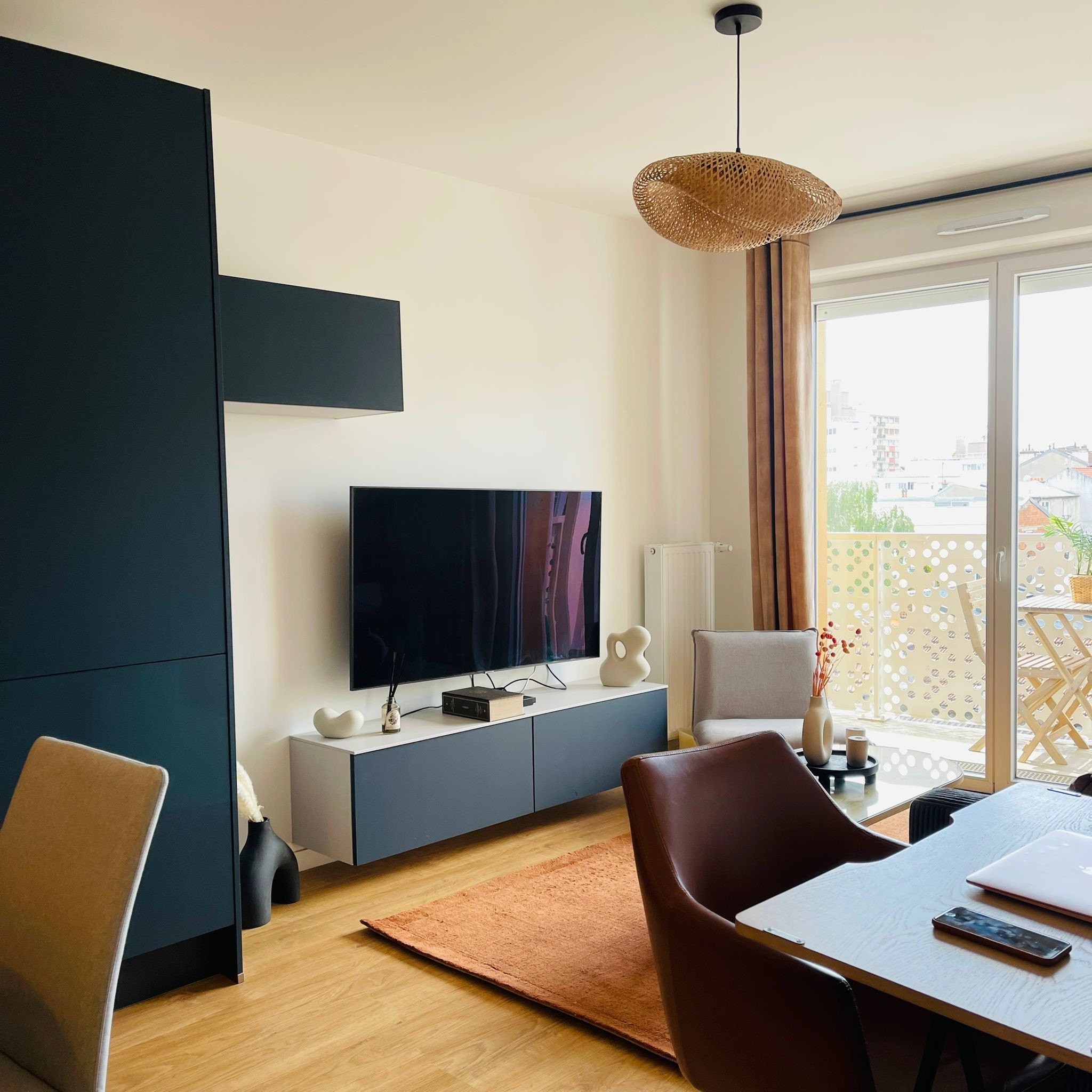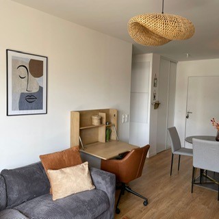 L’appartement est assez petit mais un bureau escamotable a été installé à côté du canapé car le propriétaire fait régulièrement du télétravail. Un joli fauteuil de bureau permet de travailler confortablement et offre une assise supplémentaire pour les invités.
