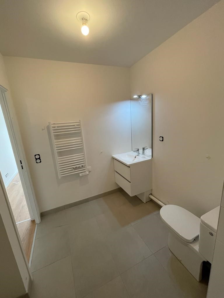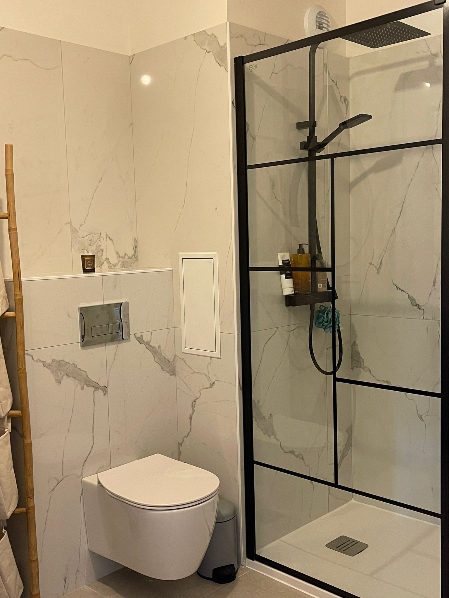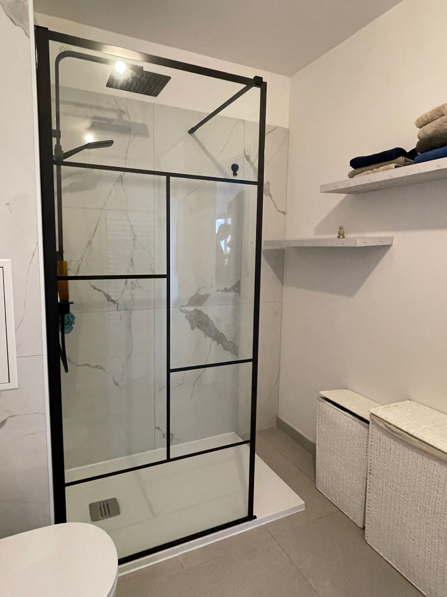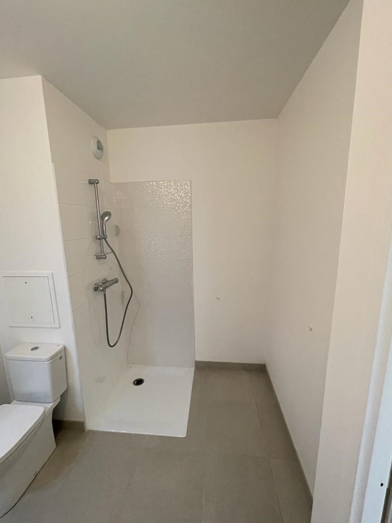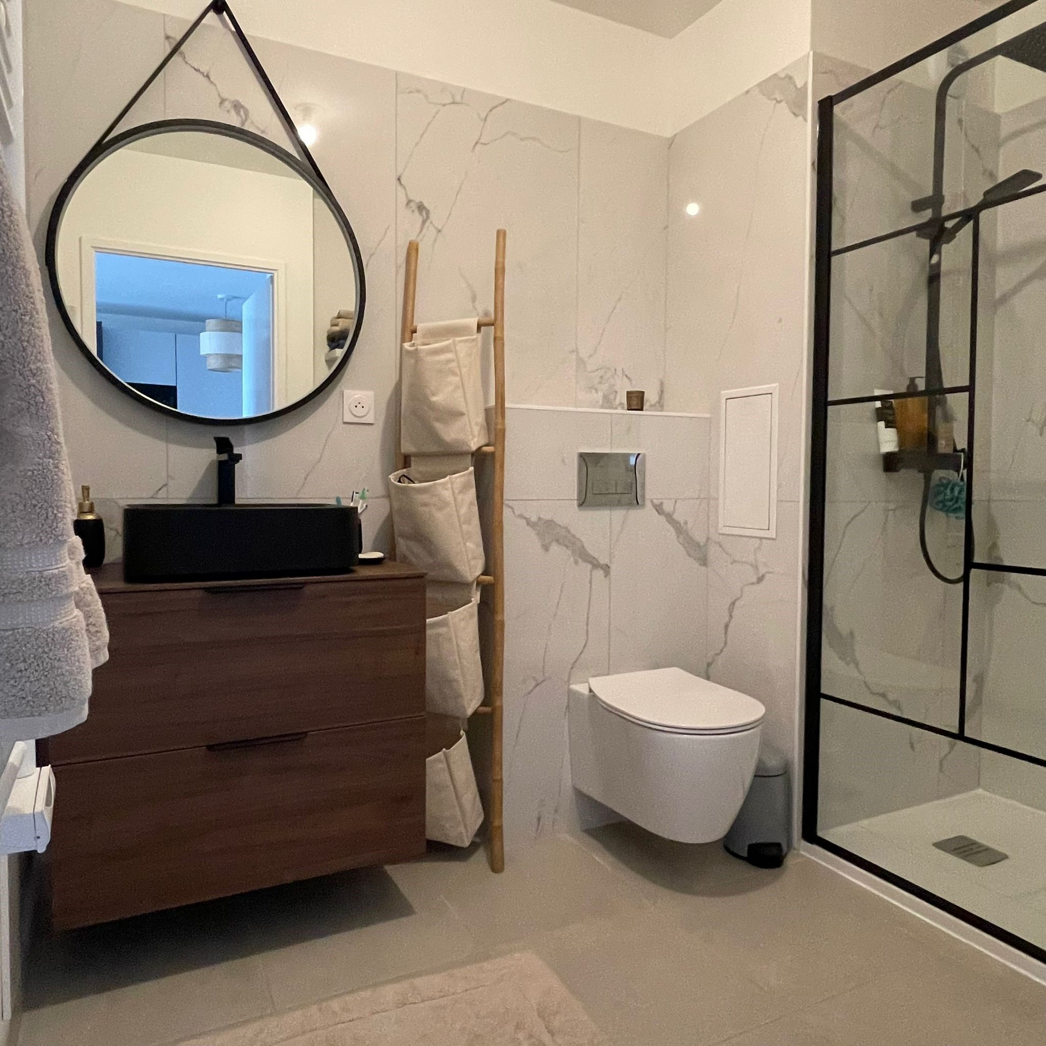 La salle de bain a été conçue dans les normes PMR (Personnes à Mobilité Réduite) ; c’est comme ça dans les appartements neufs donc elles ne sont pas forcément optimisées. La douche était petite et les WC mal orientés. Le meuble vasque, très basique était coincé dans l’angle. Ici le sol a été conservé et la pièce a subi un bon relooking avec un nouveau carrelage mural, une plus grande douche, un WC désormais suspendu et qui a tourné de 90° et un meuble vasque plus cossu.