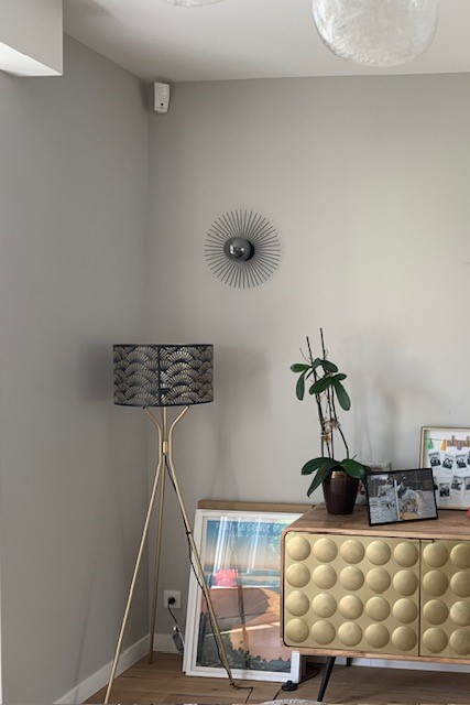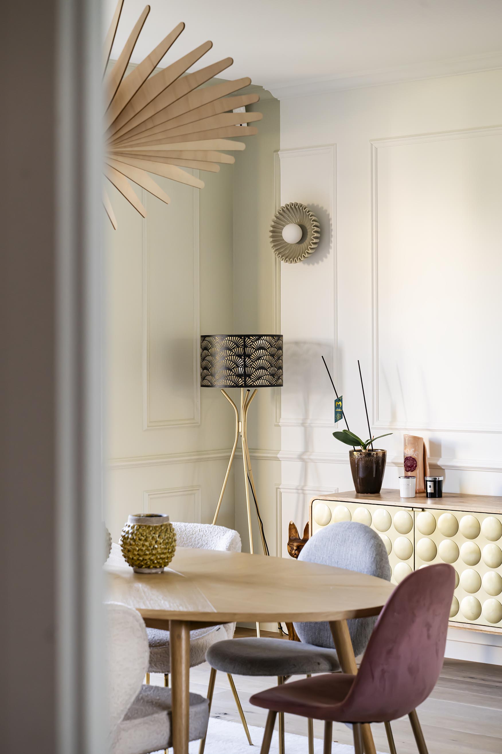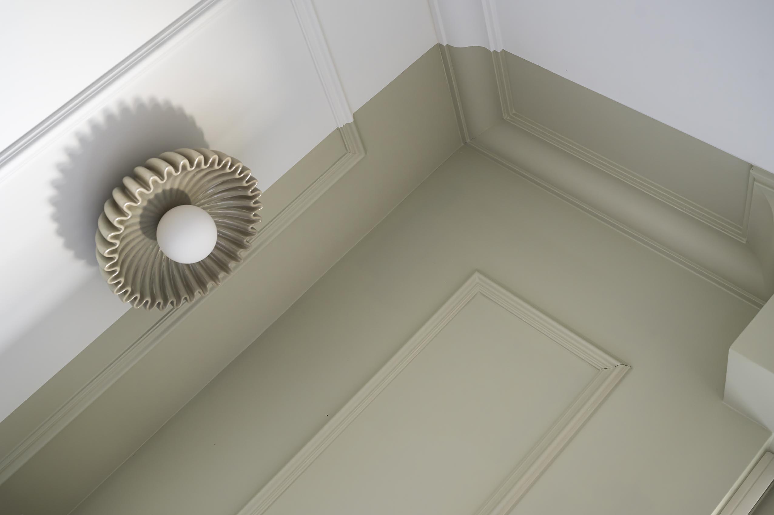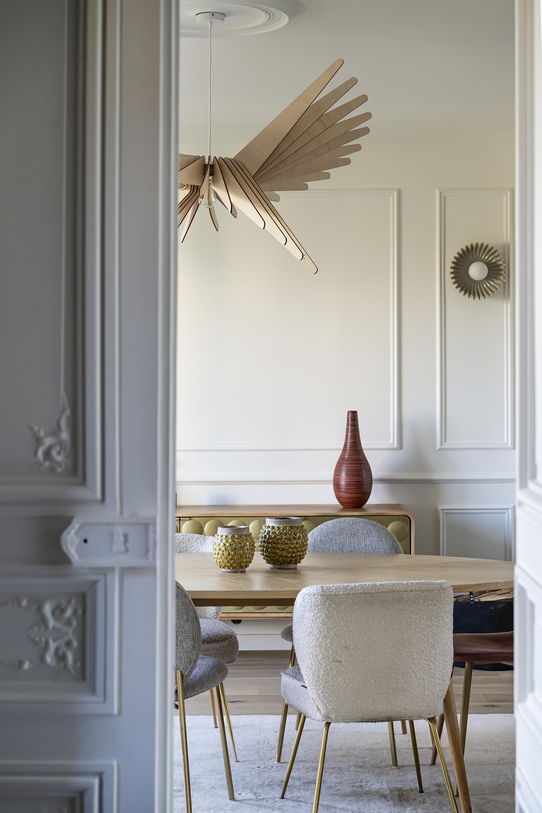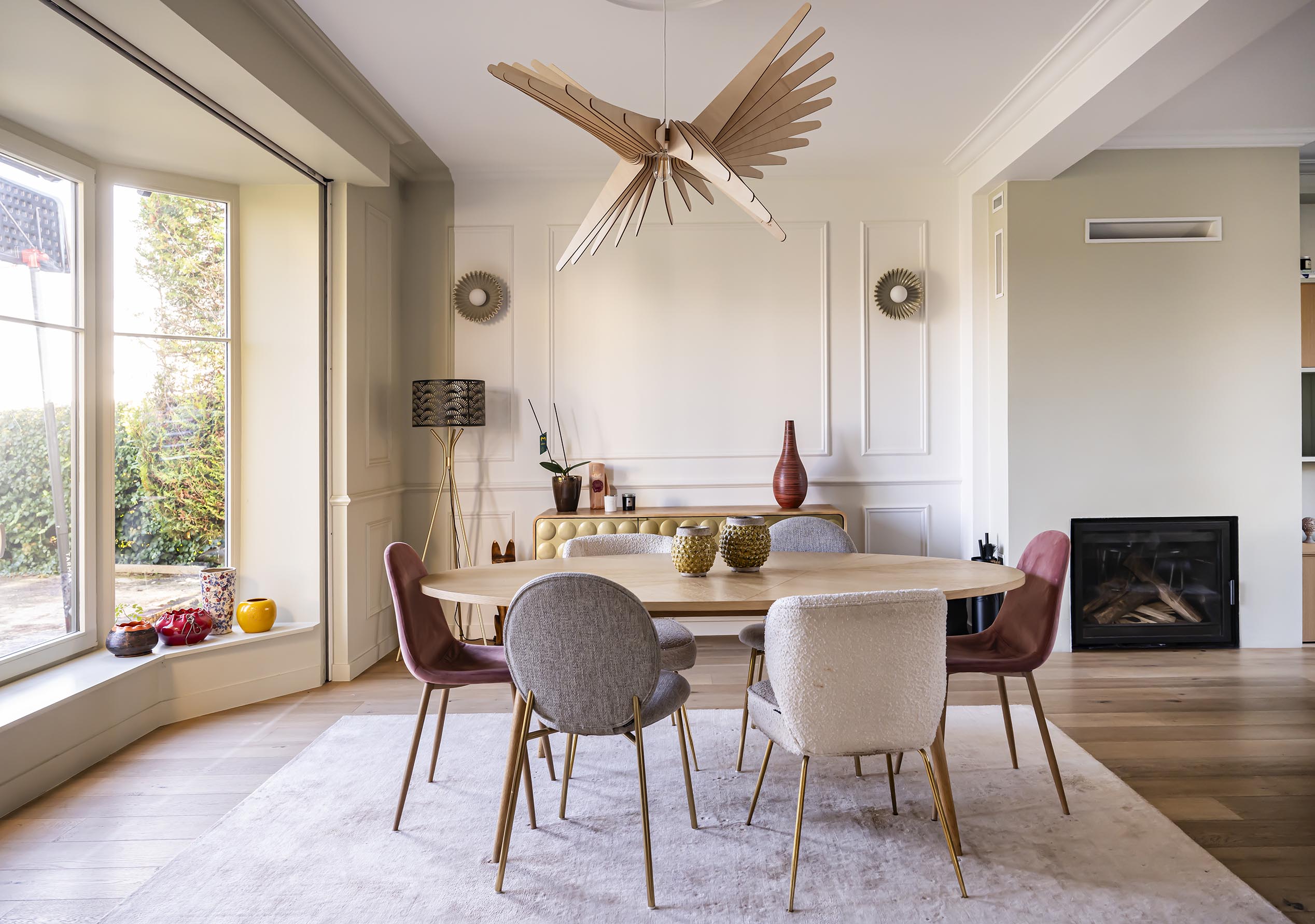 Ici, nous avons récupéré pas mal de meubles des clients et j’en ai tenu compte (notamment de leurs dimensions et de leurs emplacements) pour recréer les nouvelles moulures murales, avec des dessins plus dans l’air du temps et qui permettent d’asseoir le mobilier. Cet effet plus moderne des moulures est accentué par les peintures. En effet, la zone de couleur vert de gris qui met en valeur le bow-window, coupe le rectangle des moulures de façon presque aléatoire et est en accord parfait avec les appliques murales en céramique, mises en valeur dans les cadres moulurés. Une jolie suspension met en valeur le volume de la pièce et un tapis vient délimiter la zone repas de façon chaleureuse.
