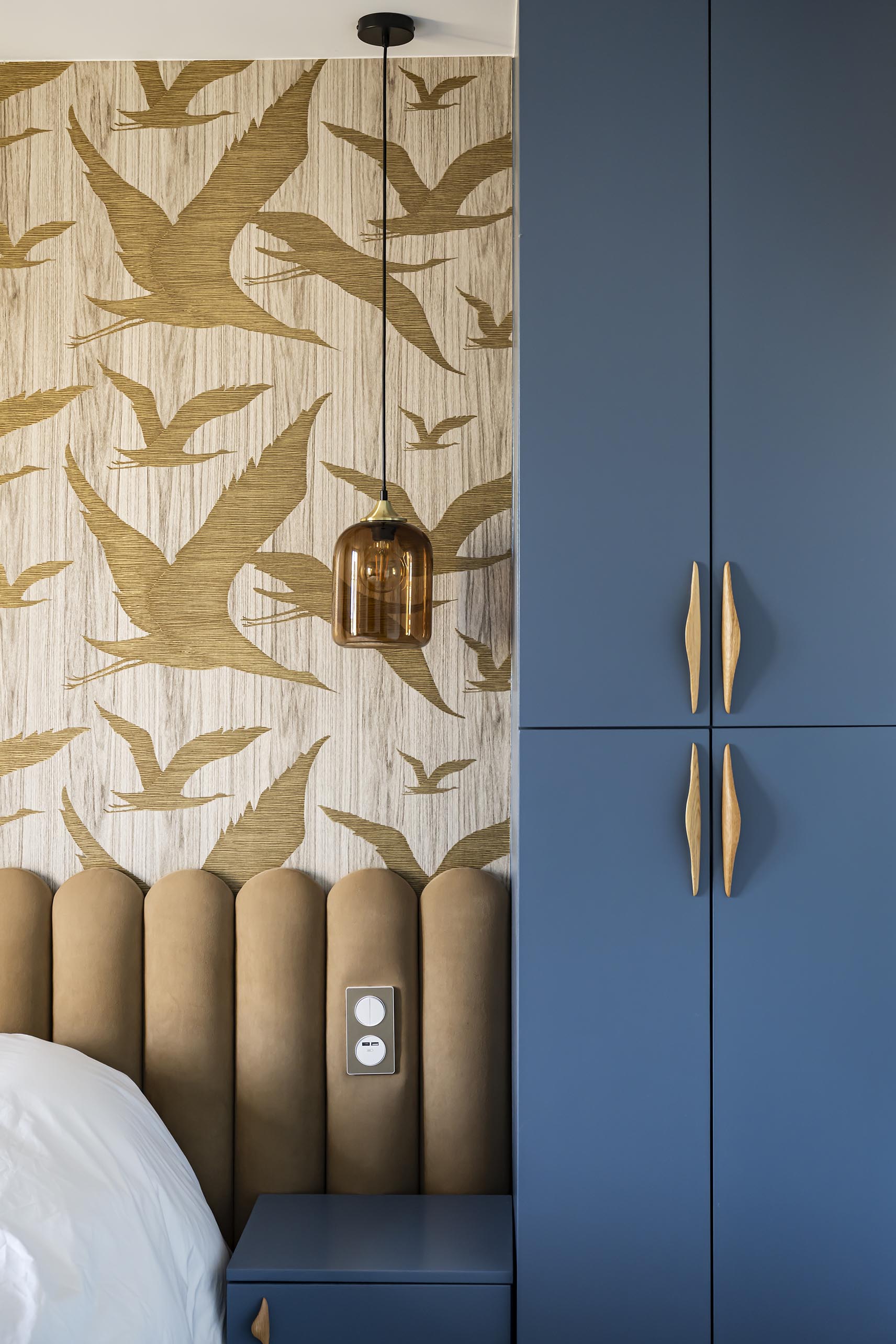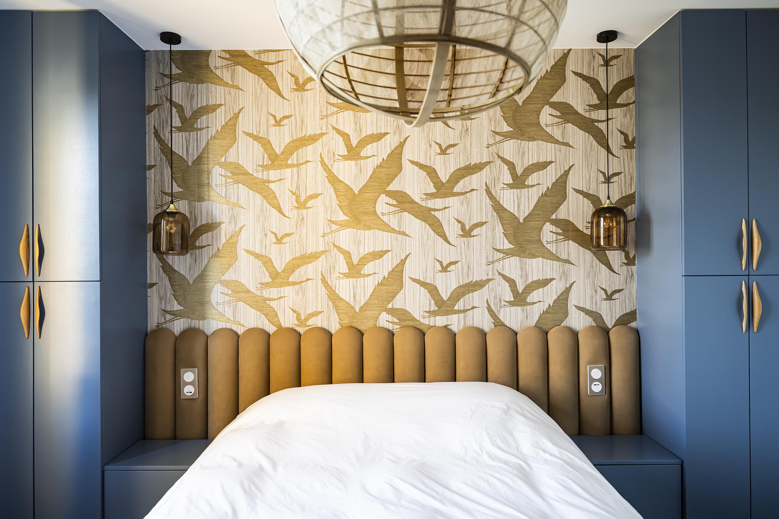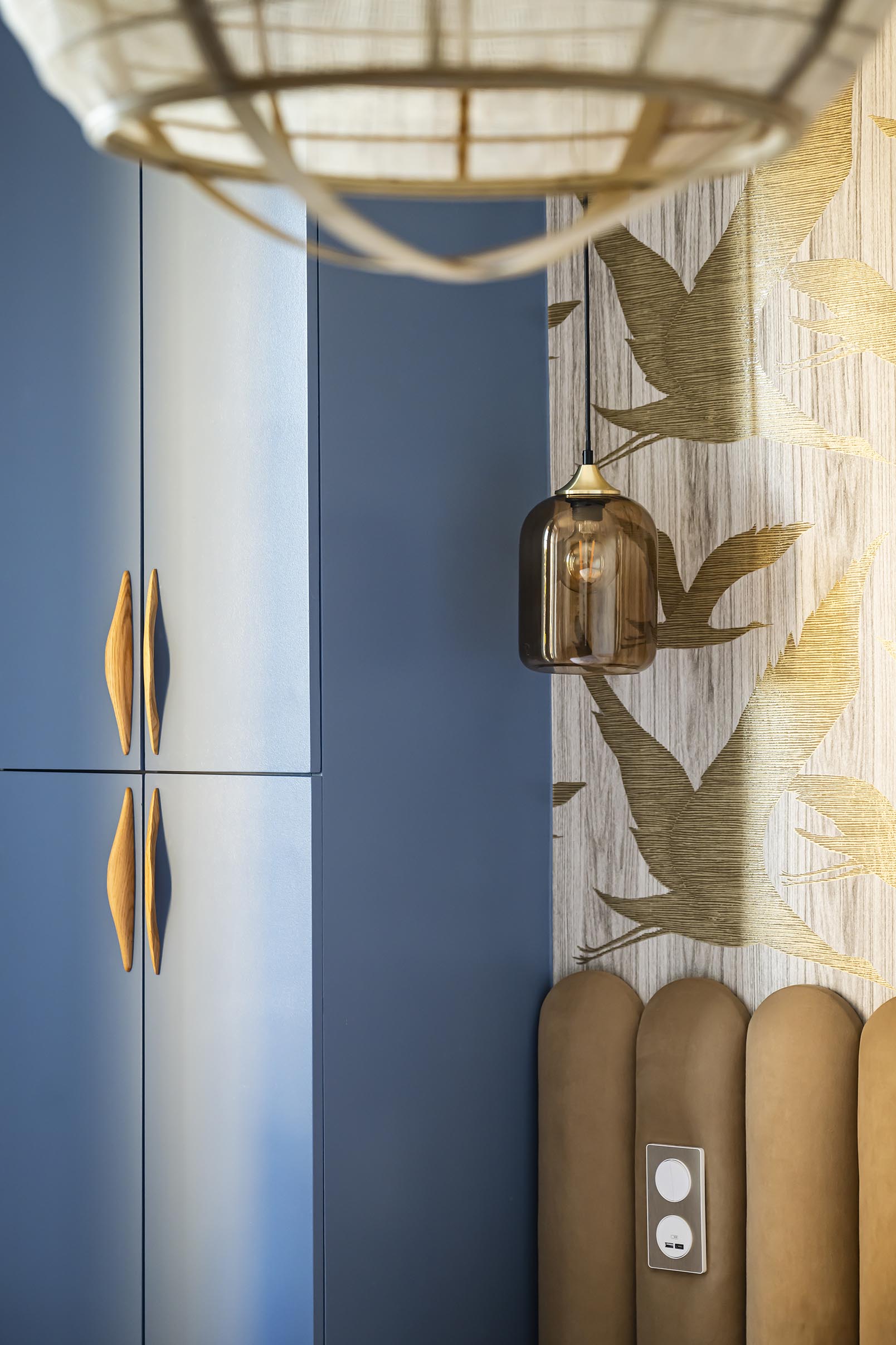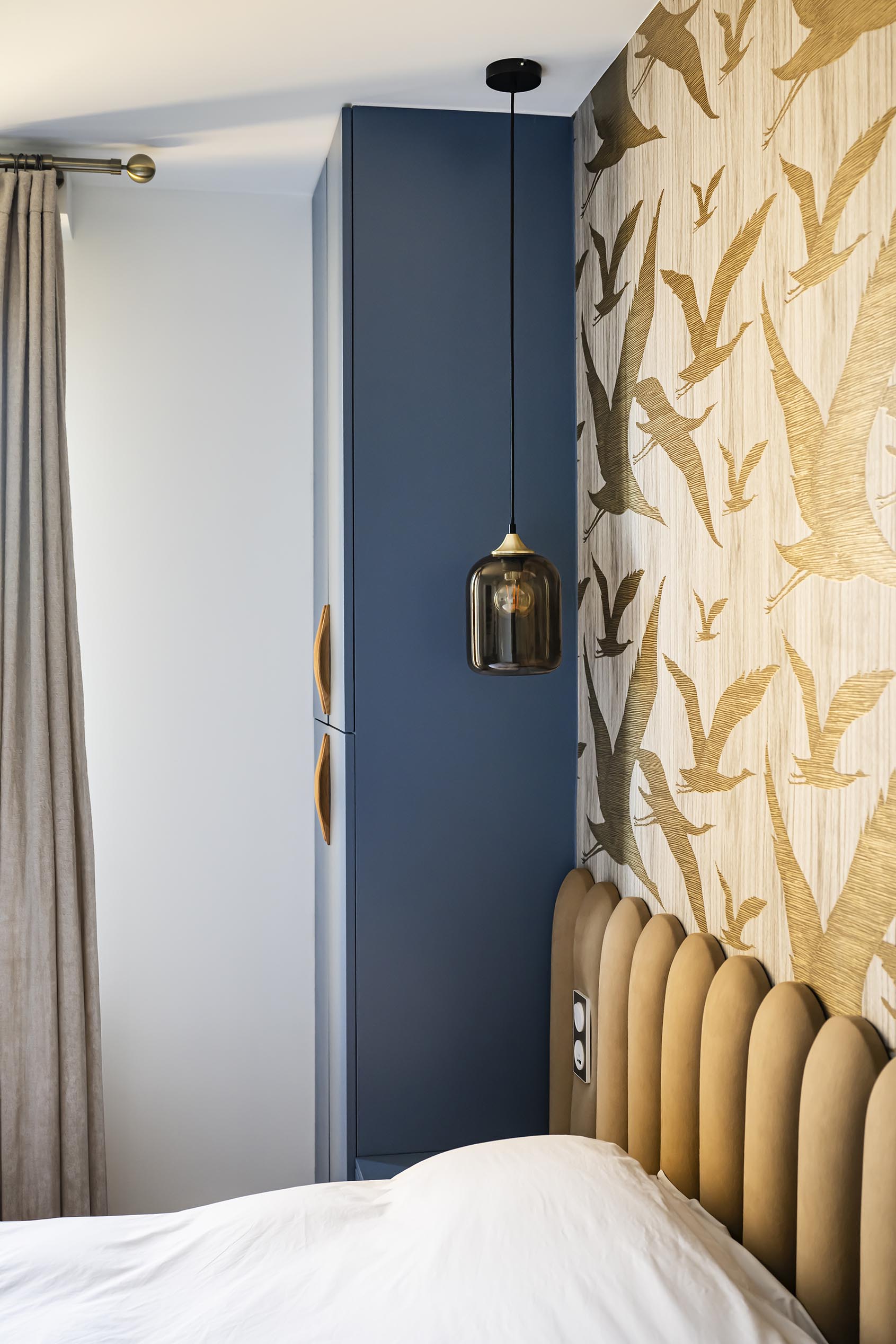 Changement de décor dans la chambre parentale même si on a conservé le doré du rez-de-chaussée avec ce revêtement mural aux reflets dorés, qui invite à l’évasion. On a choisi ici l’association du beige dans tous ses états (papier peint, revêtement de la tête de lit, poignées en bois, suspension en lin et bambou, rideaux…) avec un bleu profond qui recouvre les placards et chevets réalisés sur-mesure pour encadrer le lit et apporter à la fois du cachet et du rangement supplémentaire. Le point de départ dans cette pièce a été le bleu des commodes que les clients possédaient déjà et dont la teinte apaisante leur plaisait énormément. Nous l’avons donc reportée sur la menuiserie.