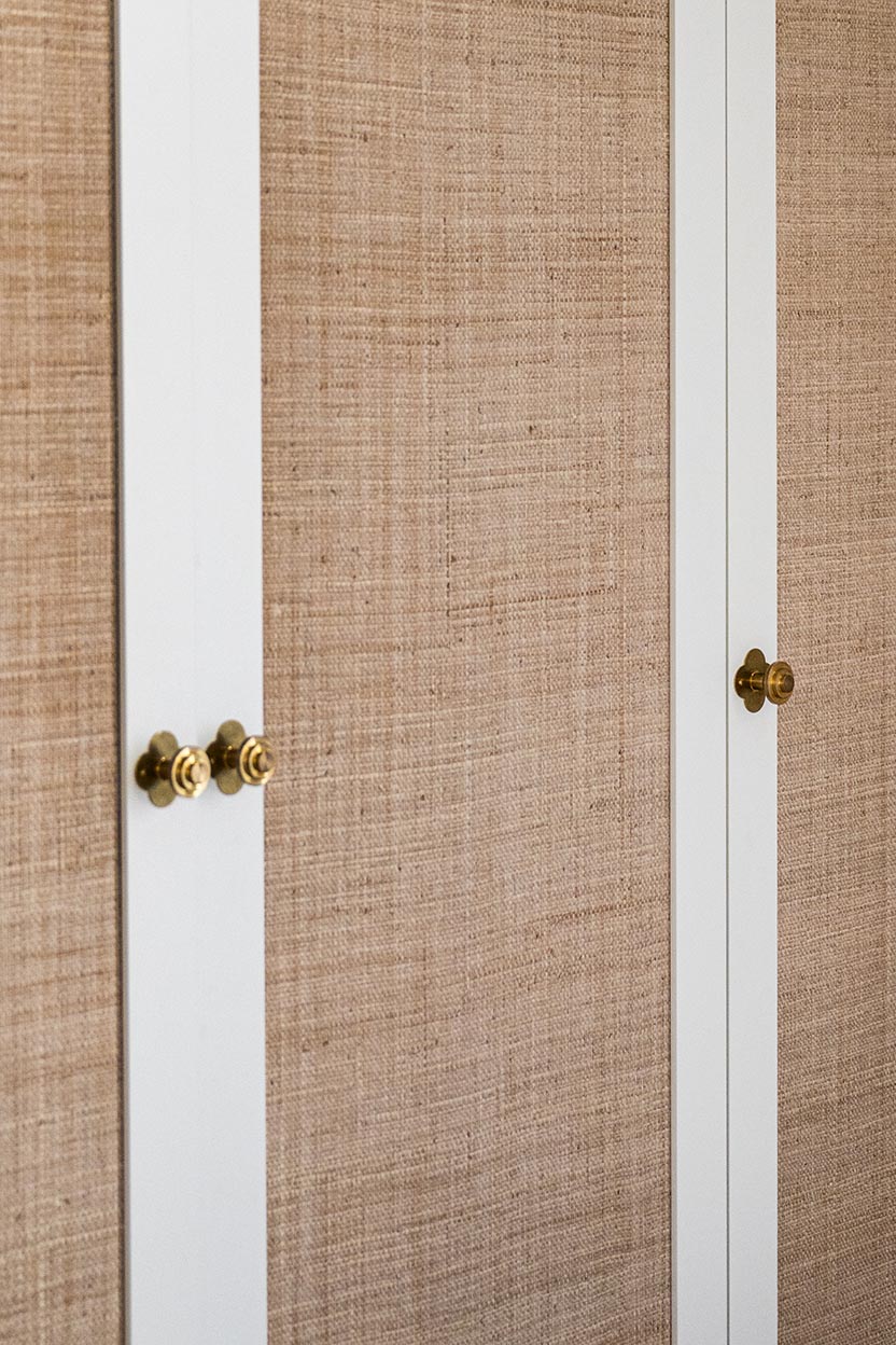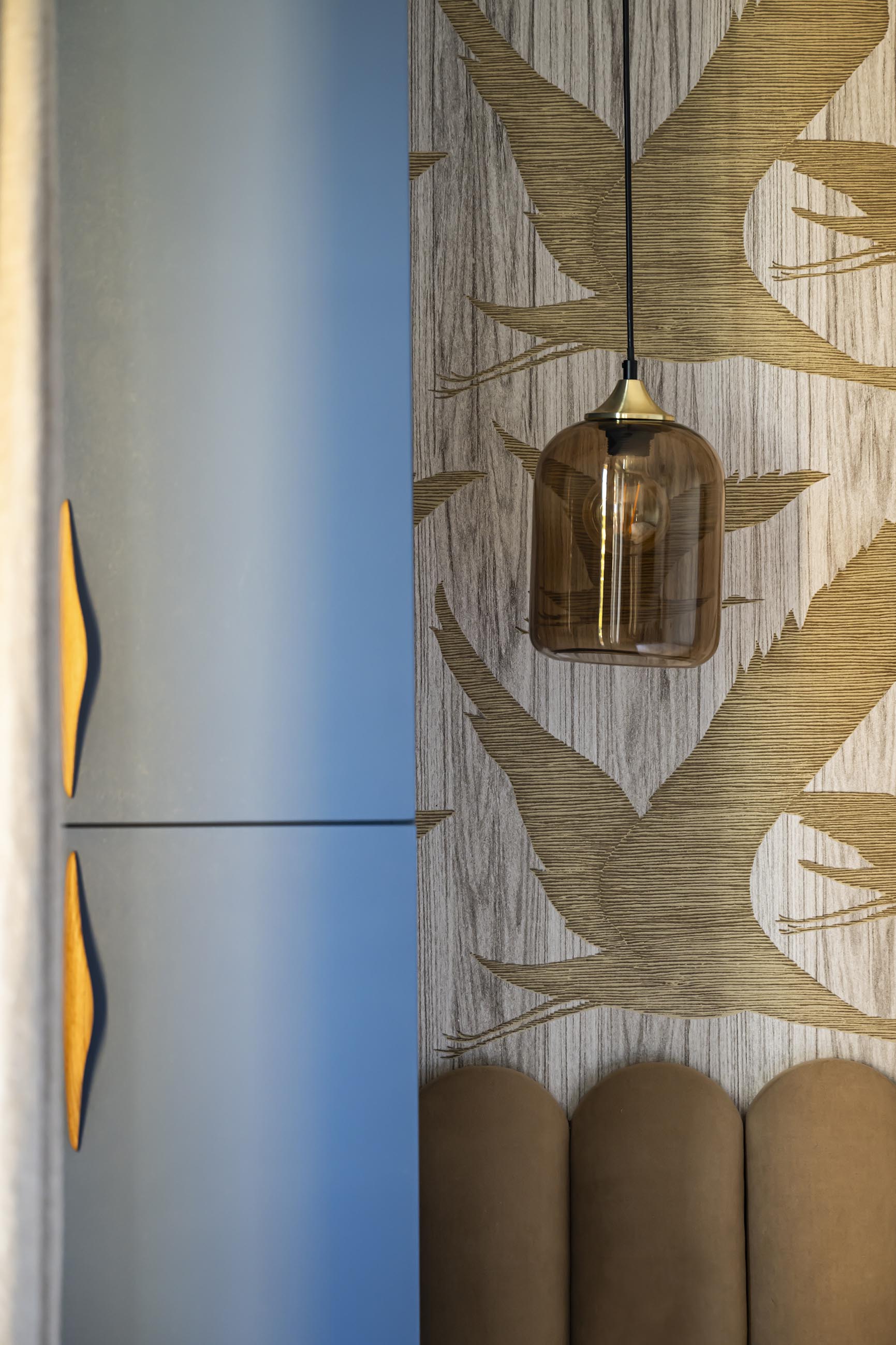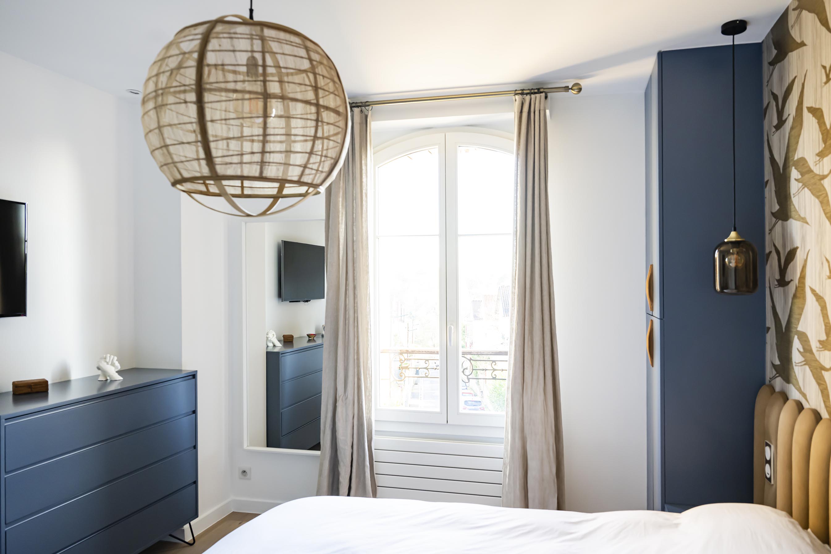 Changement de décor dans la chambre parentale même si on a conservé le doré du rez-de-chaussée avec ce revêtement mural aux reflets dorés, qui invite à l’évasion. On a choisi ici l’association du beige dans tous ses états (papier peint, revêtement de la tête de lit, poignées en bois, suspension en lin et bambou, rideaux…) avec un bleu profond qui recouvre les placards et chevets réalisés sur-mesure pour encadrer le lit et apporter à la fois du cachet et du rangement supplémentaire. Le point de départ dans cette pièce a été le bleu des commodes que les clients possédaient déjà et dont la teinte apaisante leur plaisait énormément. Nous l’avons donc reportée sur la menuiserie.