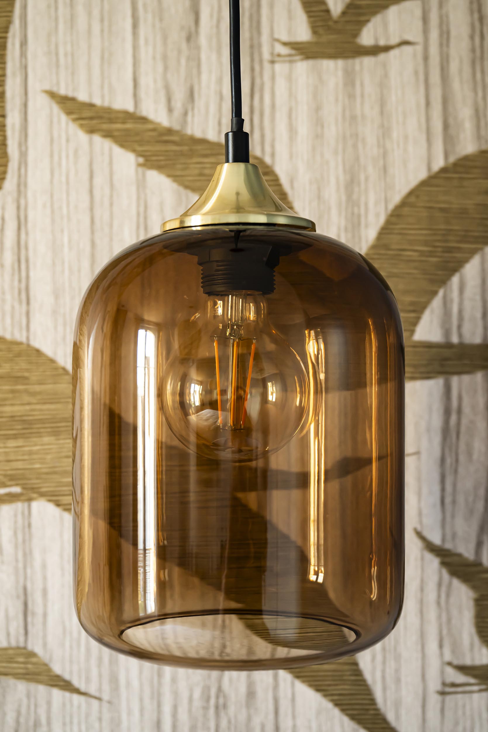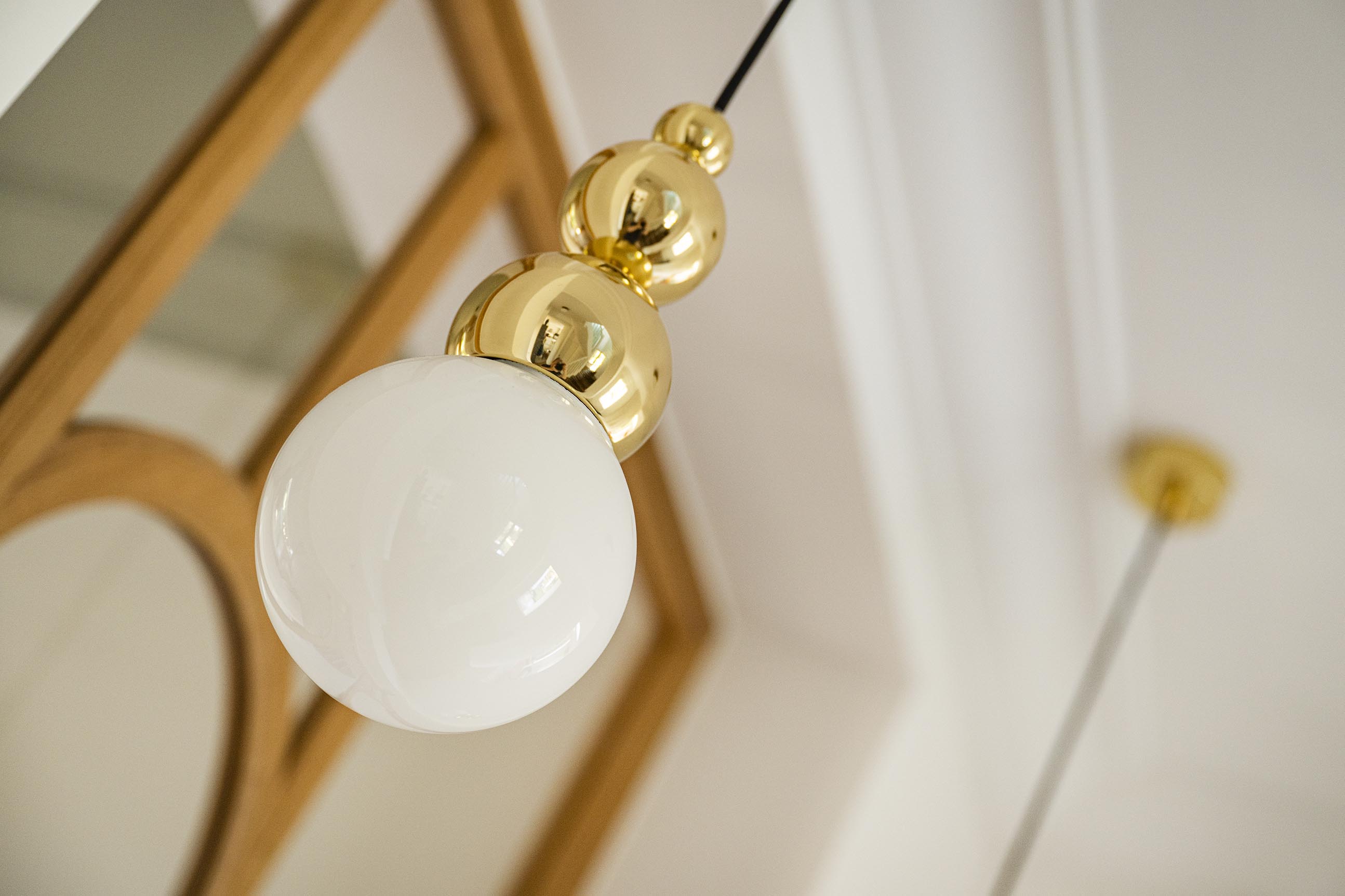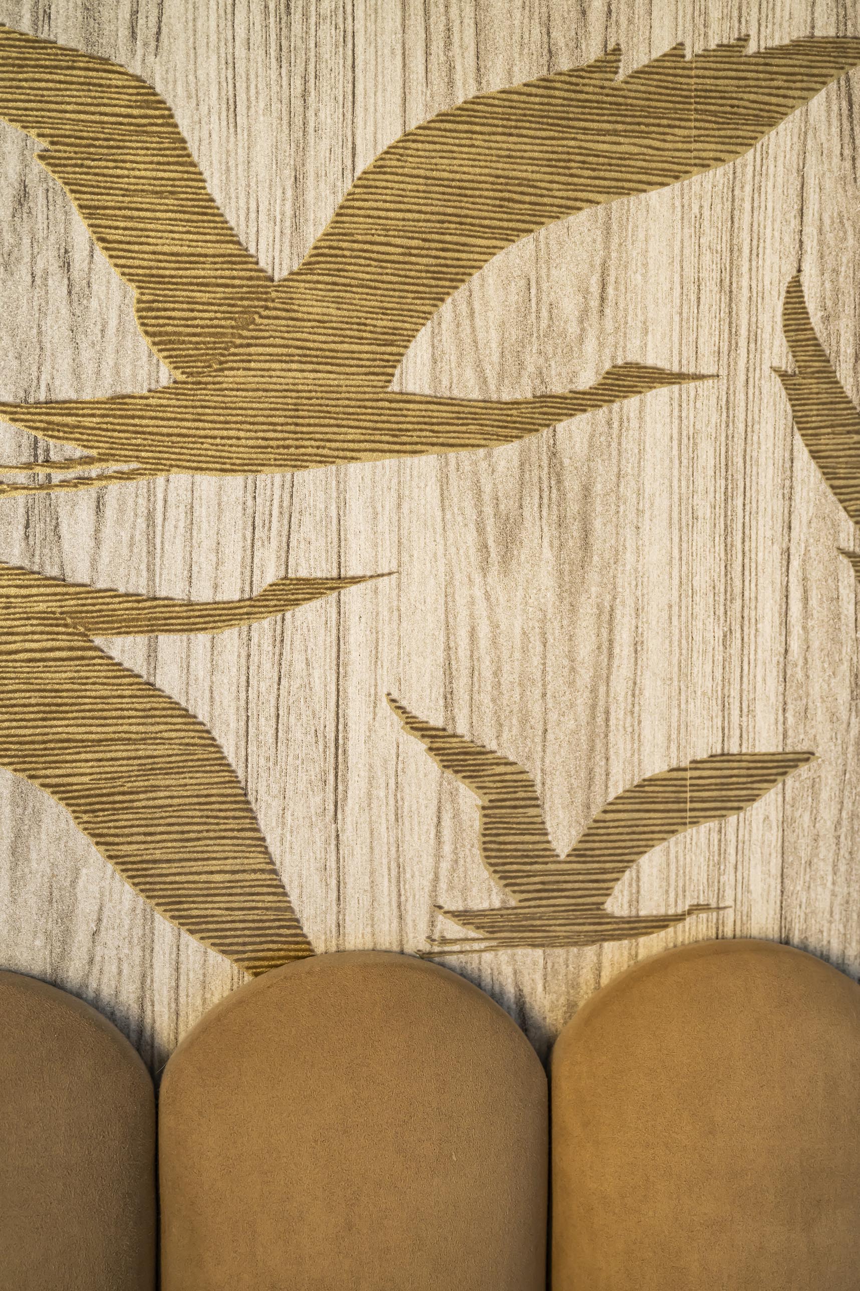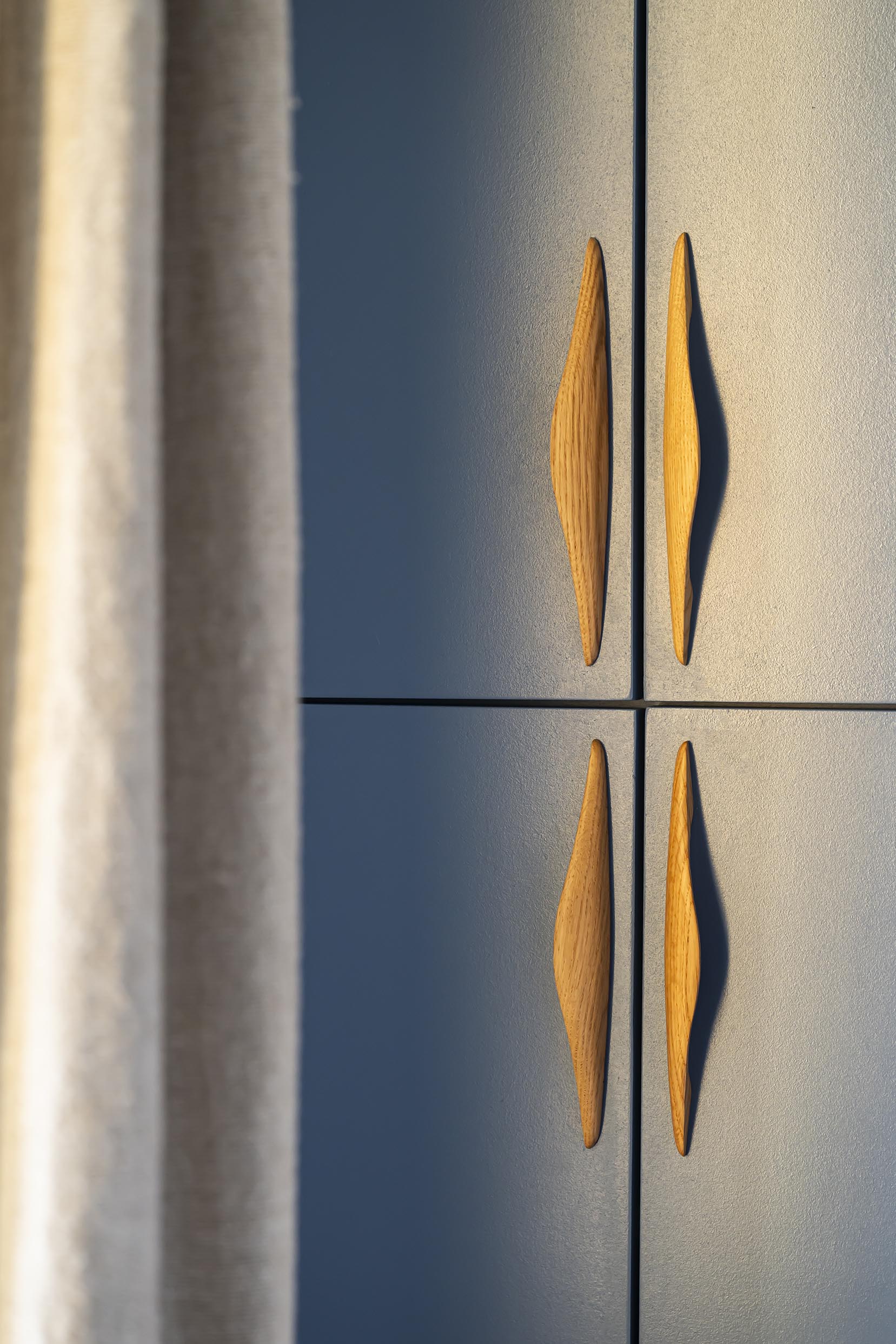 Changement de décor dans la chambre parentale même si on a conservé le doré du rez-de-chaussée avec ce revêtement mural aux reflets dorés, qui invite à l’évasion. On a choisi ici l’association du beige dans tous ses états (papier peint, revêtement de la tête de lit, poignées en bois, suspension en lin et bambou, rideaux…) avec un bleu profond qui recouvre les placards et chevets réalisés sur-mesure pour encadrer le lit et apporter à la fois du cachet et du rangement supplémentaire. Le point de départ dans cette pièce a été le bleu des commodes que les clients possédaient déjà et dont la teinte apaisante leur plaisait énormément. Nous l’avons donc reportée sur la menuiserie.