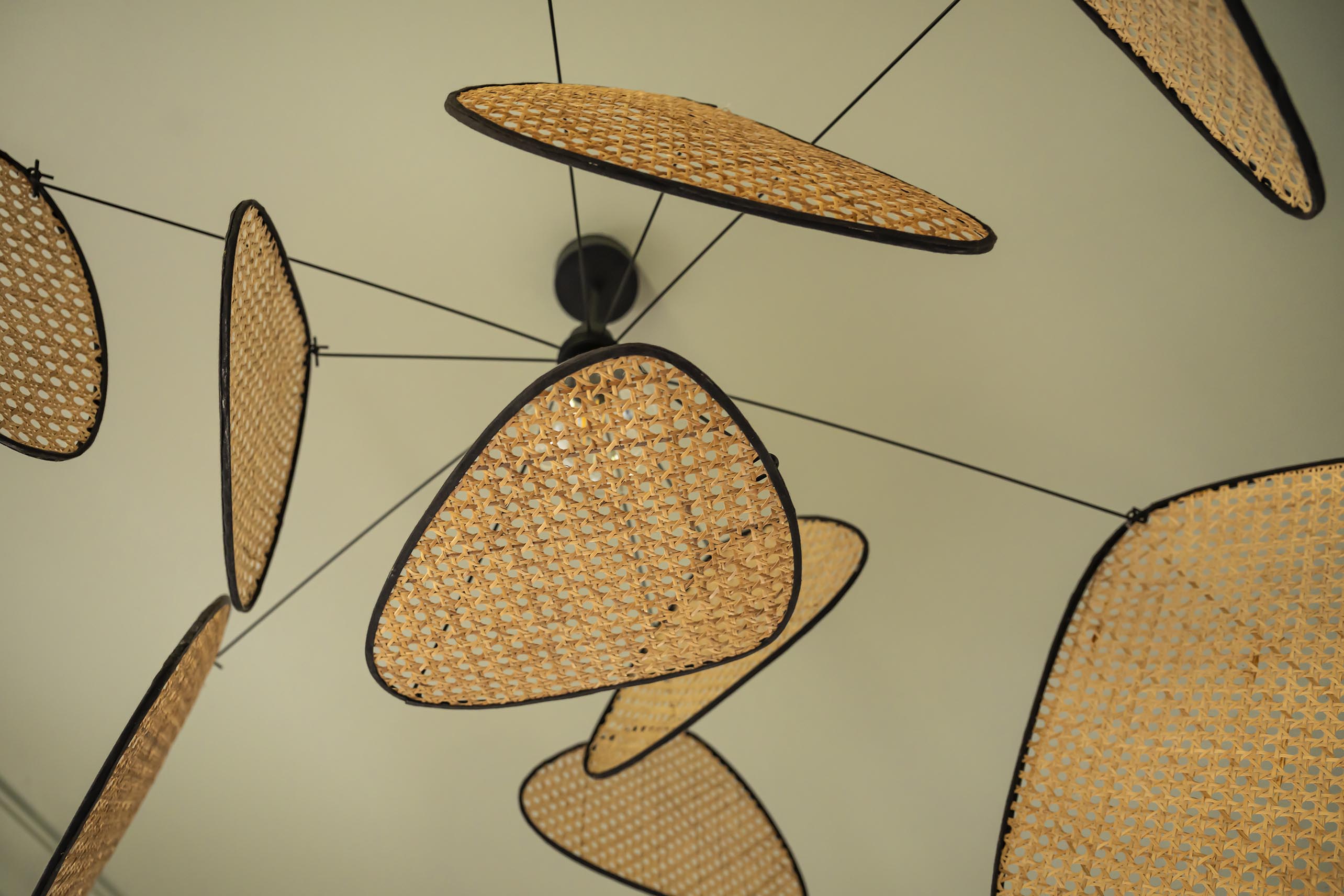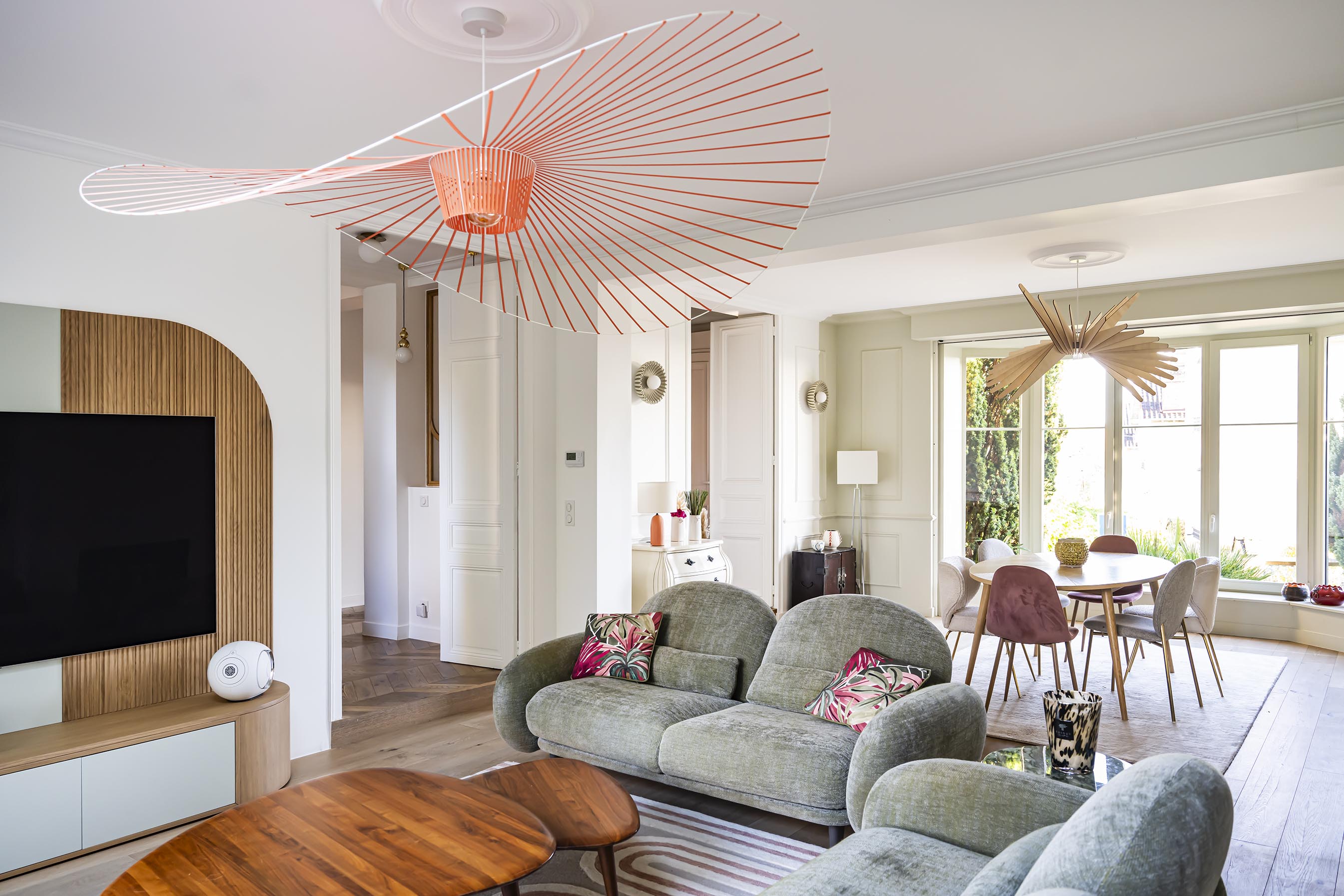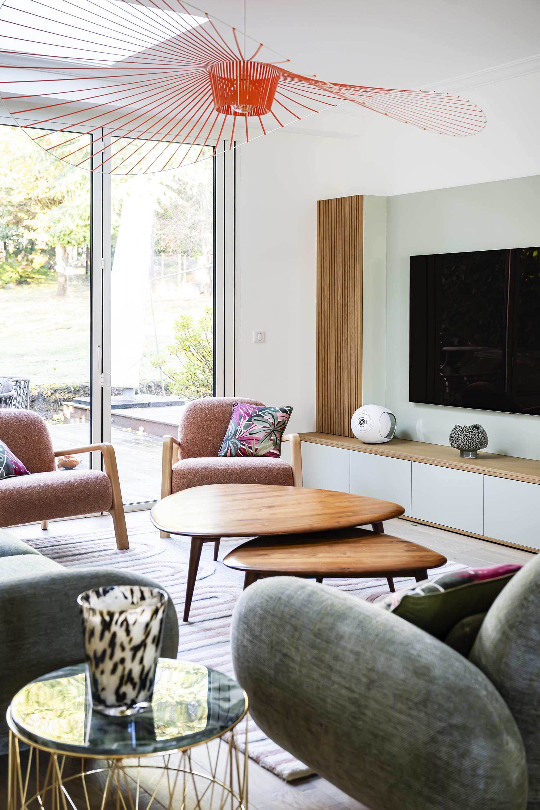 Les canapés ont été choisis en accord avec les formes et les teintes des meubles sur-mesure et nous avons choisi d’apporter un peu de contraste avec une couleur plus chaude et vive sur les 2 petits fauteuils et le tapis, sans oublier la suspension corail très aérienne qui apporte une touche design.
