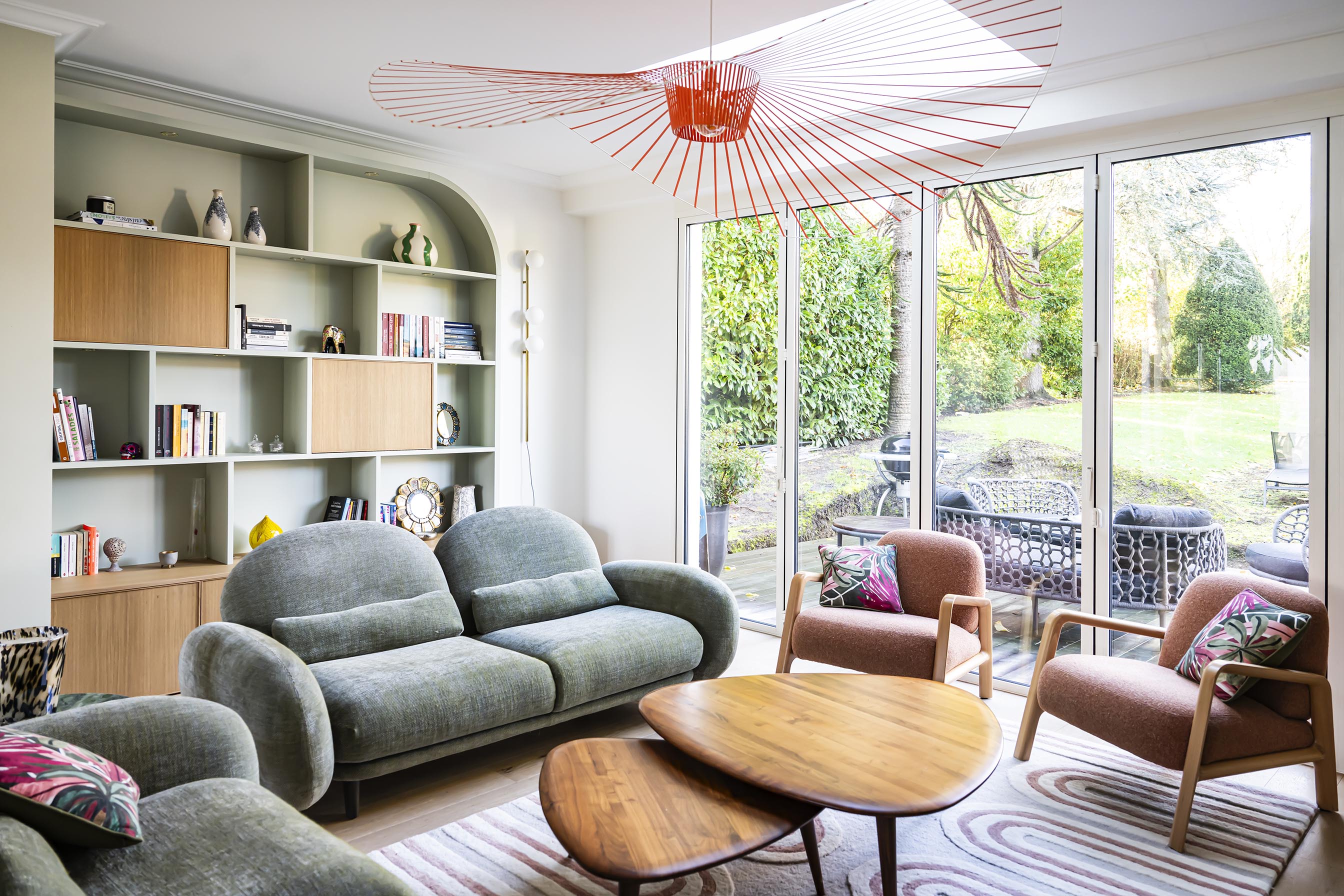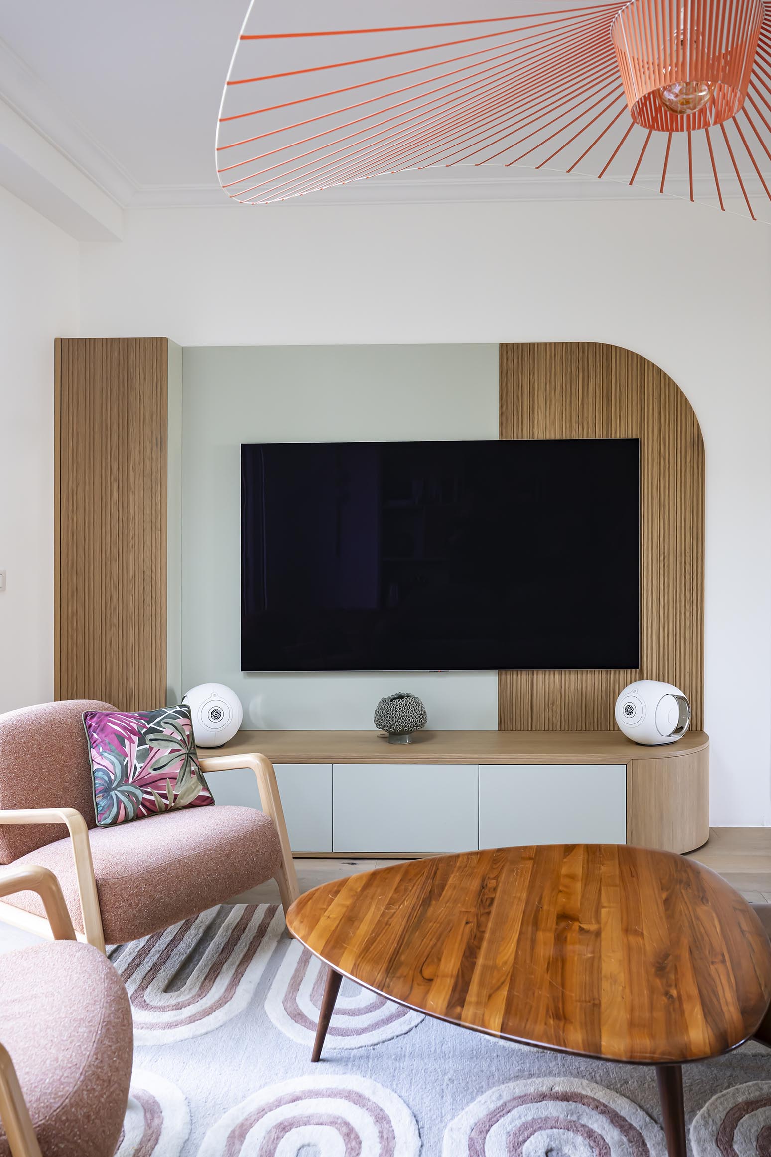 Un salon tout en courbes avec du rangement sur-mesure