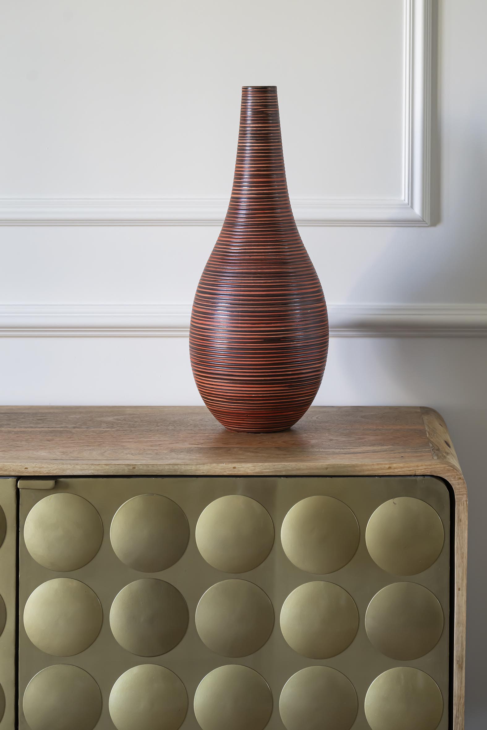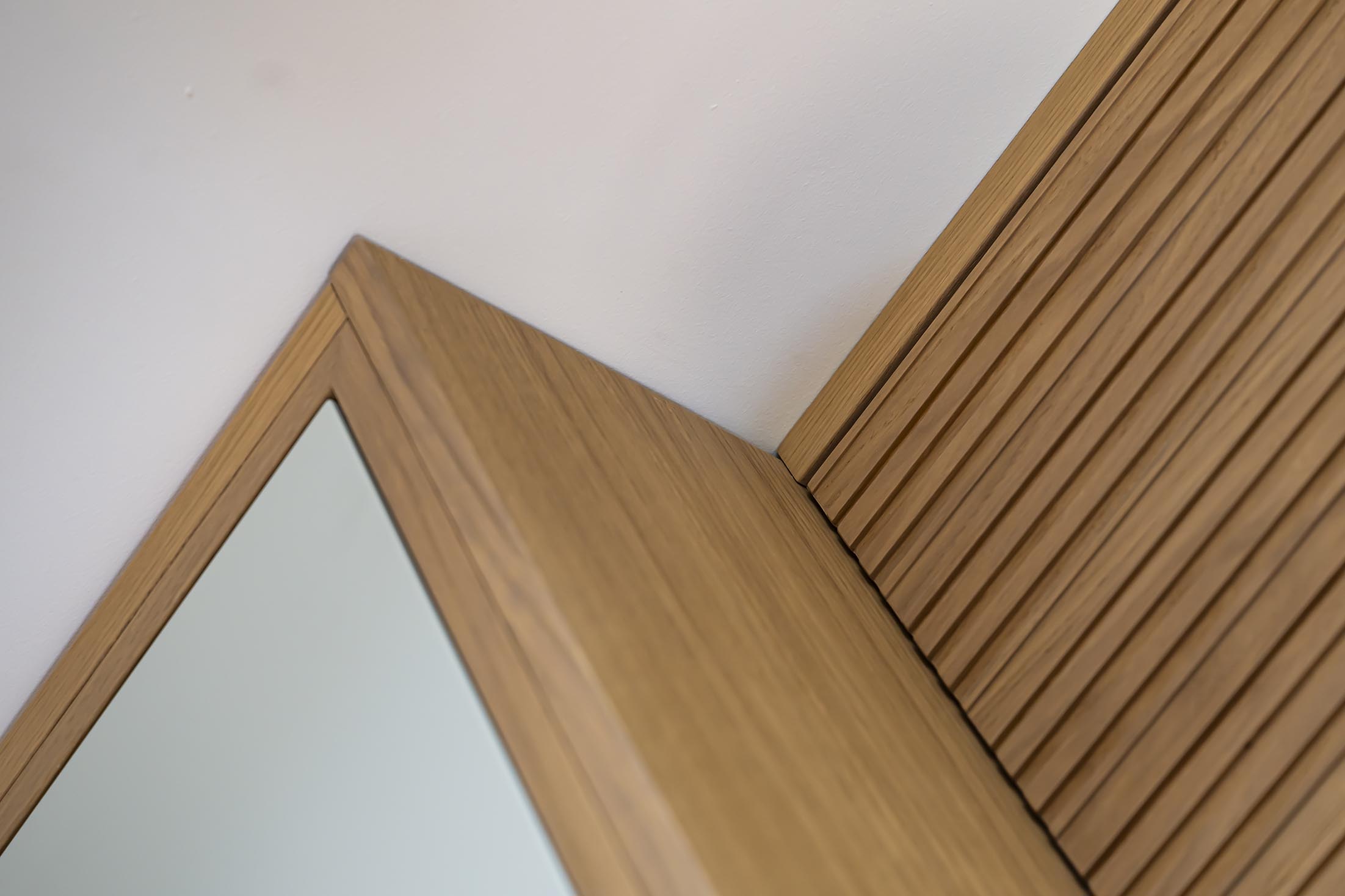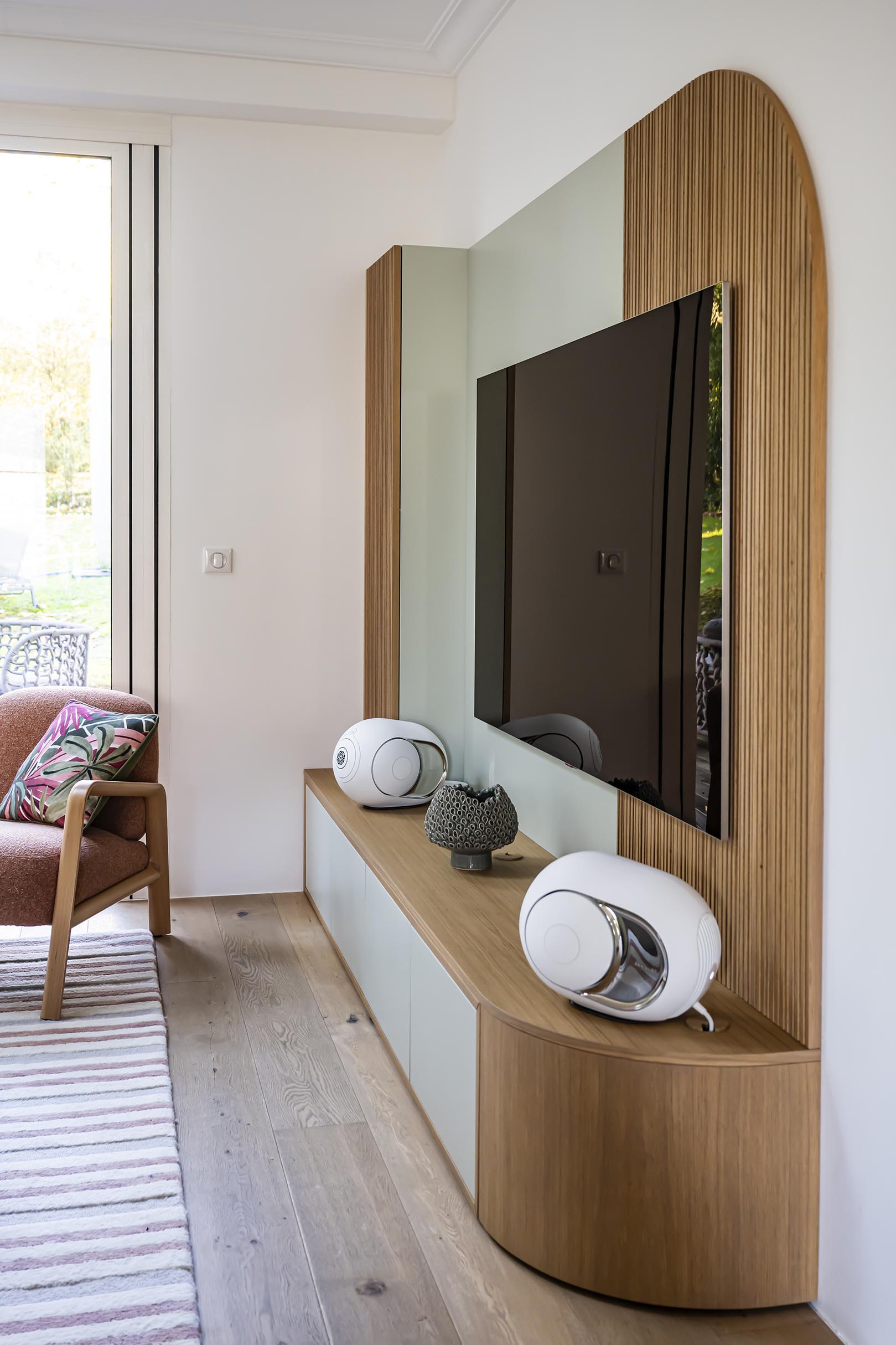 Sur le mur d’en face, le meuble TV a également été réalisé sur-mesure dans le même esprit que la bibliothèque mais avec quelques variantes pour éviter le côté trop symétrique. On a gardé les mêmes teintes et matériaux mais ajouté un panneau de bois strié