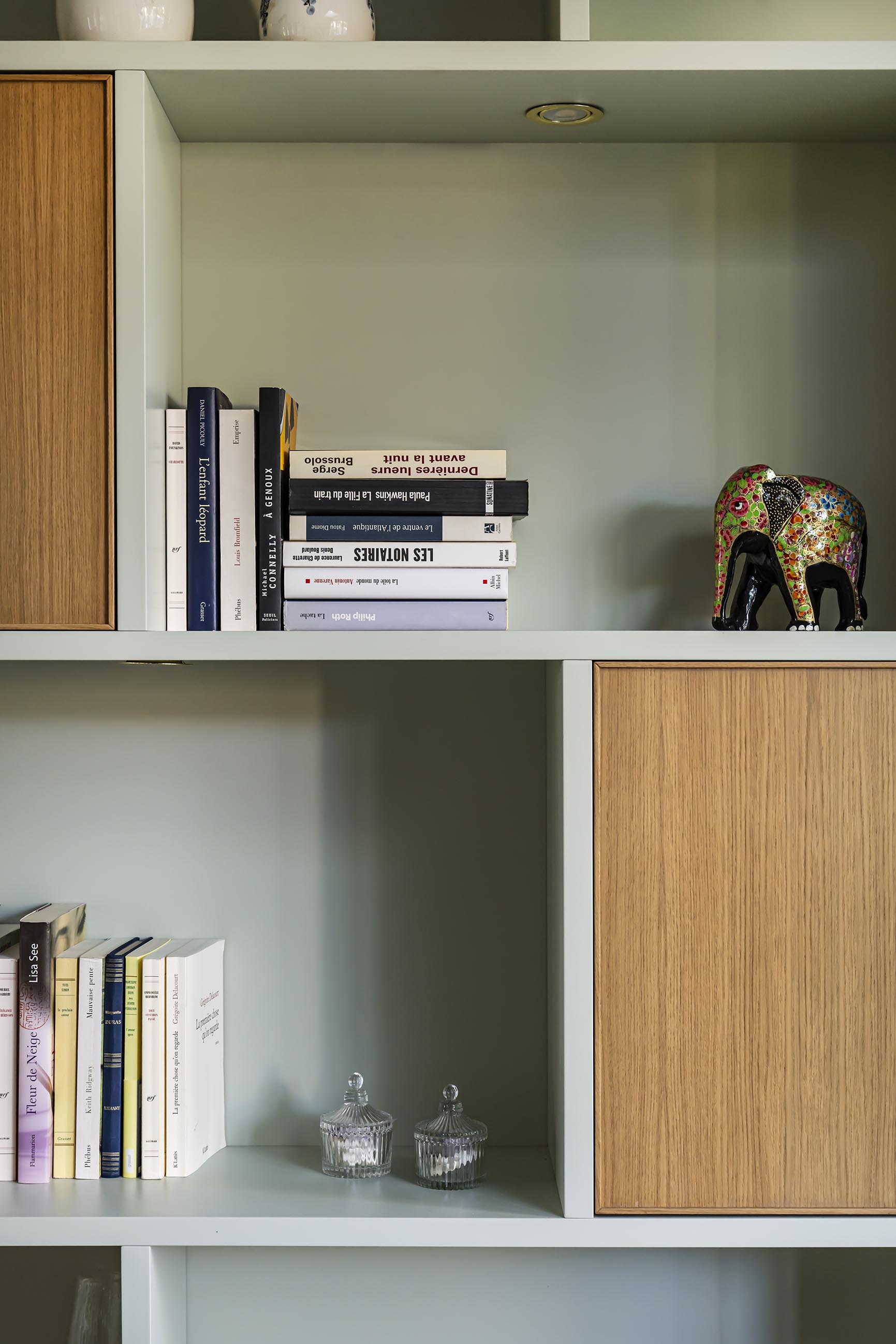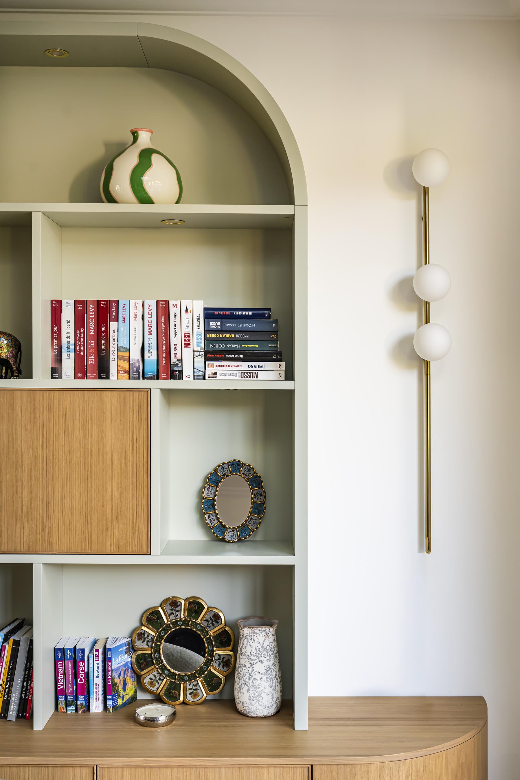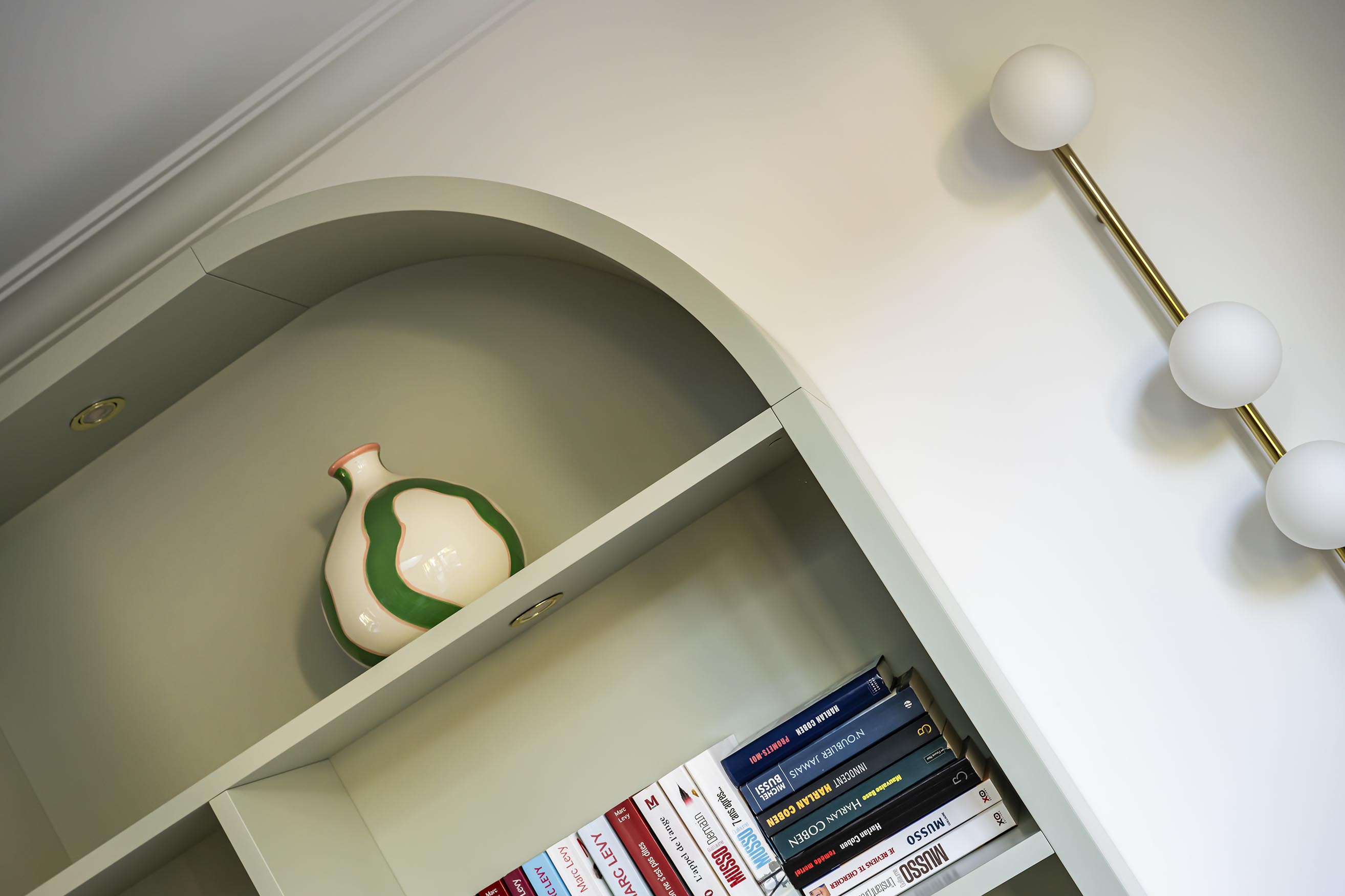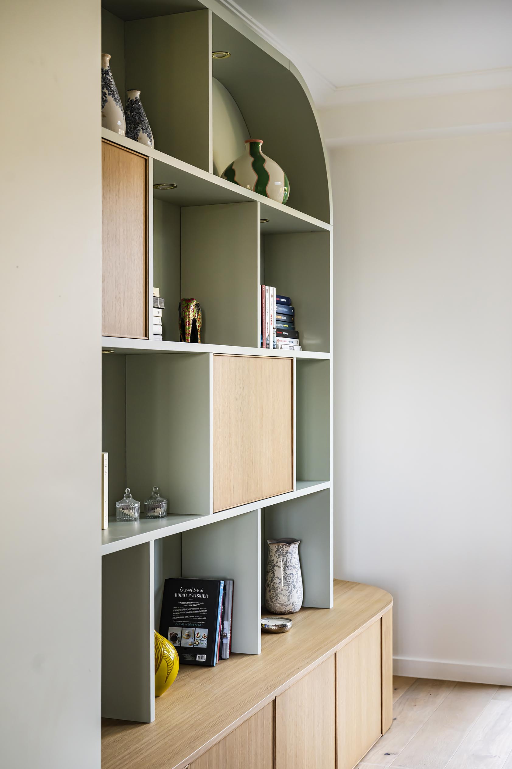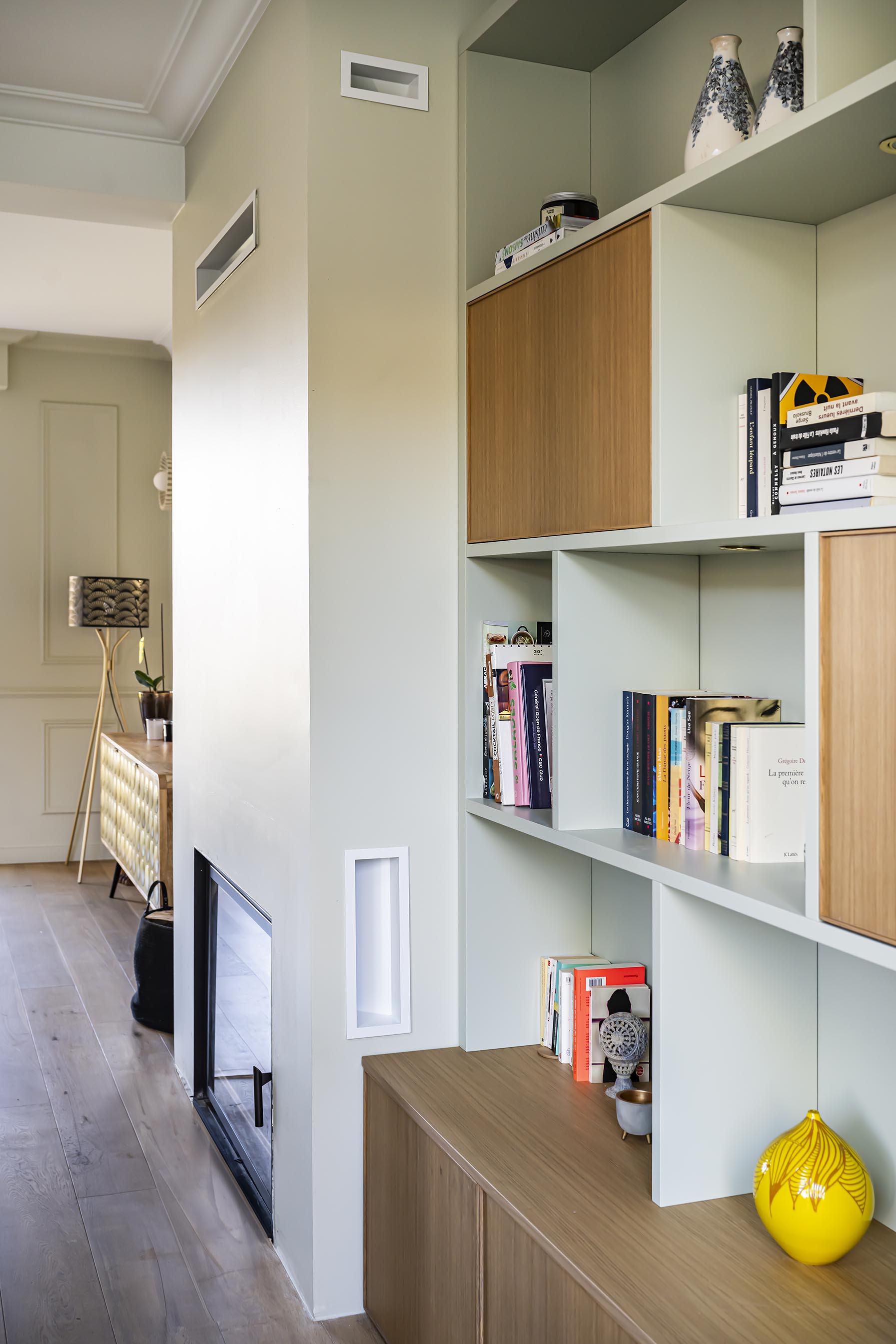 Les clients rêvaient d’une bibliothèque sur-mesure et de retrouver la douceur et la convivialité d’une cheminée. Nous avons recréé un insert à partir de l’ancien conduit existant et, afin d’intégrer la nouvelle cheminée dans le salon comme si elle avait toujours été là, j’ai proposé de prolonger une partie du coffrage en bibliothèque asymétrique cintrée côté jardin, dans une alliance de placage vert de gris et bois. Elle alterne entre rangements ouverts et fermés, pour combiner légèreté et fonctionnalité.