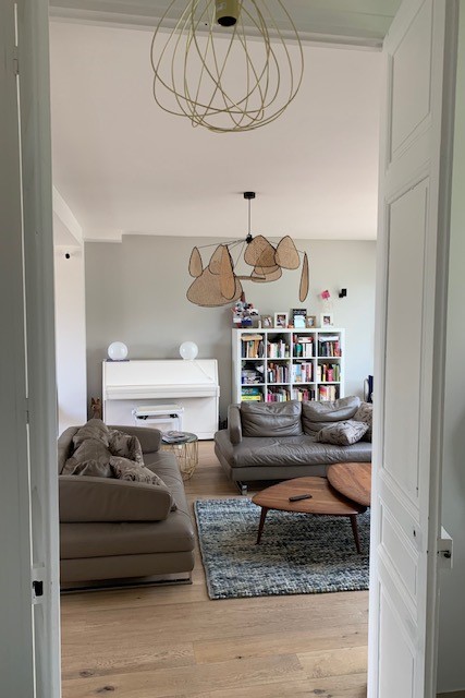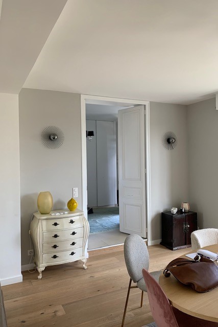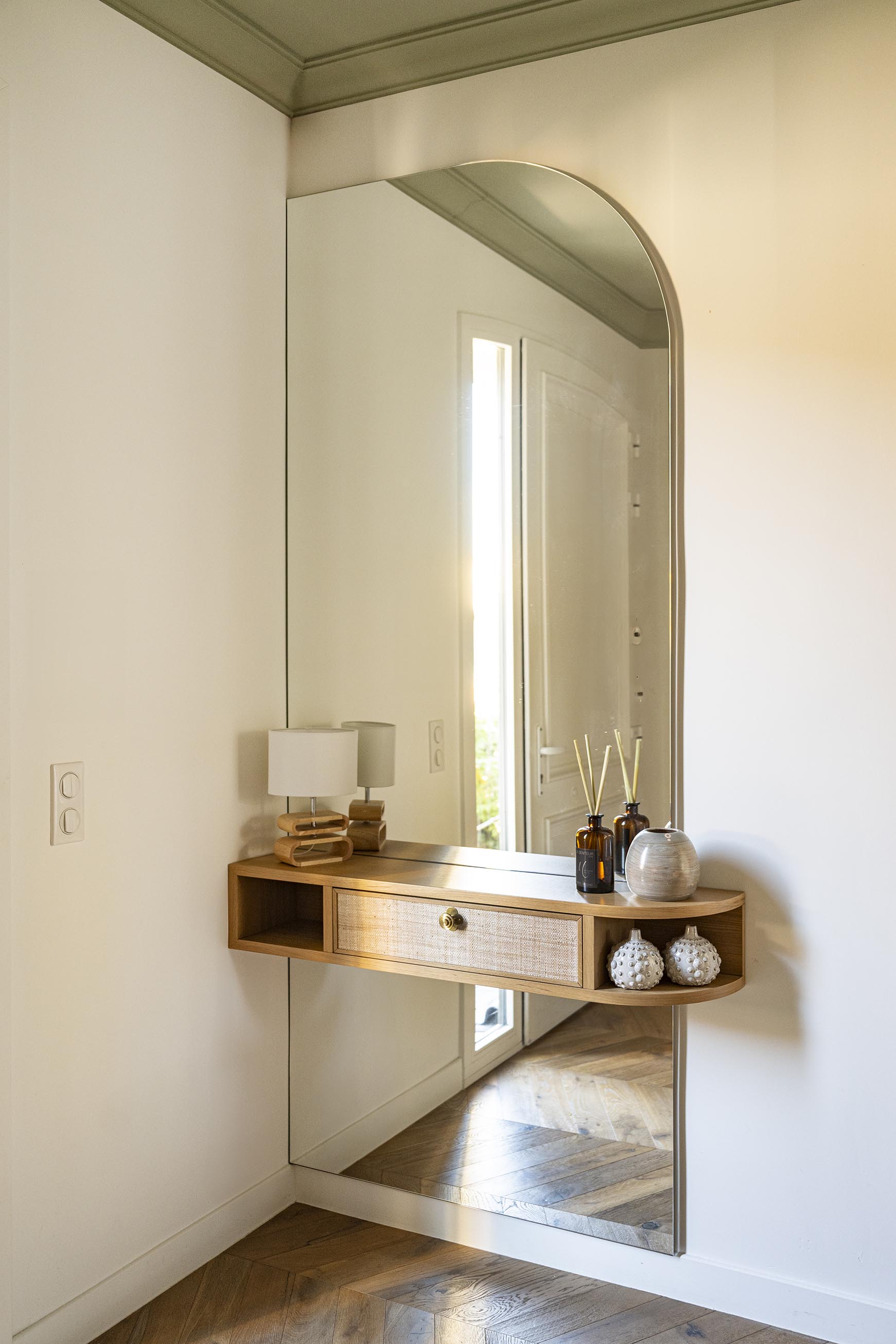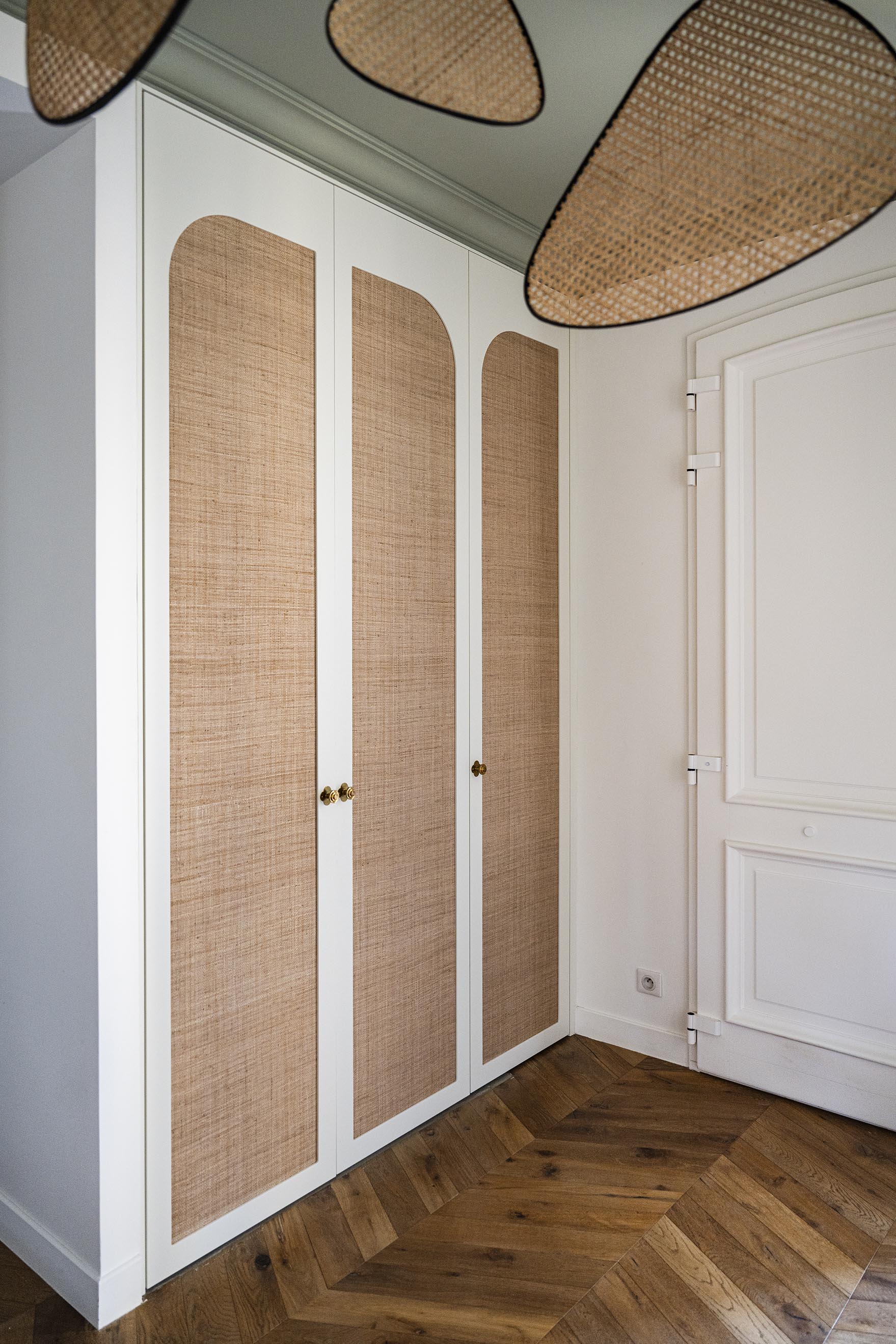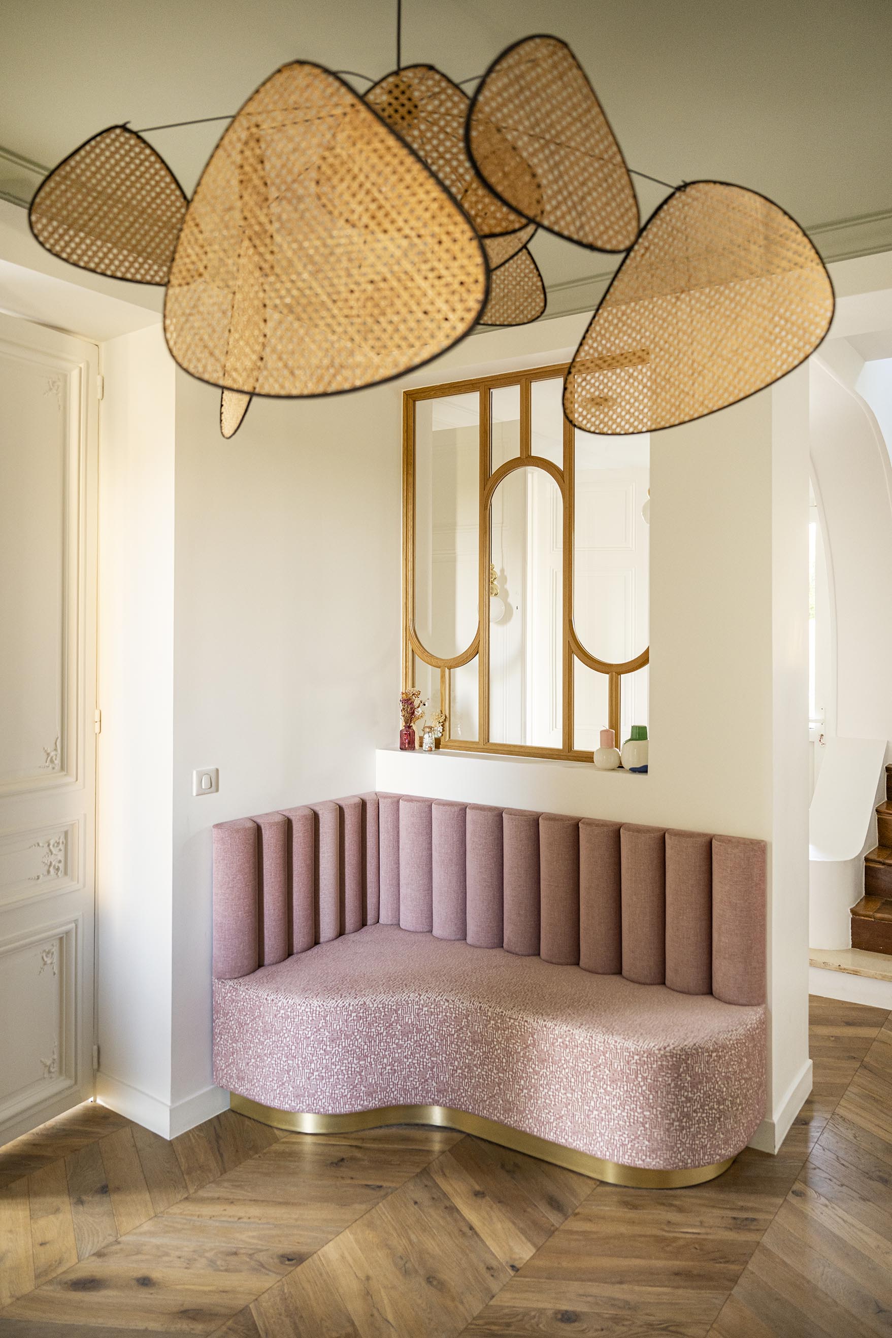 L’entrée est loin d’être la pièce la plus grande dans un logement même si celle-ci est plutôt spacieuse mais c’est elle qui donne la première impression et elle est souvent négligée : pas ici ! Un énorme travail a été fait sur cette pièce : nouveau parquet point de Hongrie en lieu et place de l’ancien carrelage grisé, ajout de moulures, ouverture du mur porteur pour l’insertion d’une verrière en chêne cintré, création d’une banquette sur-mesure tapissée et soulignée d’une plinthe en laiton face à la porte d’entrée. A gauche, une console suspendue, comme en lévitation sur son miroir arrondi. A droite, le placard basique s’est transformé en un élément de décoration avec ses jolies portes sur-mesure incrustées de raphia et parées de poignées en laiton design, que l’on retrouve sur la console d’ailleurs. Pour mettre en valeur ce beau volume et la hauteur sous plafond, j’ai proposé de peindre le plafond en vert et d’y installer une suspension légère mais volumineuse, que les clients possédaient déjà mais dans le salon. Le fil conducteur : le charme et les courbes avec de petites touches Art déco dans le choix des tissus de la banquette et du laiton (boutons de meubles, plinthe, suspensions derrière la verrière).