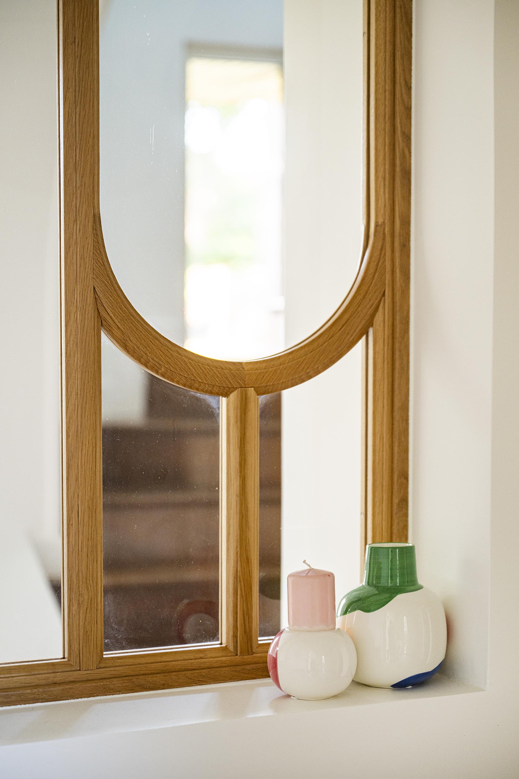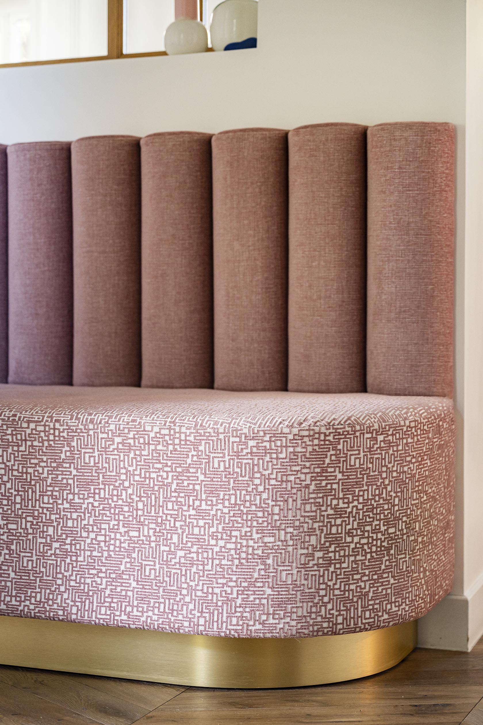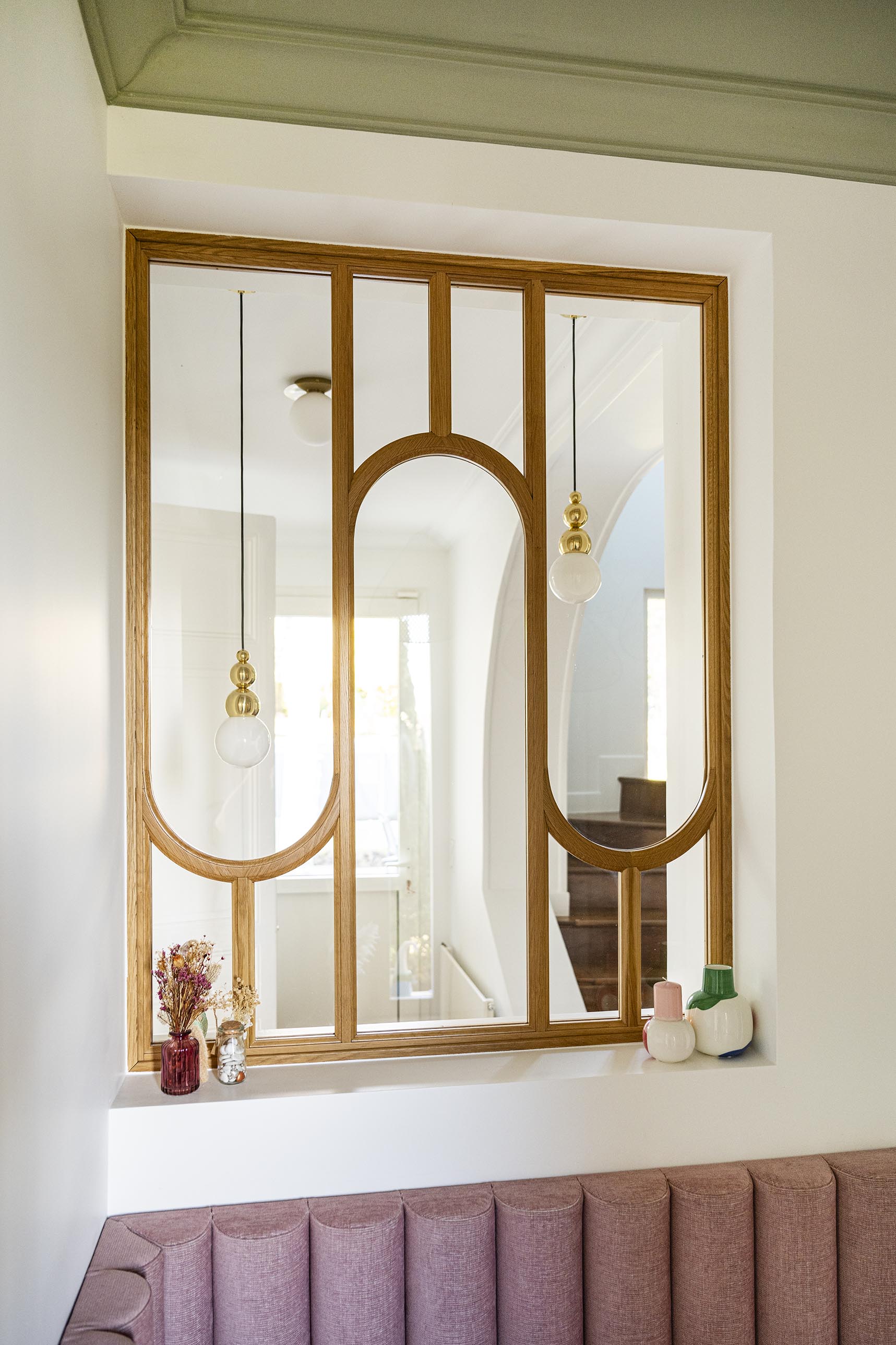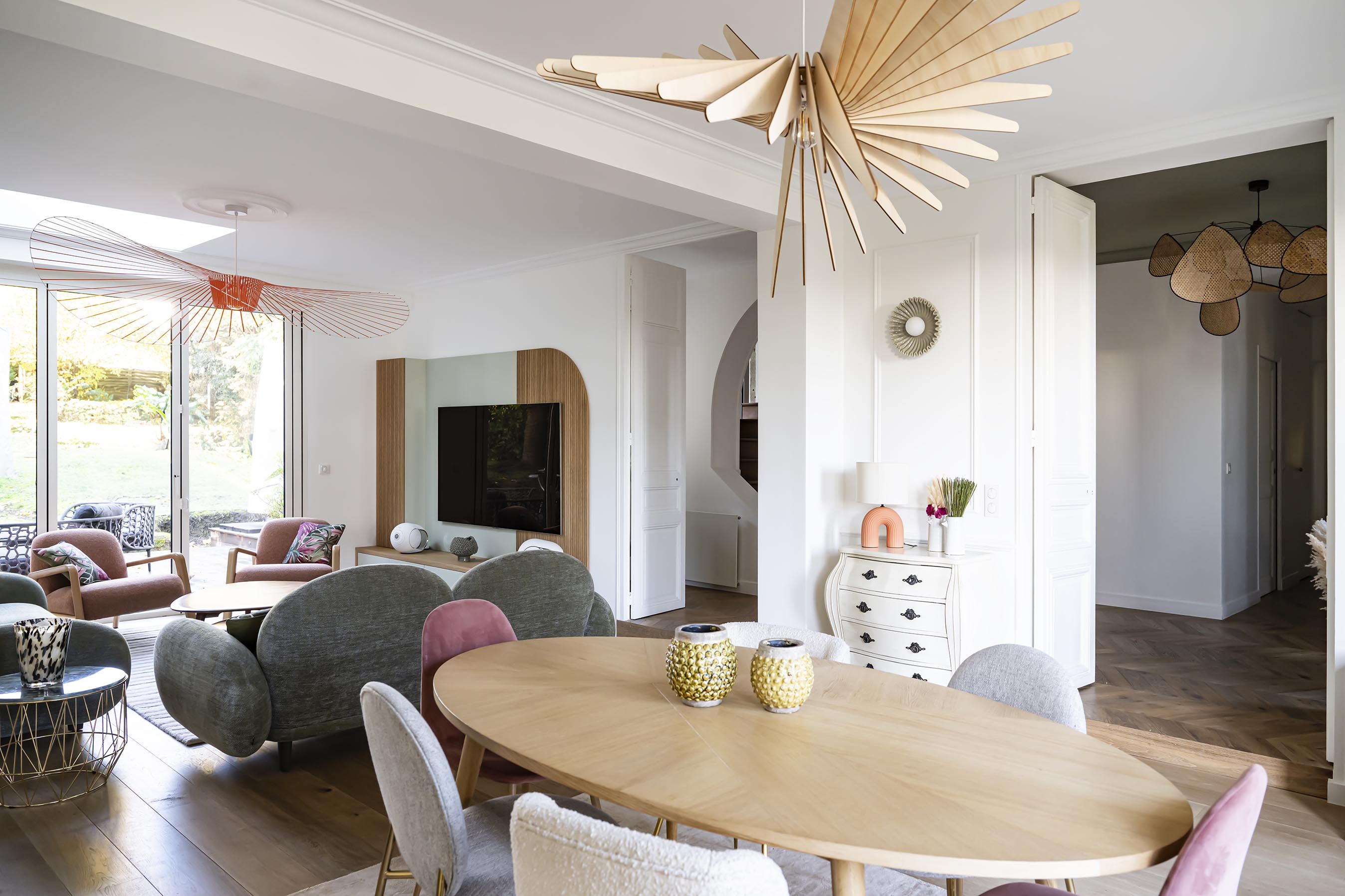 L’entrée est loin d’être la pièce la plus grande dans un logement même si celle-ci est plutôt spacieuse mais c’est elle qui donne la première impression et elle est souvent négligée : pas ici ! Un énorme travail a été fait sur cette pièce : nouveau parquet point de Hongrie en lieu et place de l’ancien carrelage grisé, ajout de moulures, ouverture du mur porteur pour l’insertion d’une verrière en chêne cintré, création d’une banquette sur-mesure tapissée et soulignée d’une plinthe en laiton face à la porte d’entrée. A gauche, une console suspendue, comme en lévitation sur son miroir arrondi. A droite, le placard basique s’est transformé en un élément de décoration avec ses jolies portes sur-mesure incrustées de raphia et parées de poignées en laiton design, que l’on retrouve sur la console d’ailleurs. Pour mettre en valeur ce beau volume et la hauteur sous plafond, j’ai proposé de peindre le plafond en vert et d’y installer une suspension légère mais volumineuse, que les clients possédaient déjà mais dans le salon. Le fil conducteur : le charme et les courbes avec de petites touches Art déco dans le choix des tissus de la banquette et du laiton (boutons de meubles, plinthe, suspensions derrière la verrière).